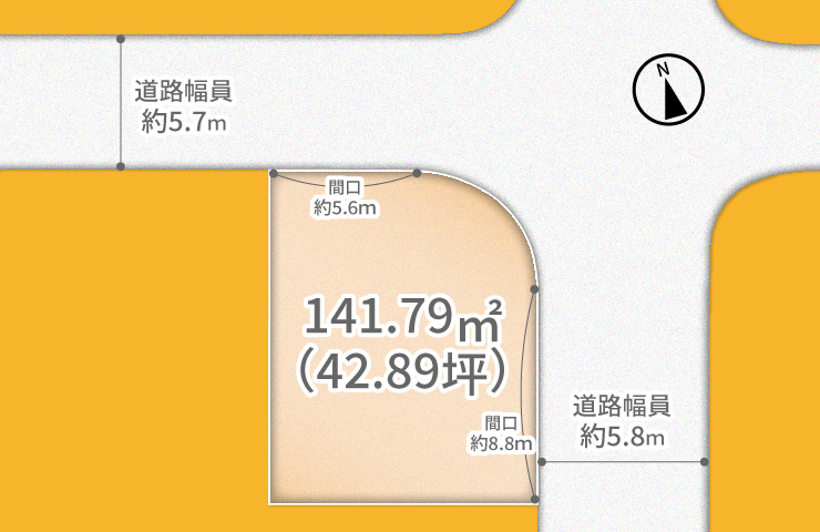| 接道幅 | 5.6m 北向き/8.8m 東向き |
