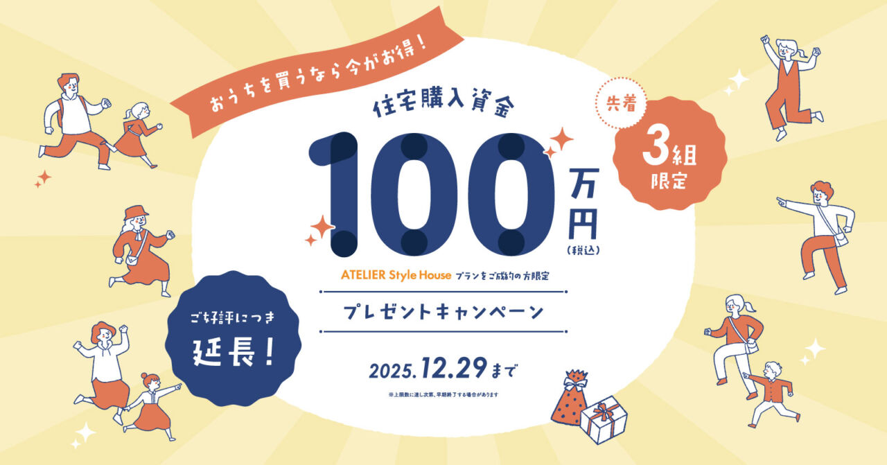 期間内に弊社と建築工事請負契約(弊社指定のアトリエスタイルハウスプラン)を結んでいただいたお客様に100万円の住宅購入資金をプレゼント!