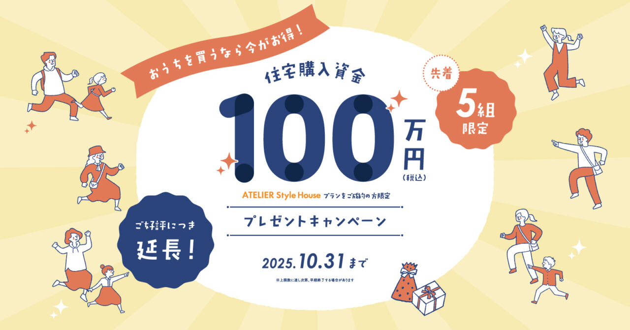 期間内にATELIER Style Houseプランをご成約いただいた方に100万円の住宅購入資金をプレゼント!