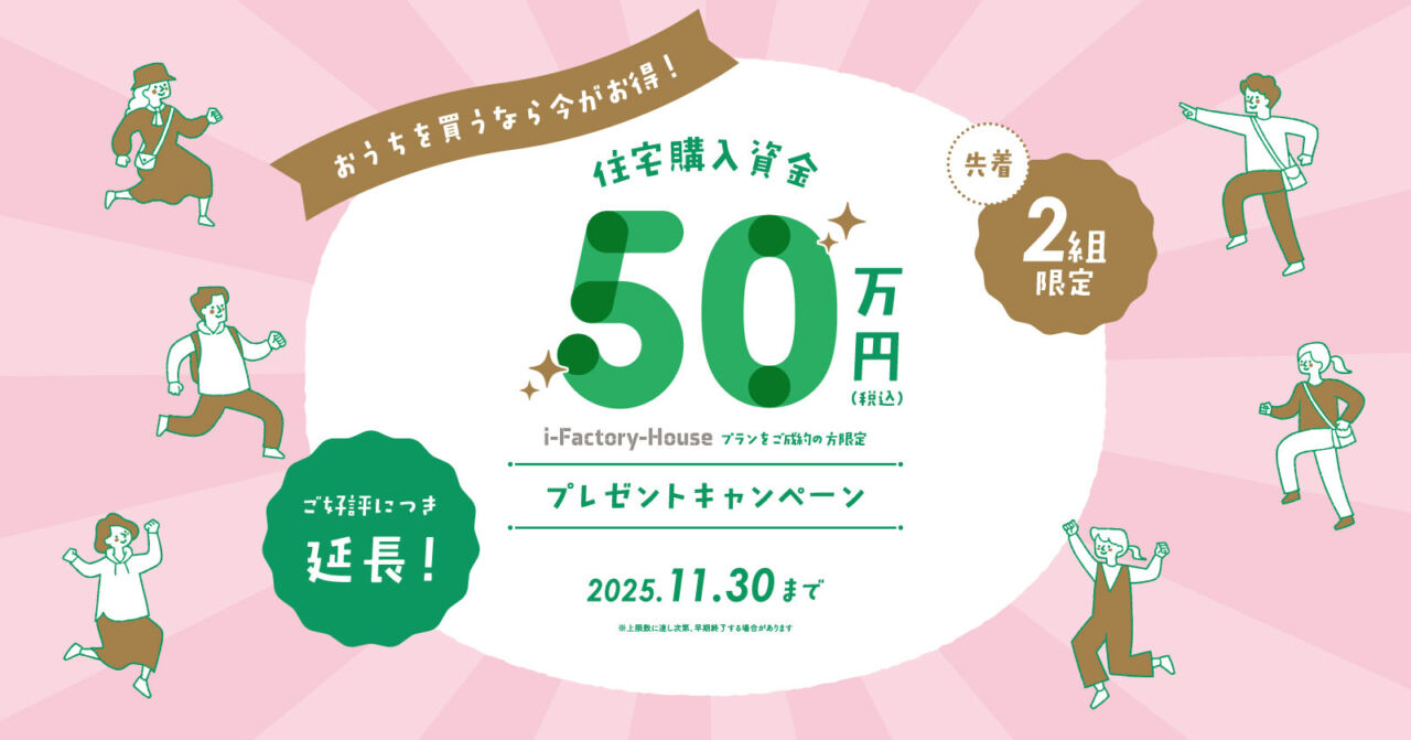 期間内に弊社と建築工事請負契約(弊社指定のアイファクトリーハウスプラン)を結んでいただいたお客様に50万円の住宅購入資金をプレゼント!