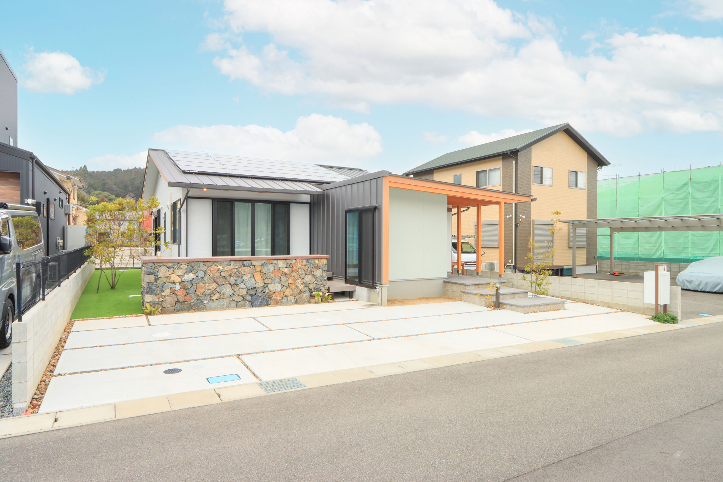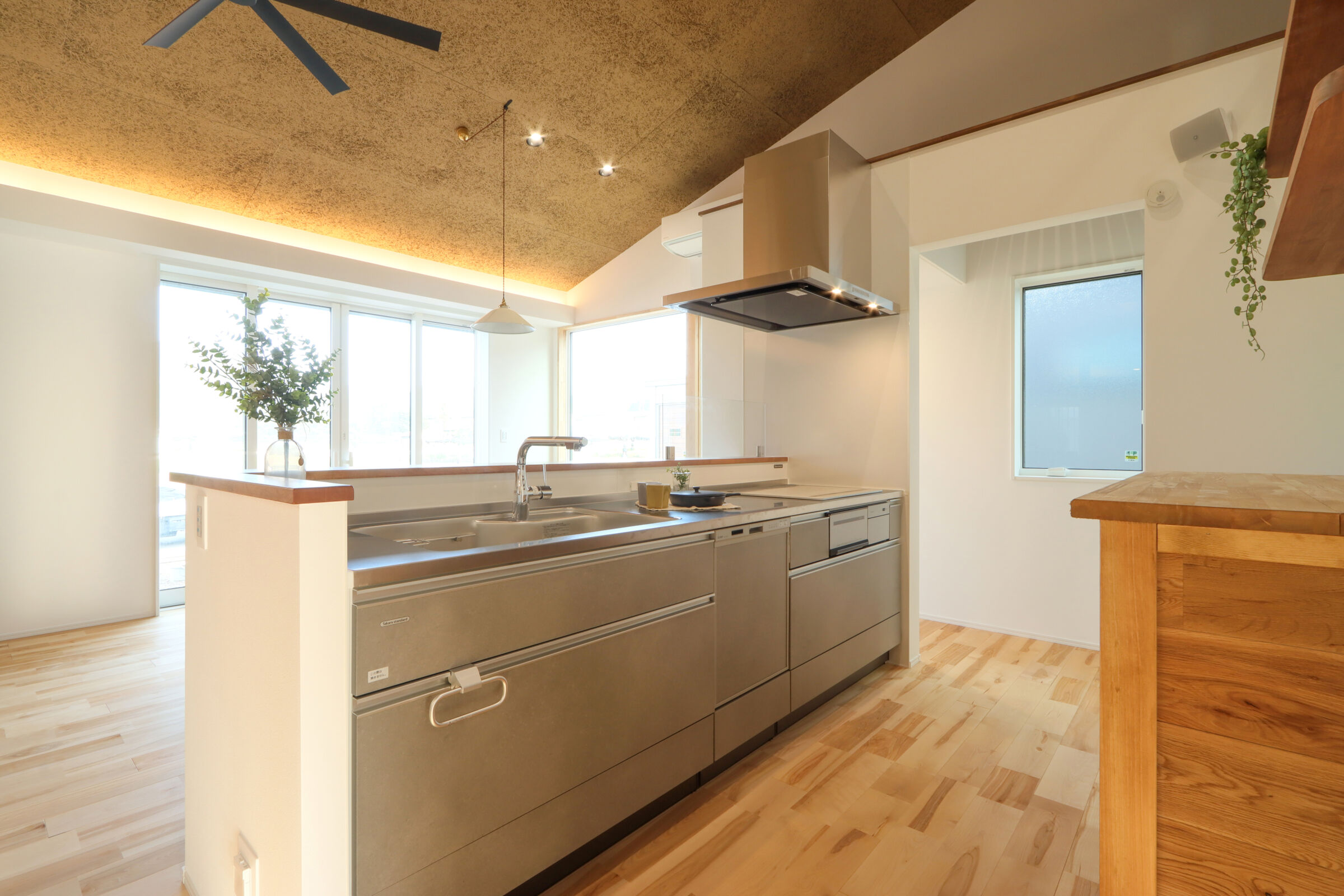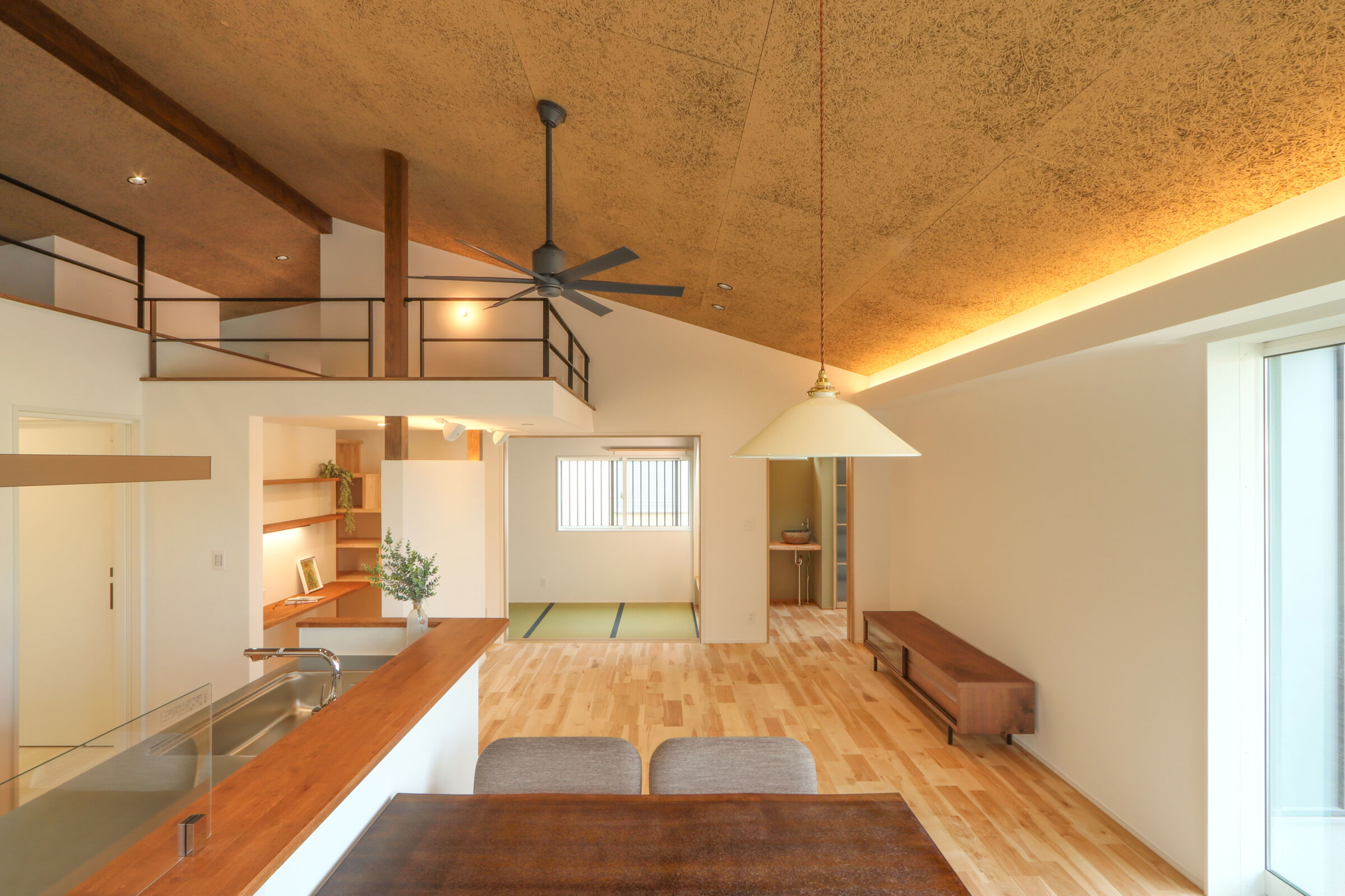 大きな窓の先に広がる景色を、日常の一部として楽しむ和モダンな平屋。無垢材や左官仕上げなど素材の表情を活かしながら、凹凸のある空間構成で奥行きと落ち着きを演出。家事動線や収納計画にも配慮し、見た目の美しさと暮らしやすさを両立した住まいです。