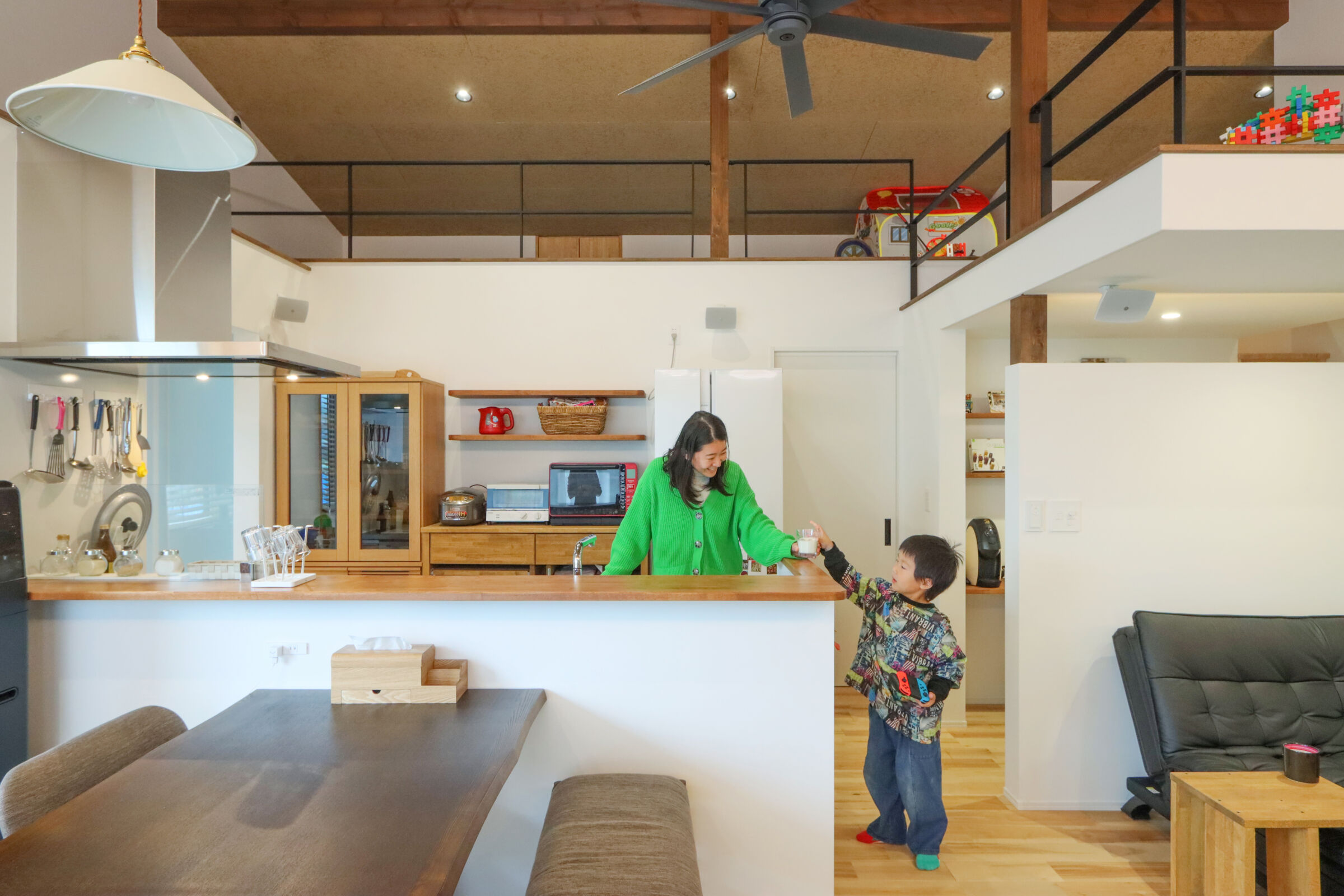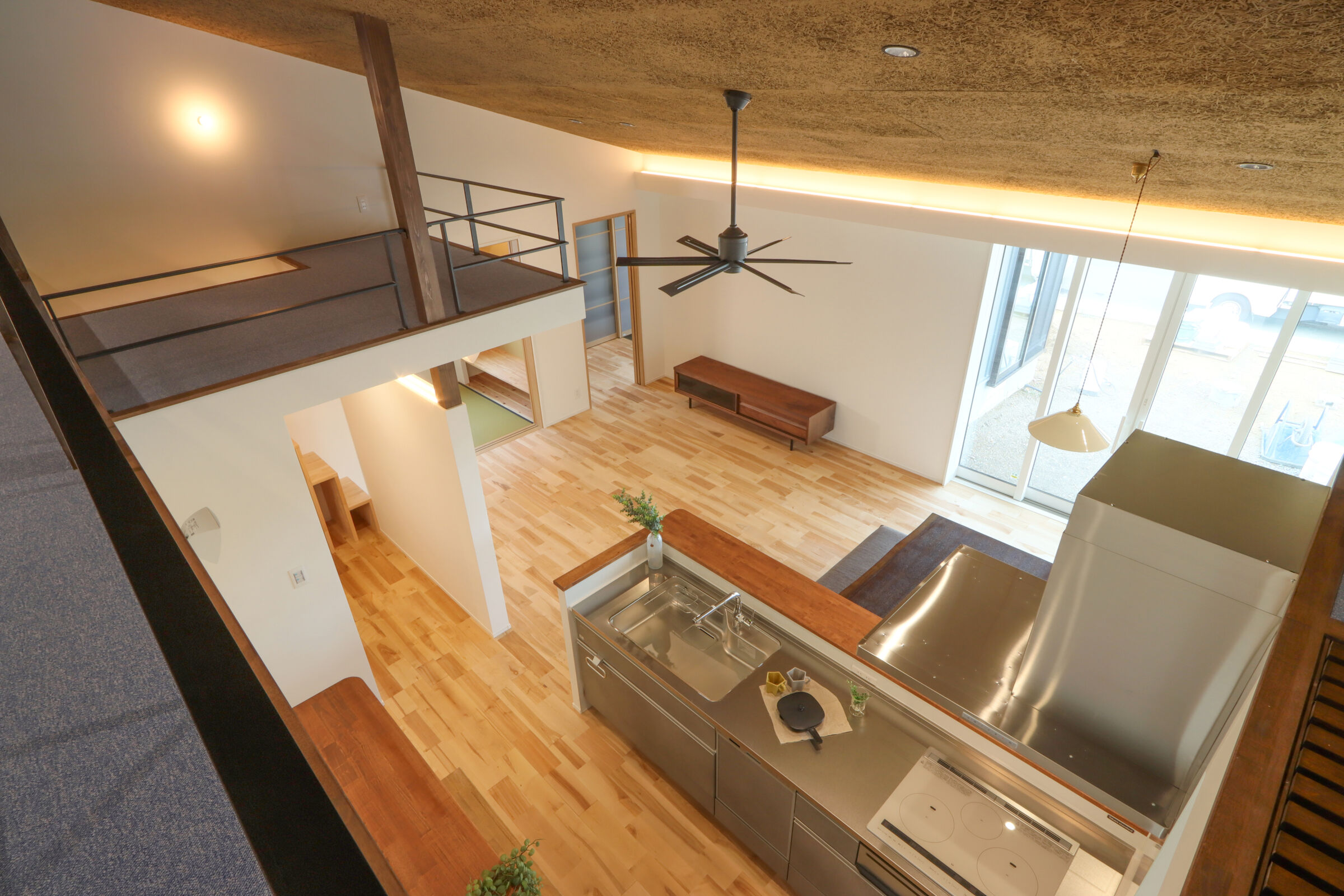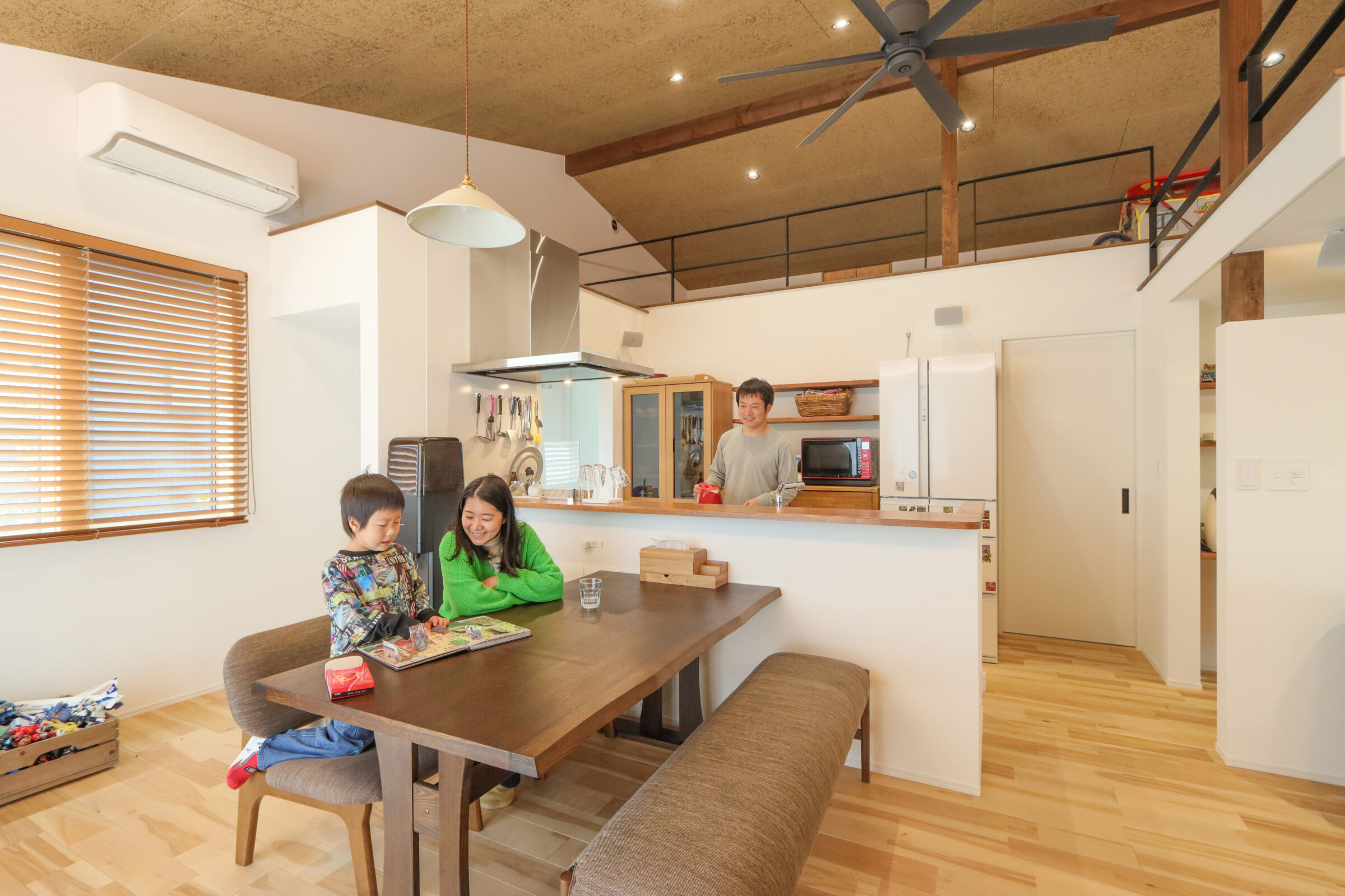 平屋ならではの伸びやかな空間を活かすため、リビングに大きな開口を設け、外とのつながりを大切にしました。