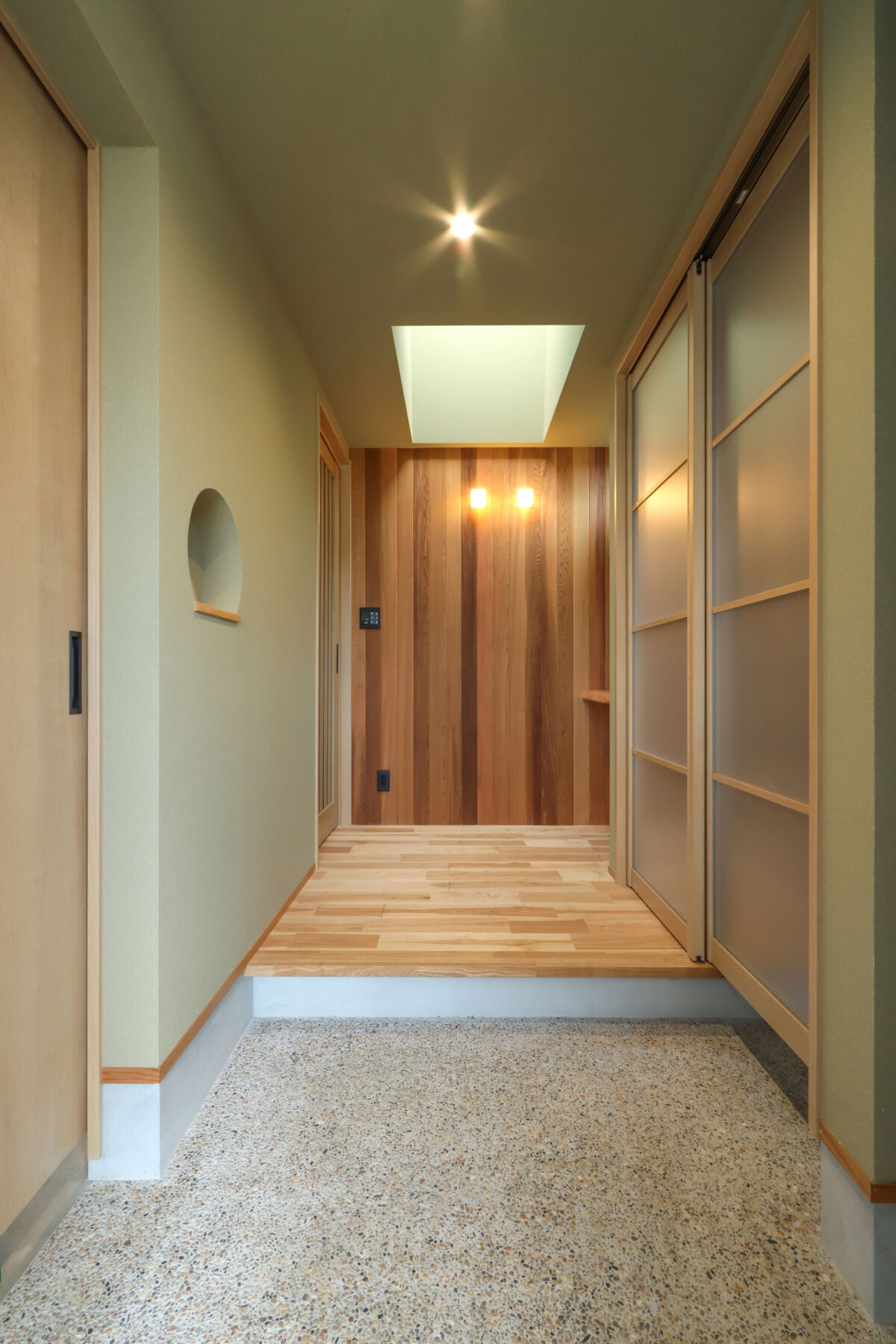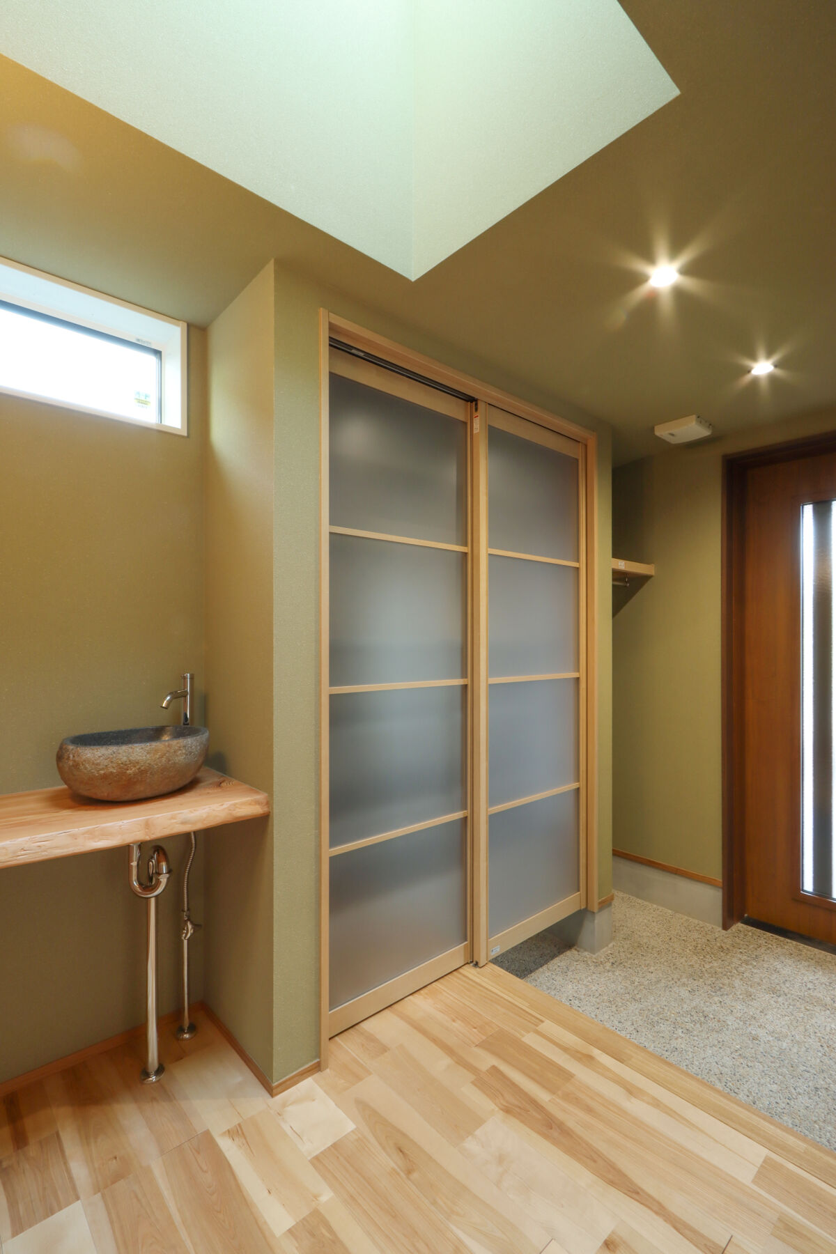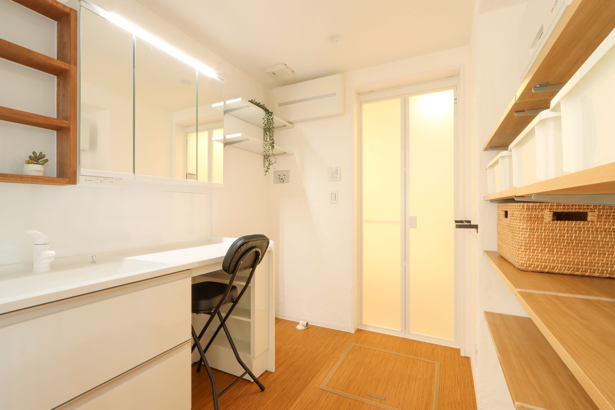 あえて室内に凹凸をつくることで、視線の抜けや奥行き感が生まれ、コンパクトながらも広がりを感じられる設計にしています。水回りは回遊動線とし、洗面・キッチン・サンルームをスムーズに行き来できる、毎日の家事が楽になる間取りを意識しました。