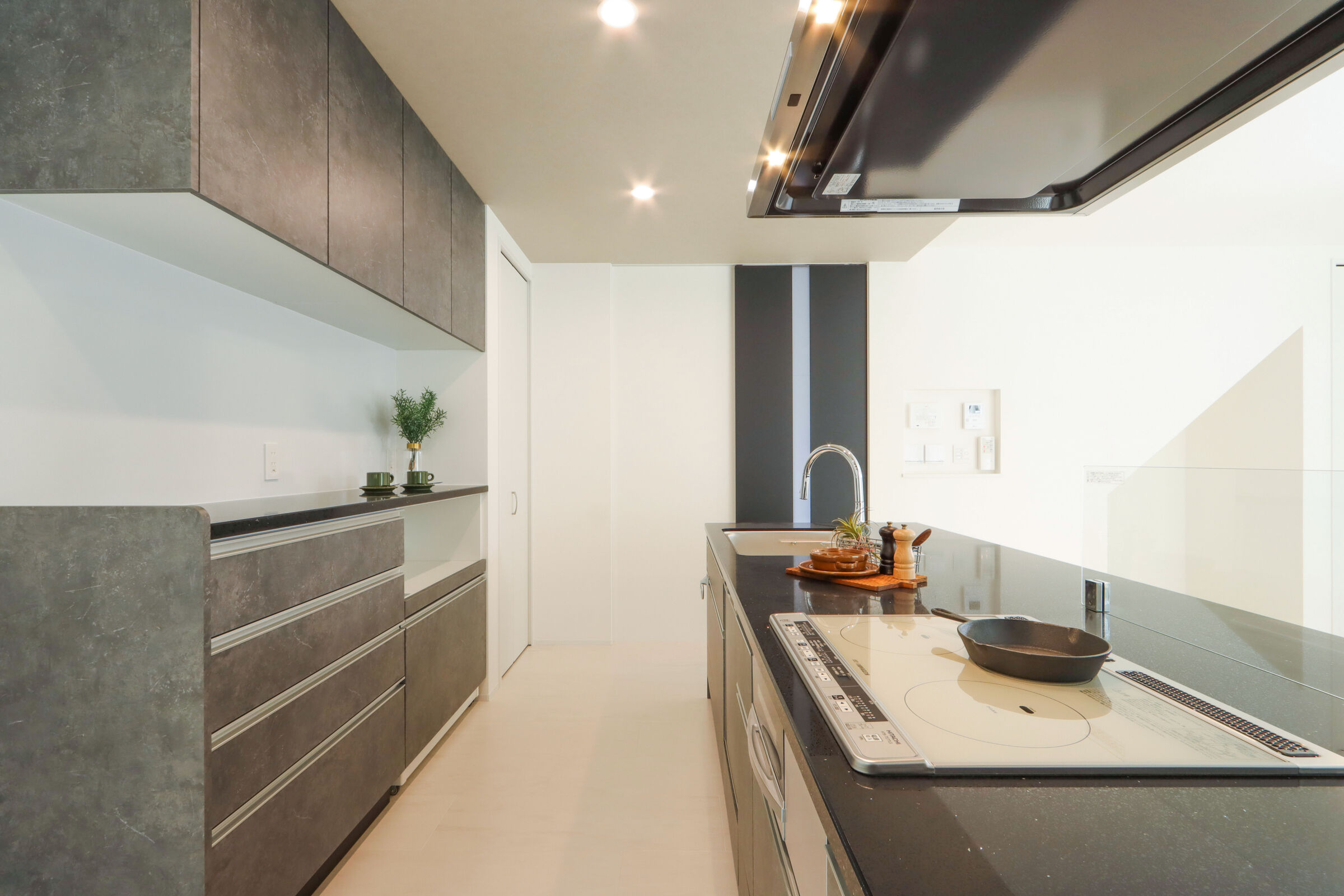 天然石の質感を活かした外観と、回遊動線で暮らしやすさを高めたストーンモダンスタイルの住まい。立地を活かし、LDKは南東・南西の大開口から光を取り込む明るい空間に。白基調の床とブラックのアクセントで上質な空間に仕上げました。2階は全室南向き+ファミリークロークを備え、機能性とデザイン性を両立しています。センターキッチンを軸にした回遊動線で家事効率も向上しました。