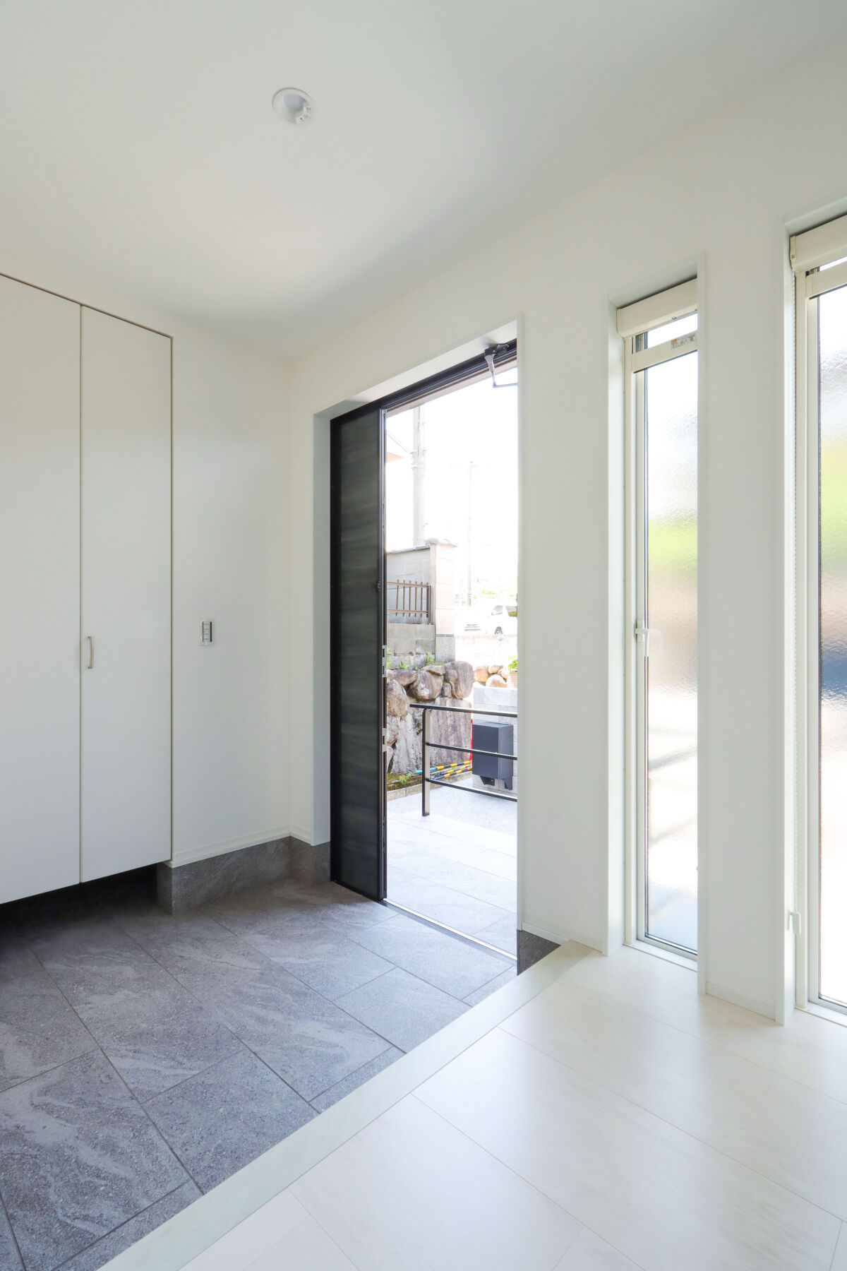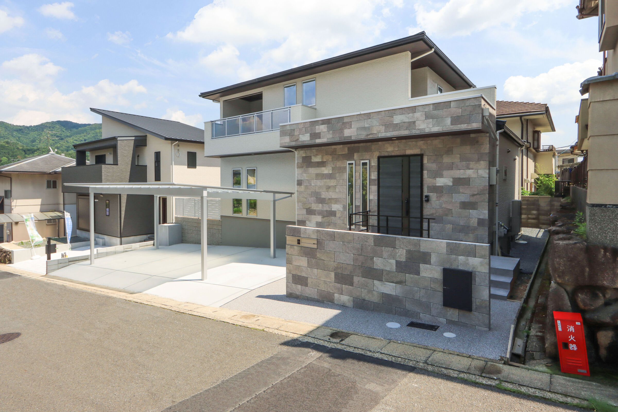 外観も内装と統一感を持たせたモダンなスタイルに仕上げました。外壁と外構塀はストーンズタイルで統一し、重厚感のあるファサードに。リアルな天然石柄が表情豊かに彩ります。クリアパネルのワイドバルコニーで抜け感を持たせました。
