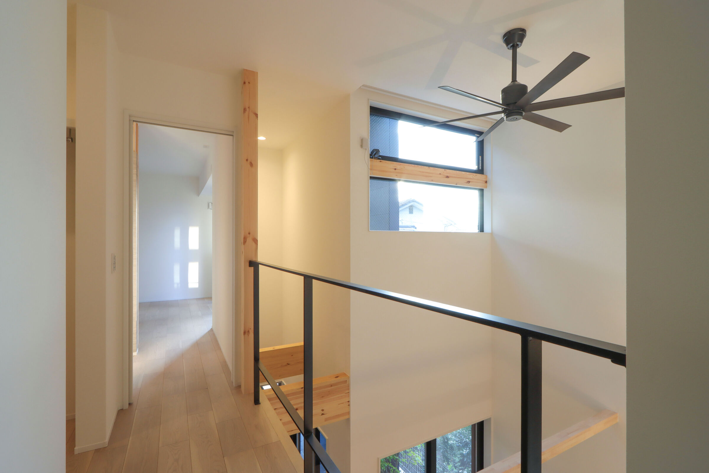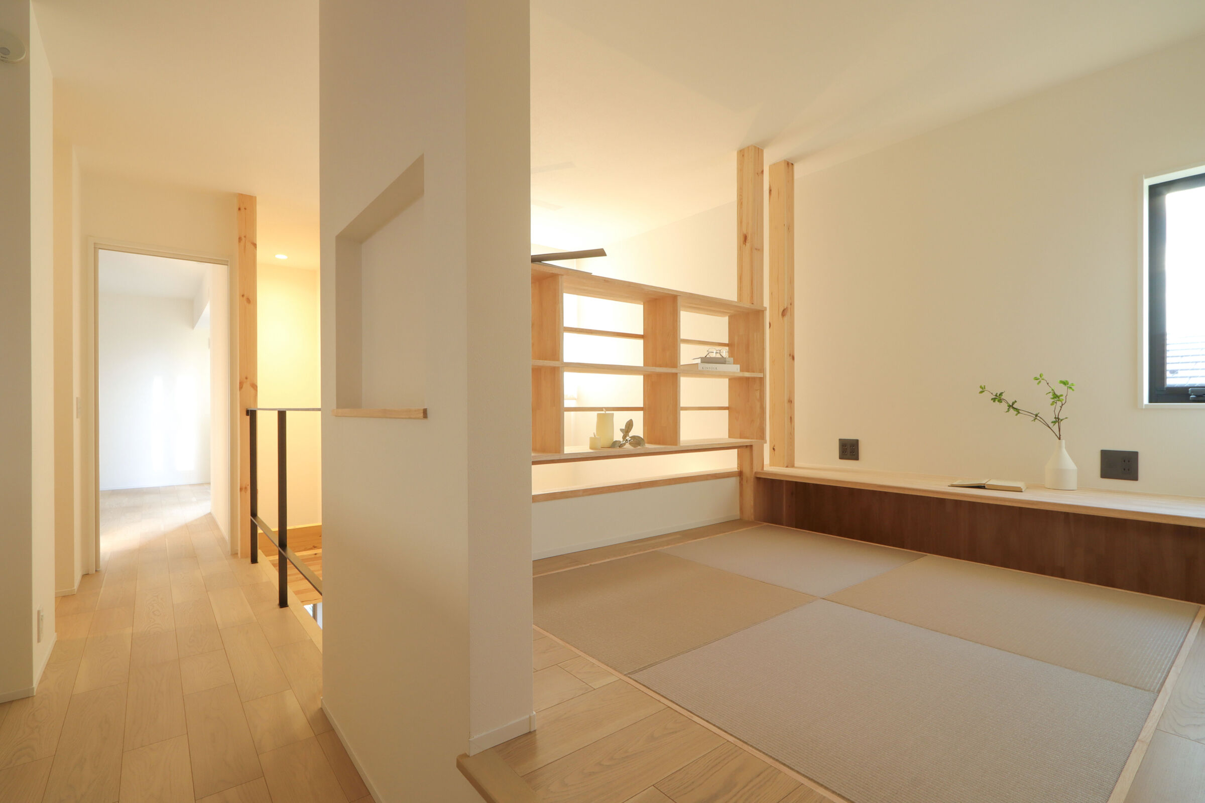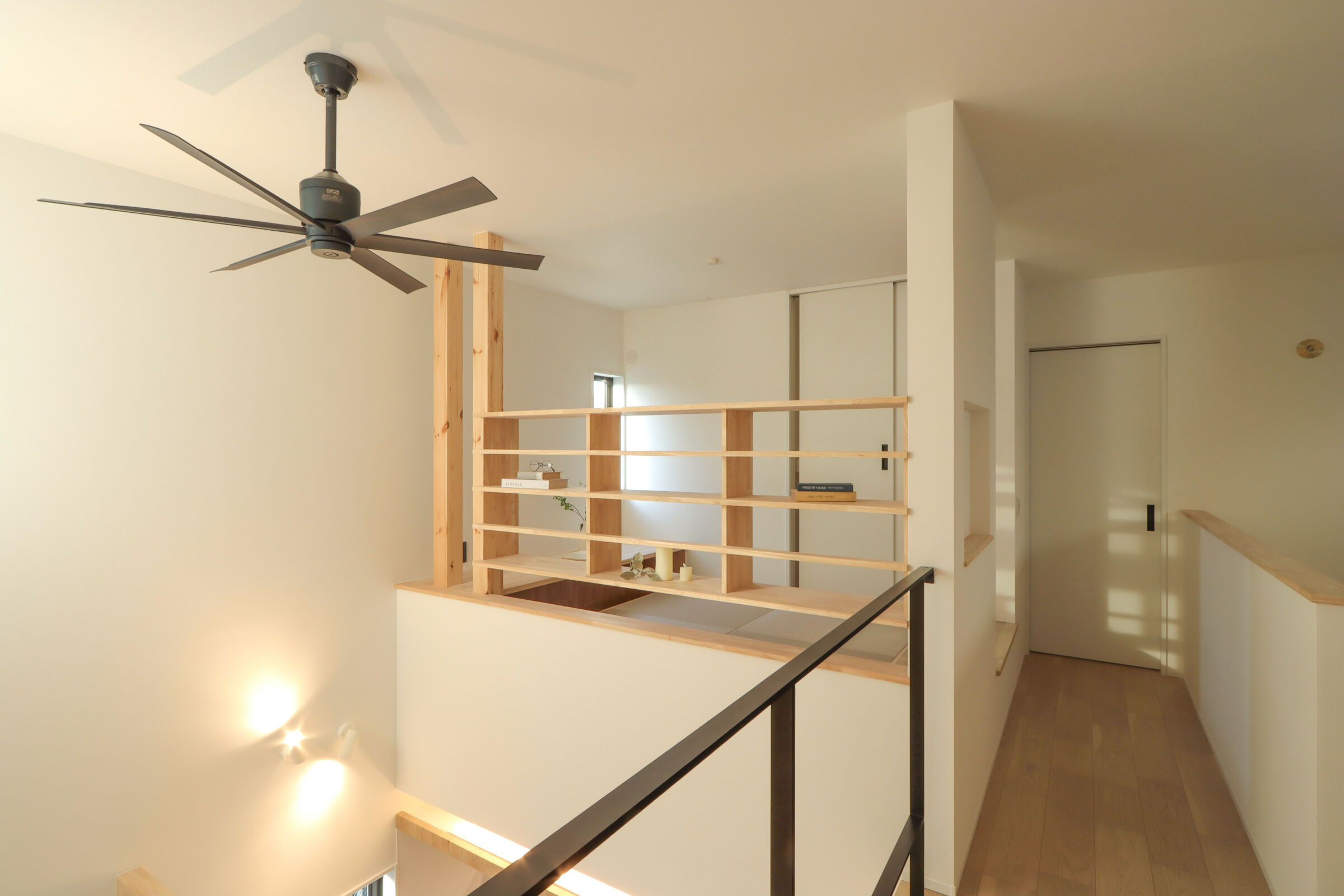 また、吹抜けに面した格子はLDKとのつながりを保ちつつ、書斎側では本棚として使えるよう計画しました。