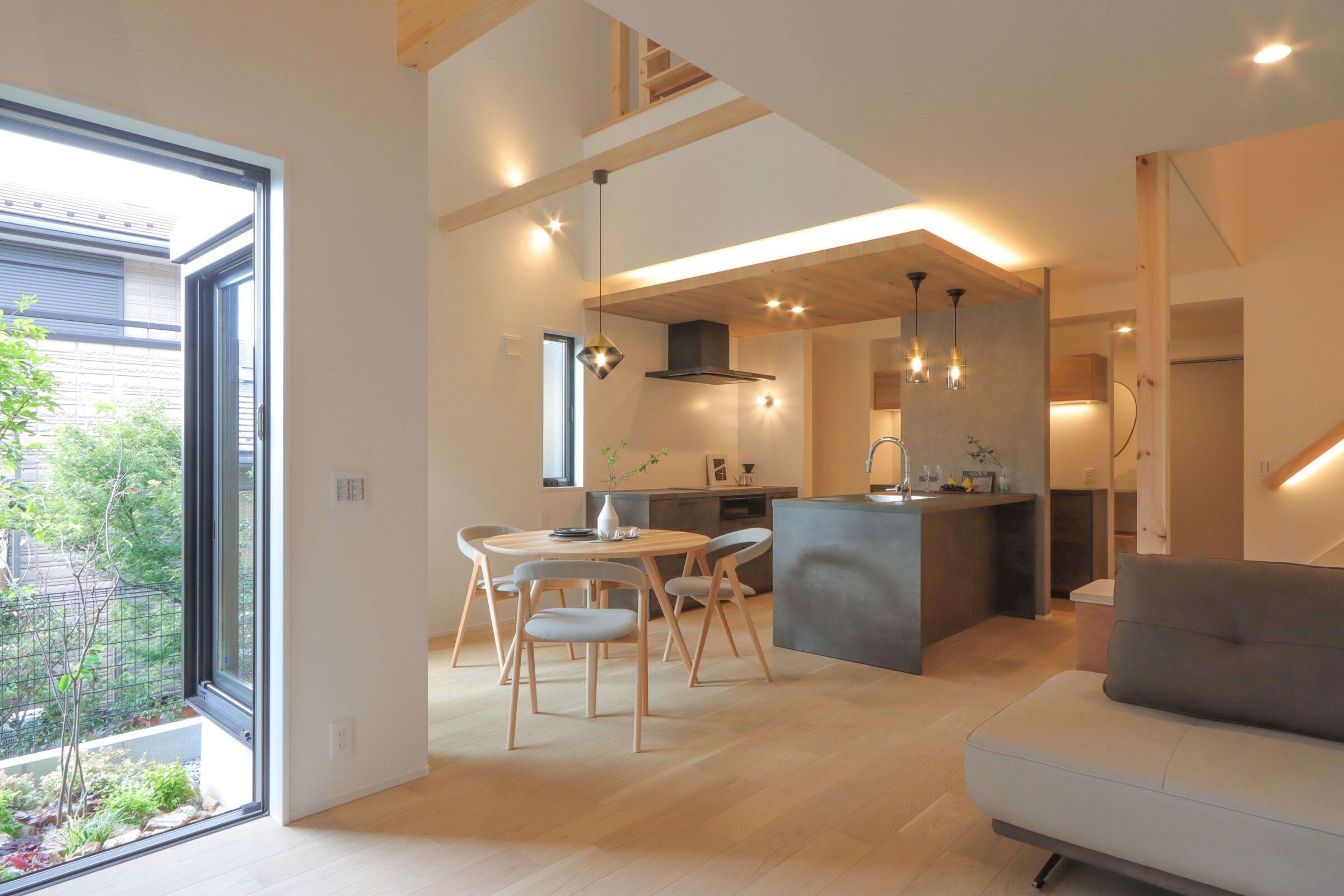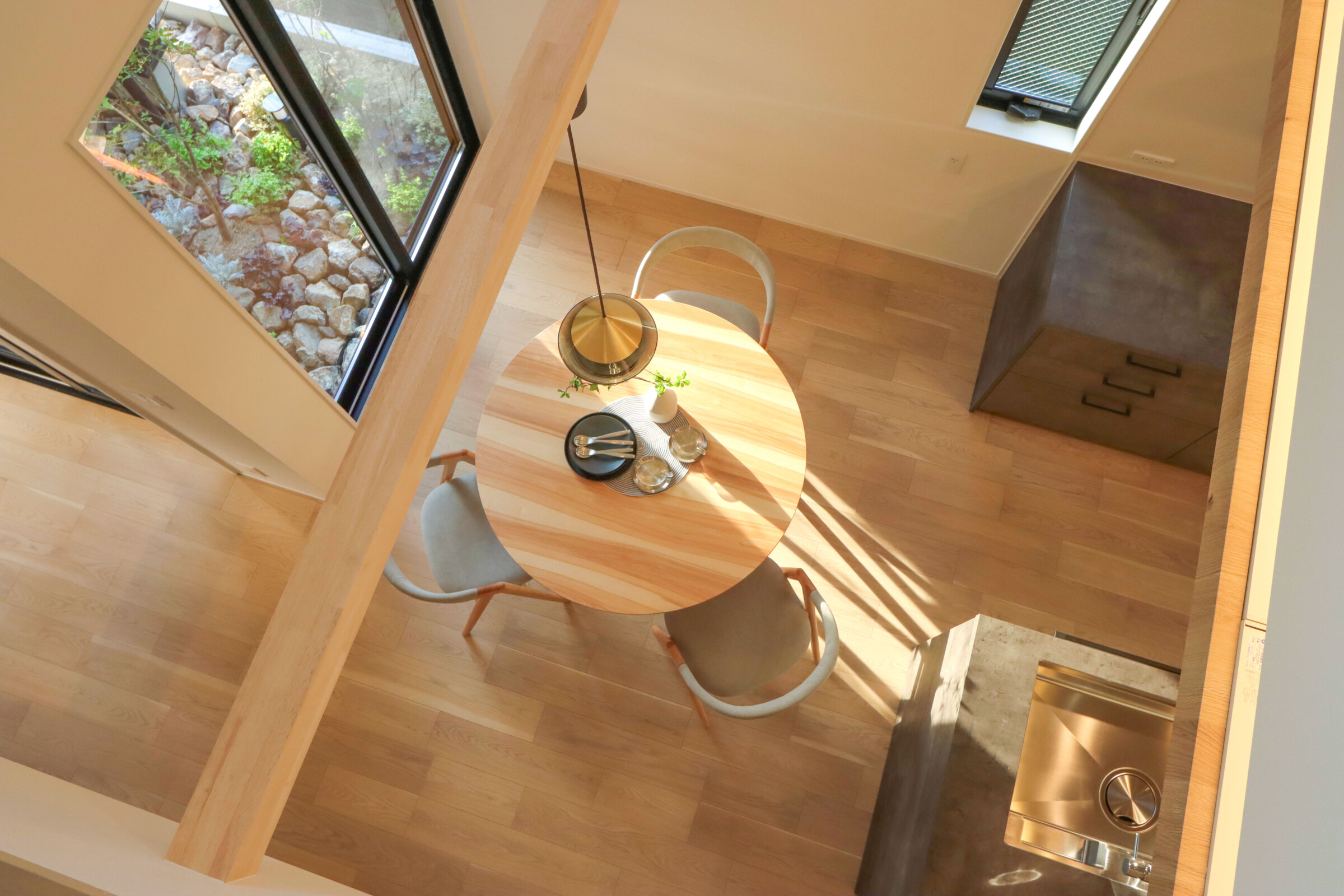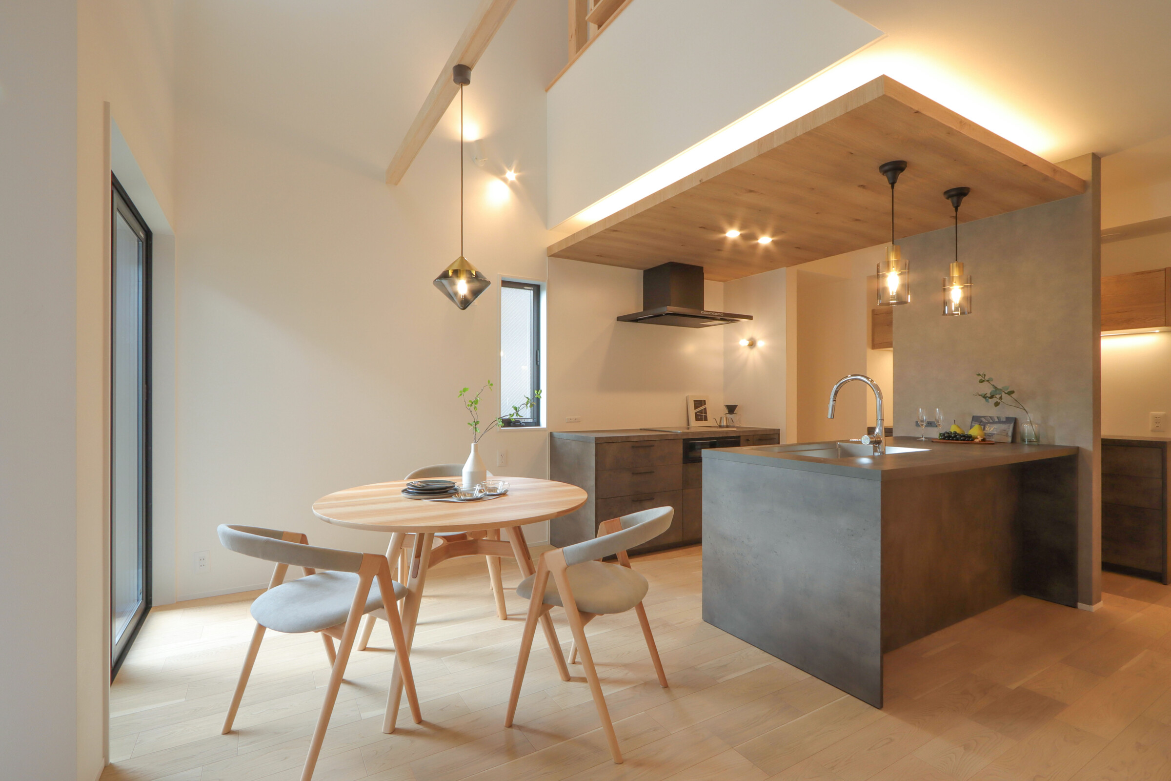 丸テーブルのダイニング、寝室からの眺め、間接照明まで細部にこだわり、空間の心地よさとデザイン性を整えました。