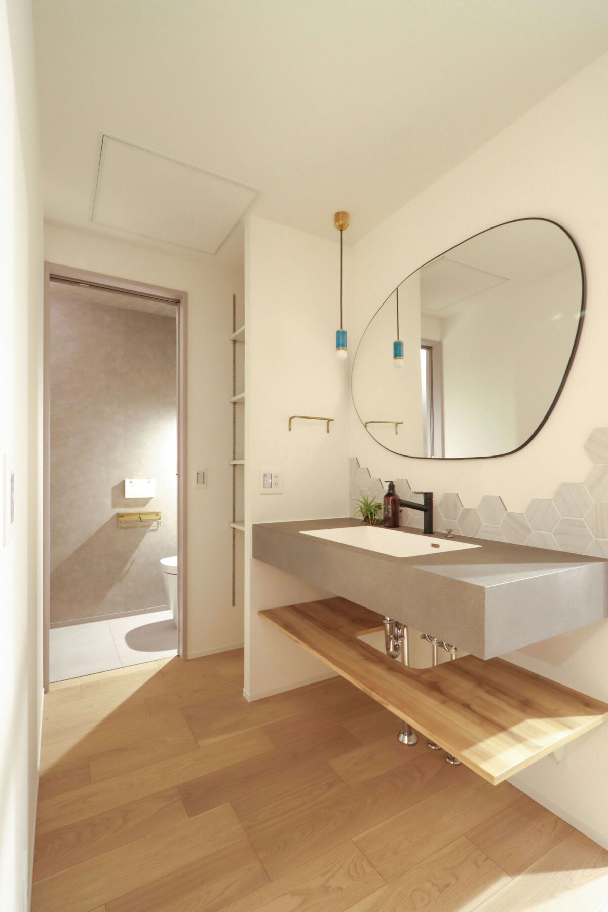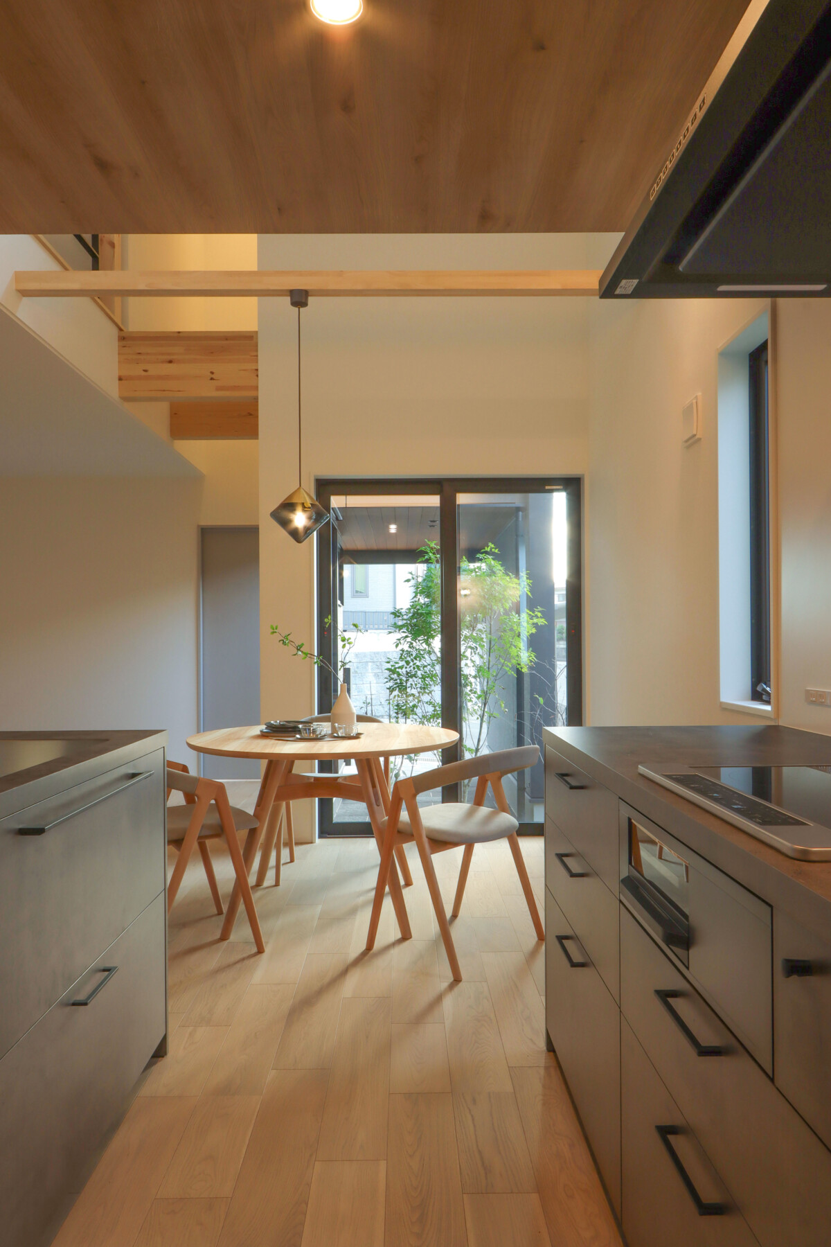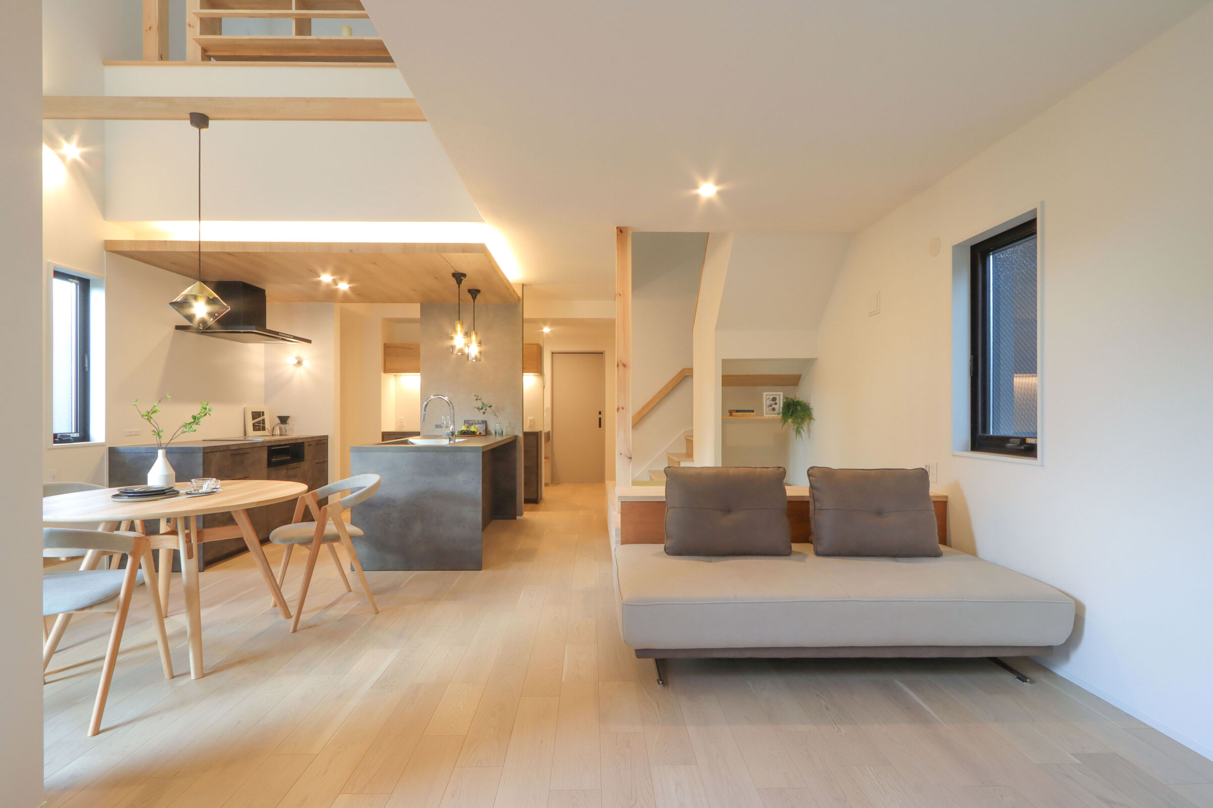 丸テーブルのダイニング、寝室からの眺め、間接照明まで細部にこだわり、空間の心地よさとデザイン性を整えました。