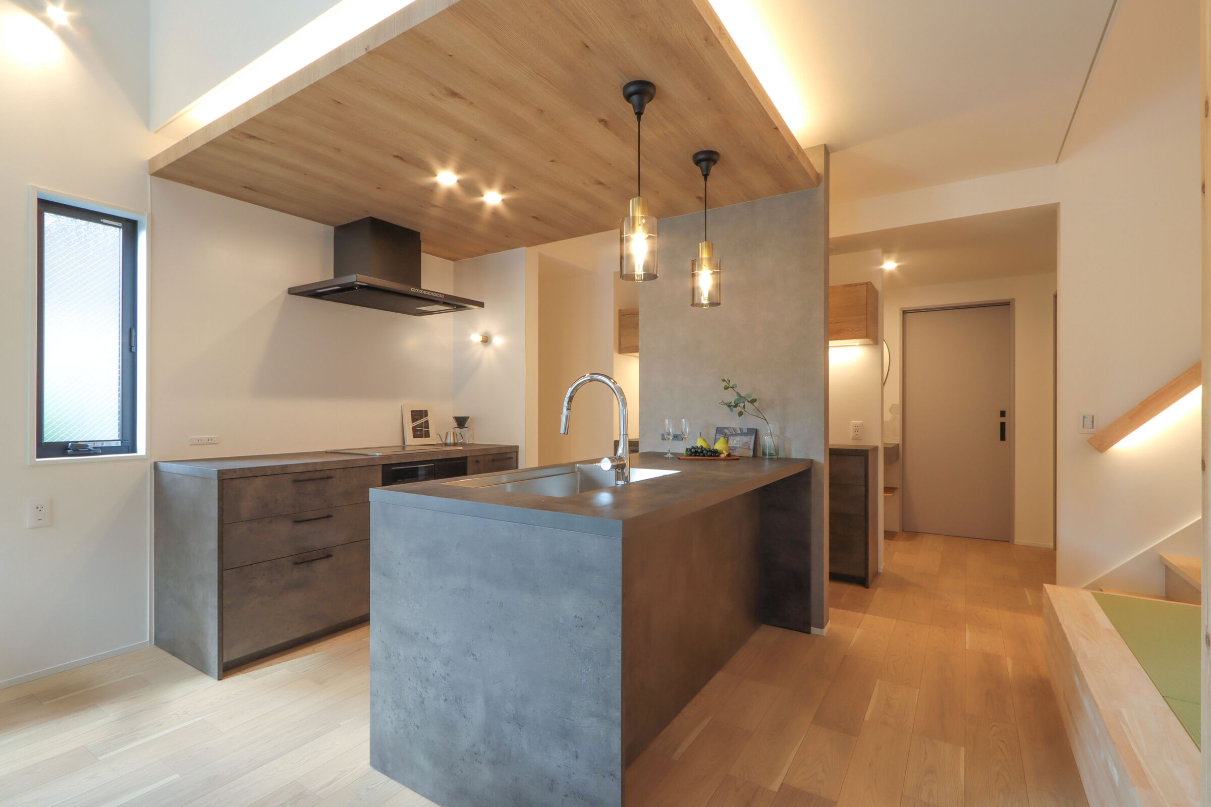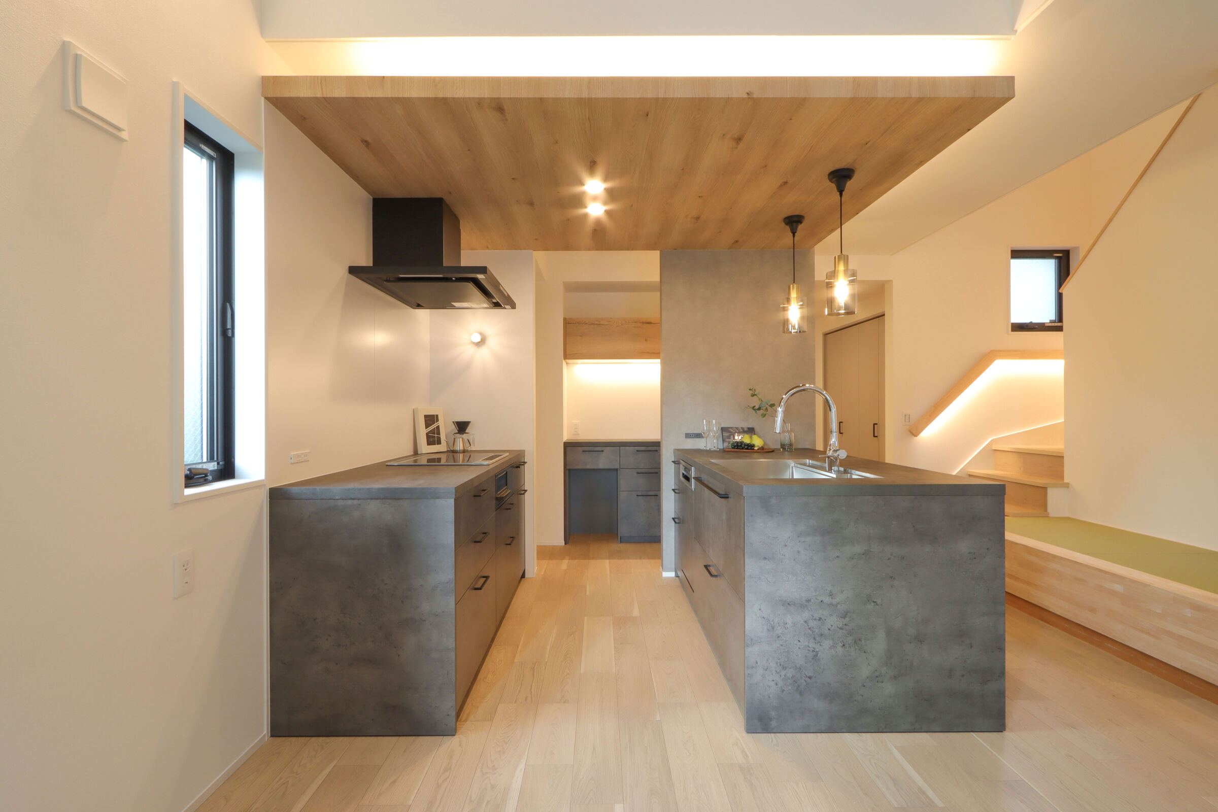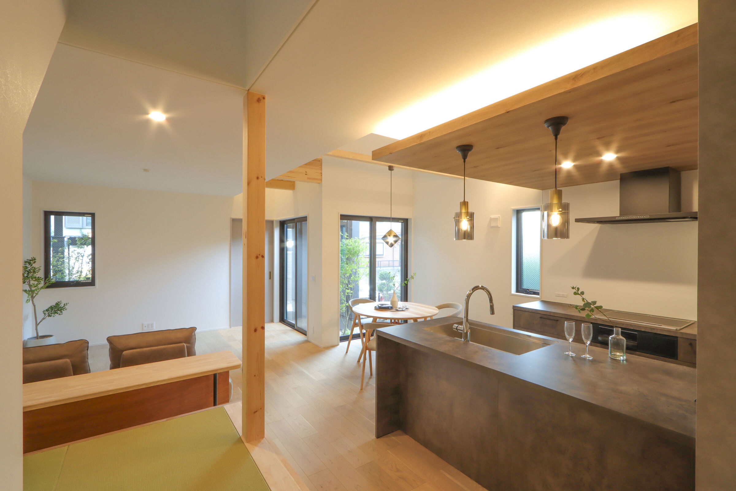 2列配置のグラフテクトのキッチンで回遊動線をつくり、対面にある畳コーナーは料理中も見守れる遊び・学びの場に。
