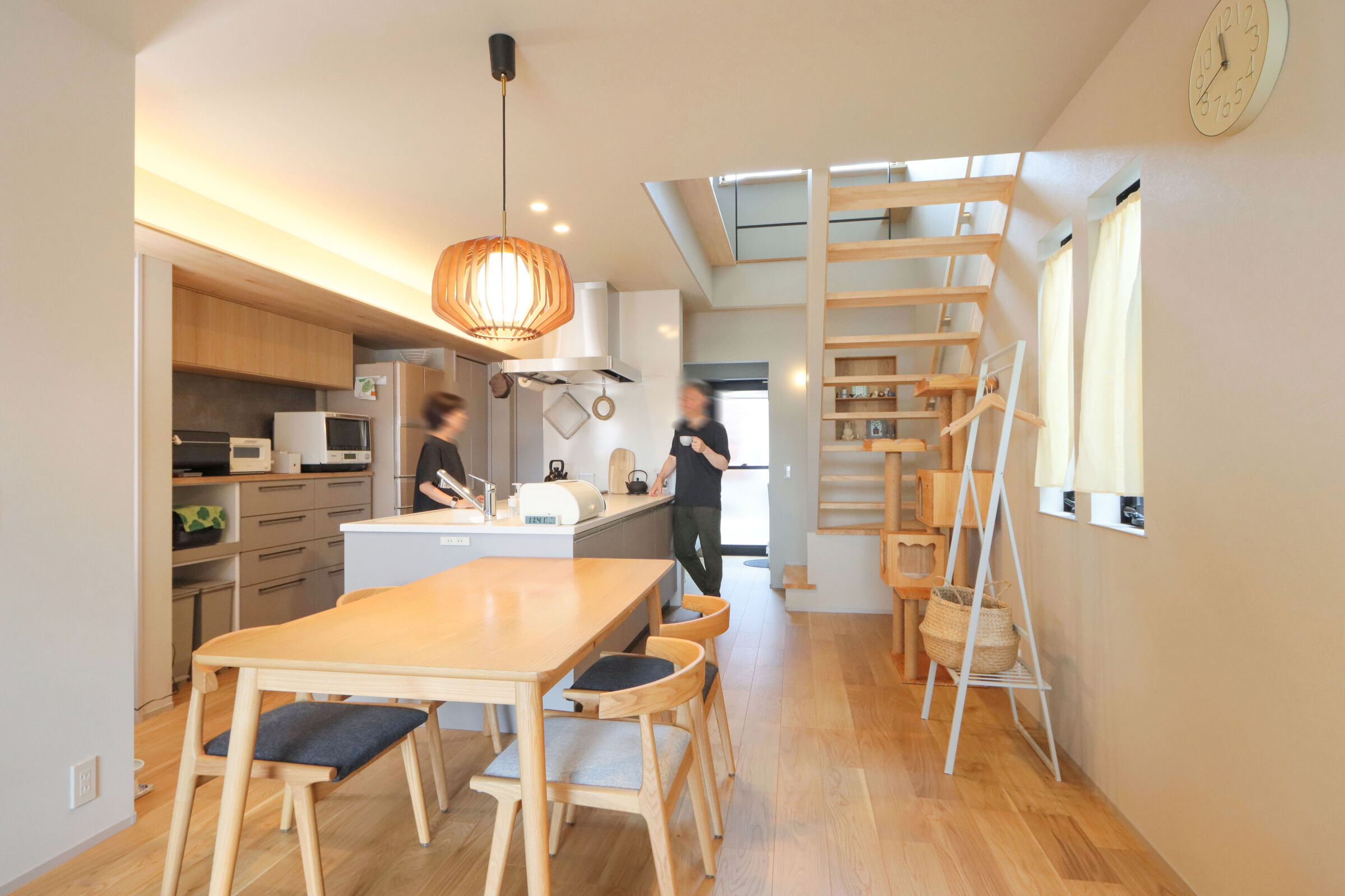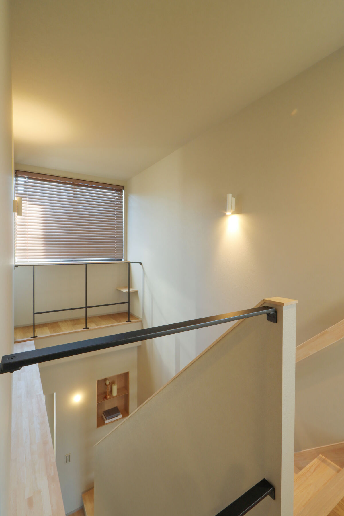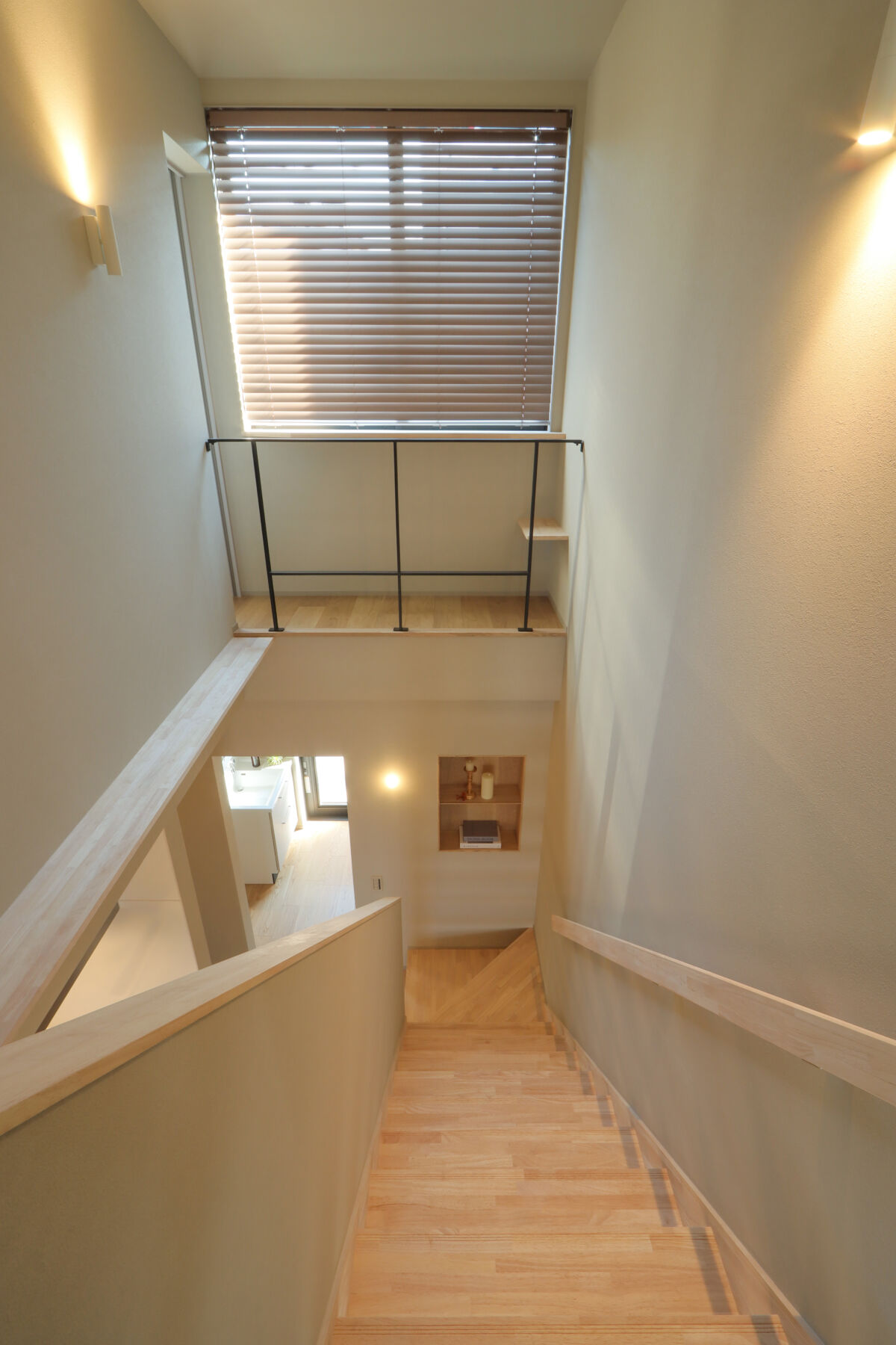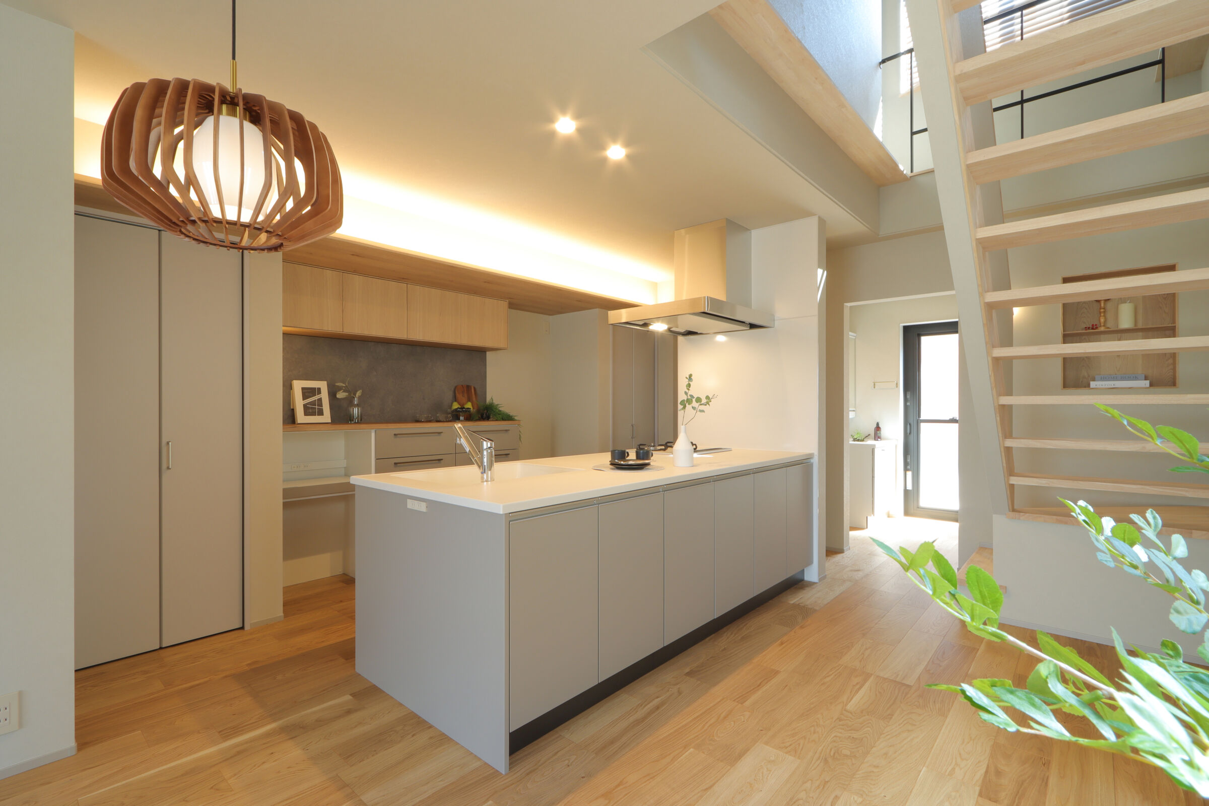 内装全体は、グレージュを基調としたジャパンディスタイルで統一。集成材の階段や造作のキャットウォークなど、木のぬくもりを感じられるデザインが特徴的。グレージュのクロスが空間をやさしく包み込み、間接照明や壁付照明の光がふんわりと反射することで、心落ち着く穏やかな住まいになりました。
