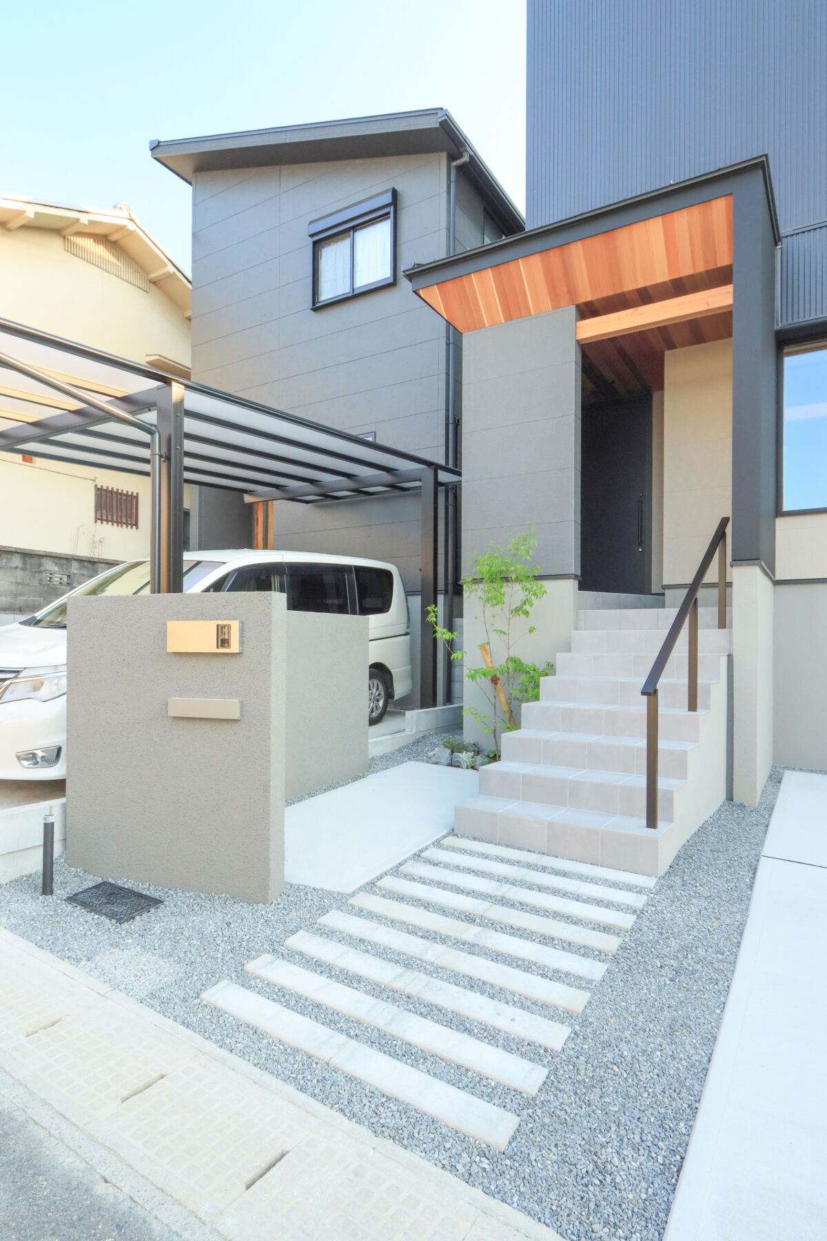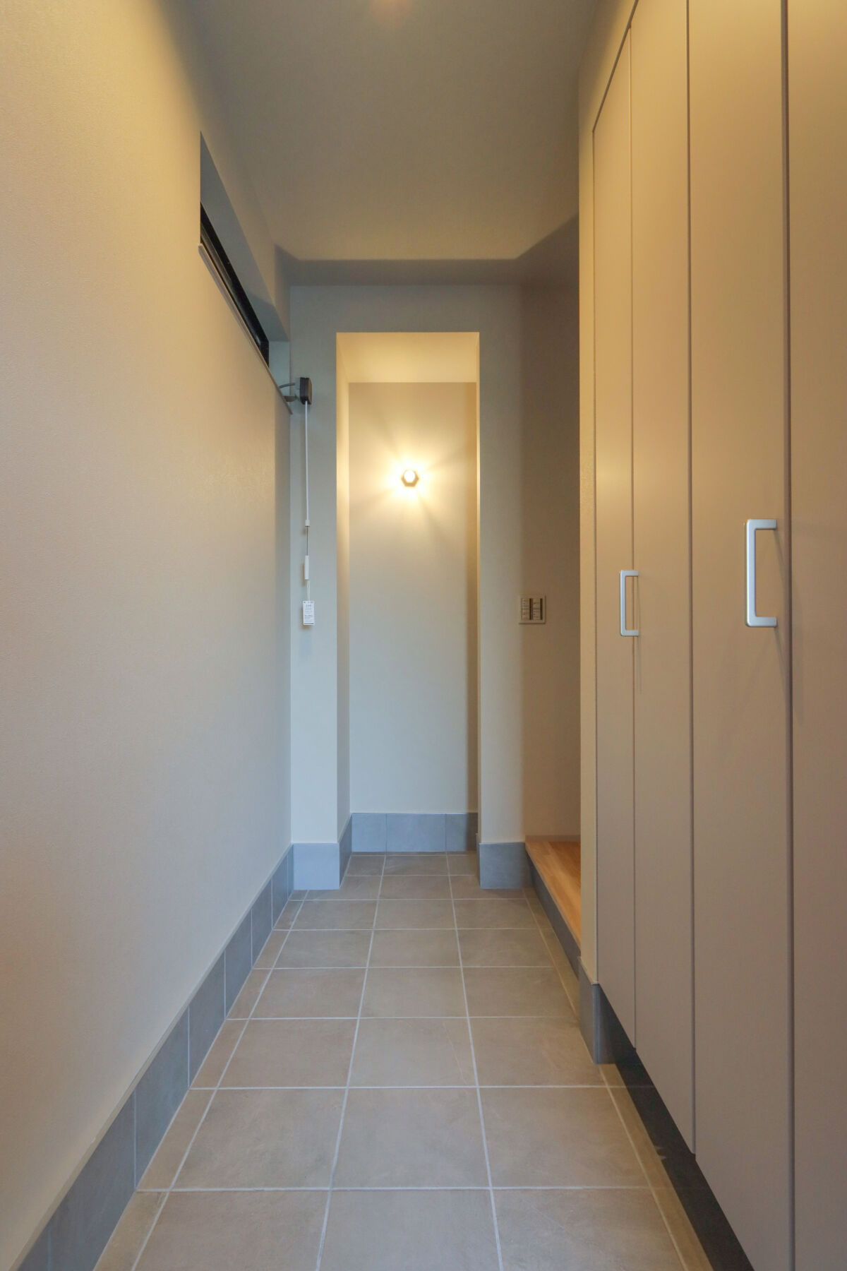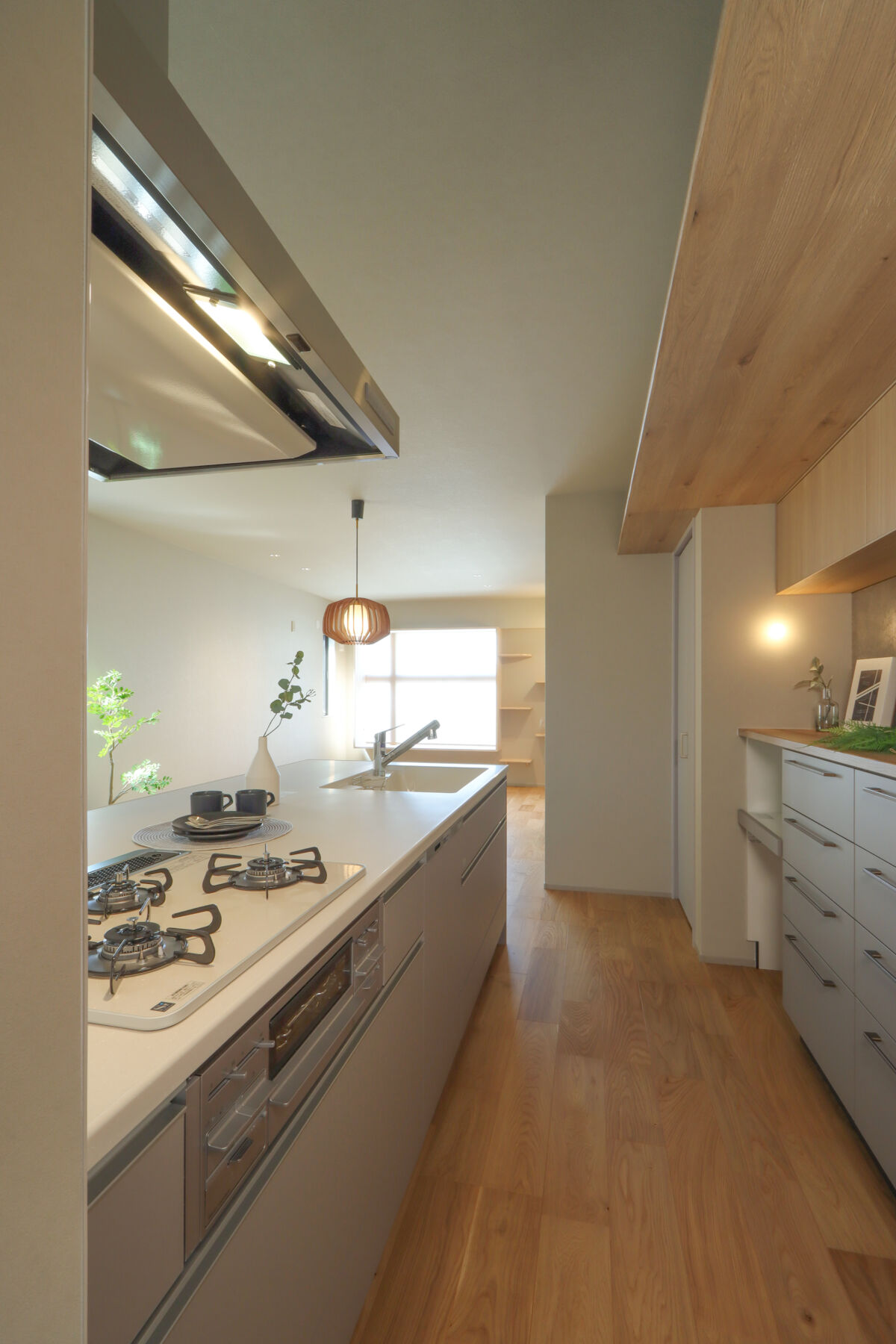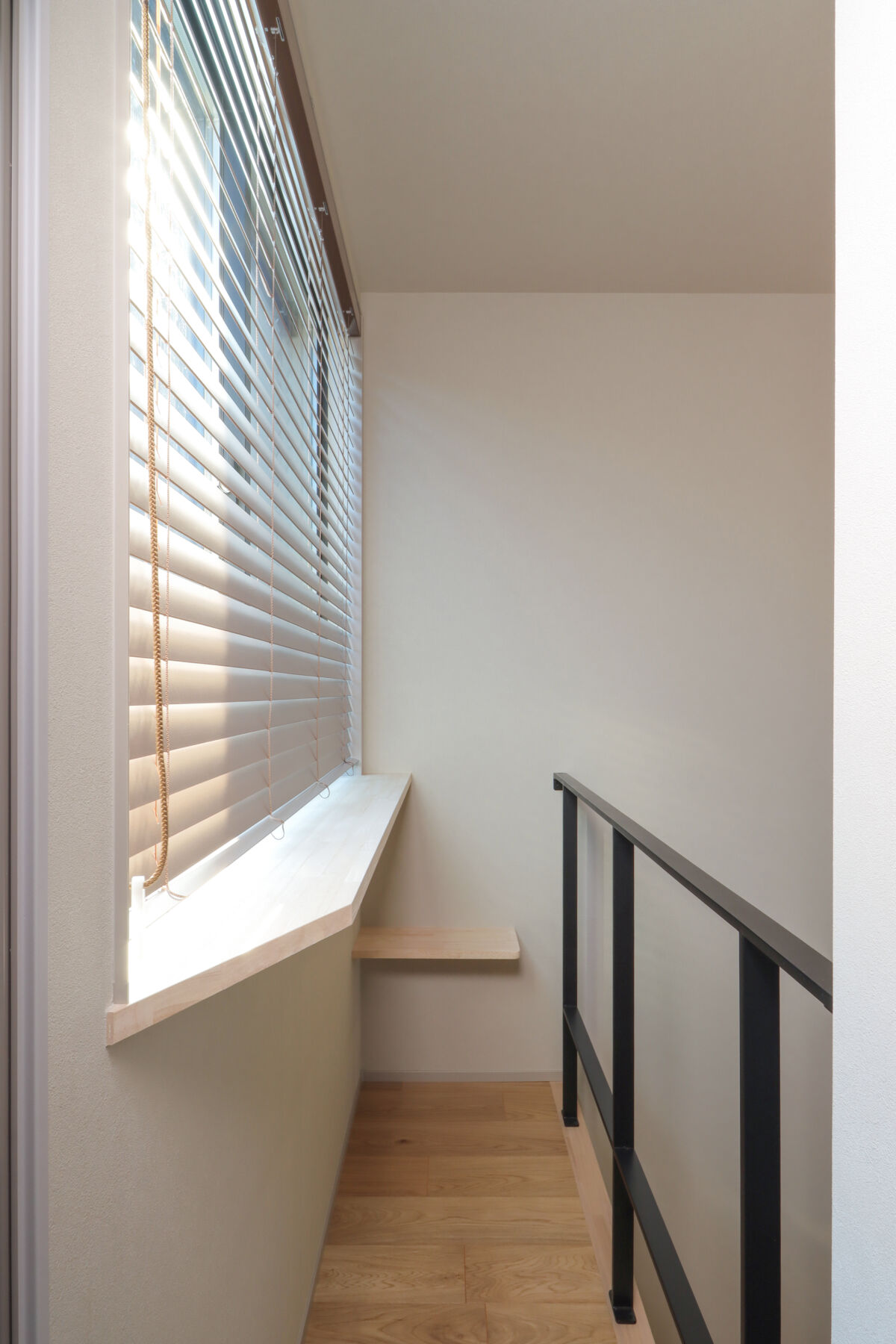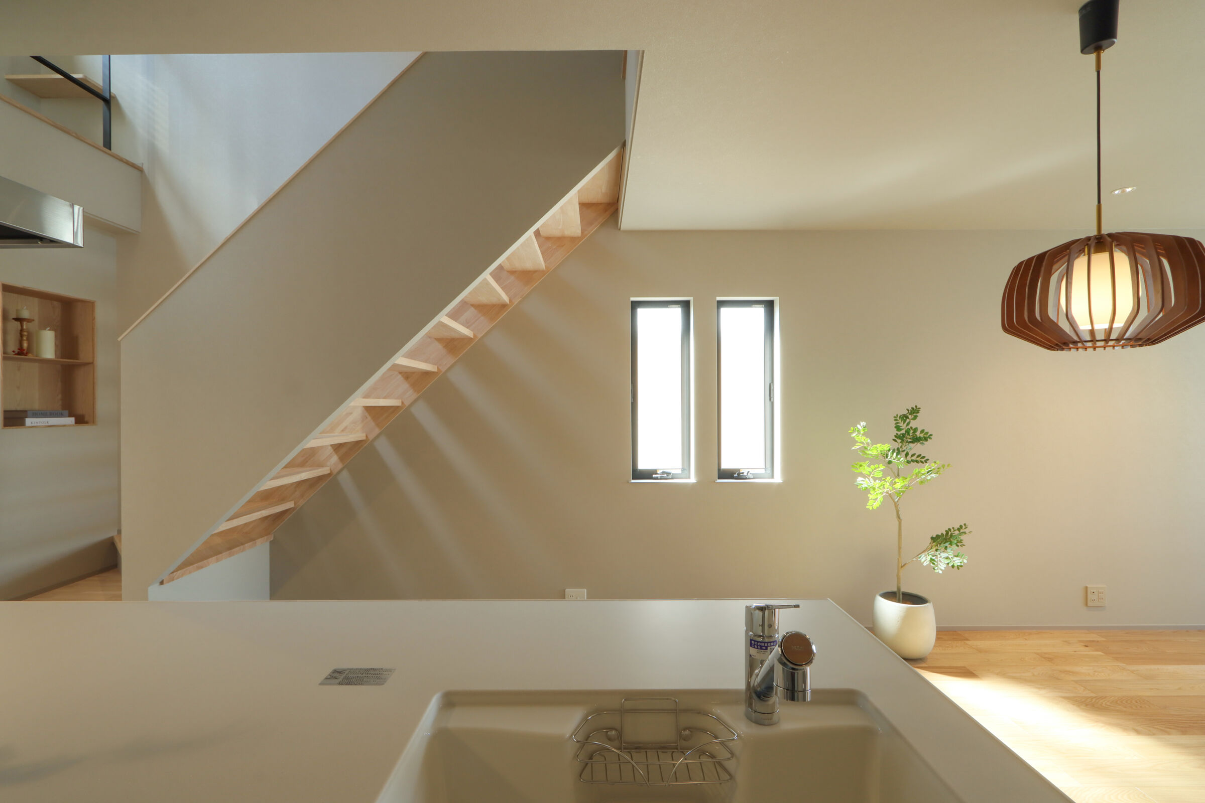 内装全体は、グレージュを基調としたジャパンディスタイルで統一。集成材の階段や造作のキャットウォークなど、木のぬくもりを感じられるデザインが特徴的。グレージュのクロスが空間をやさしく包み込み、間接照明や壁付照明の光がふんわりと反射することで、心落ち着く穏やかな住まいになりました。