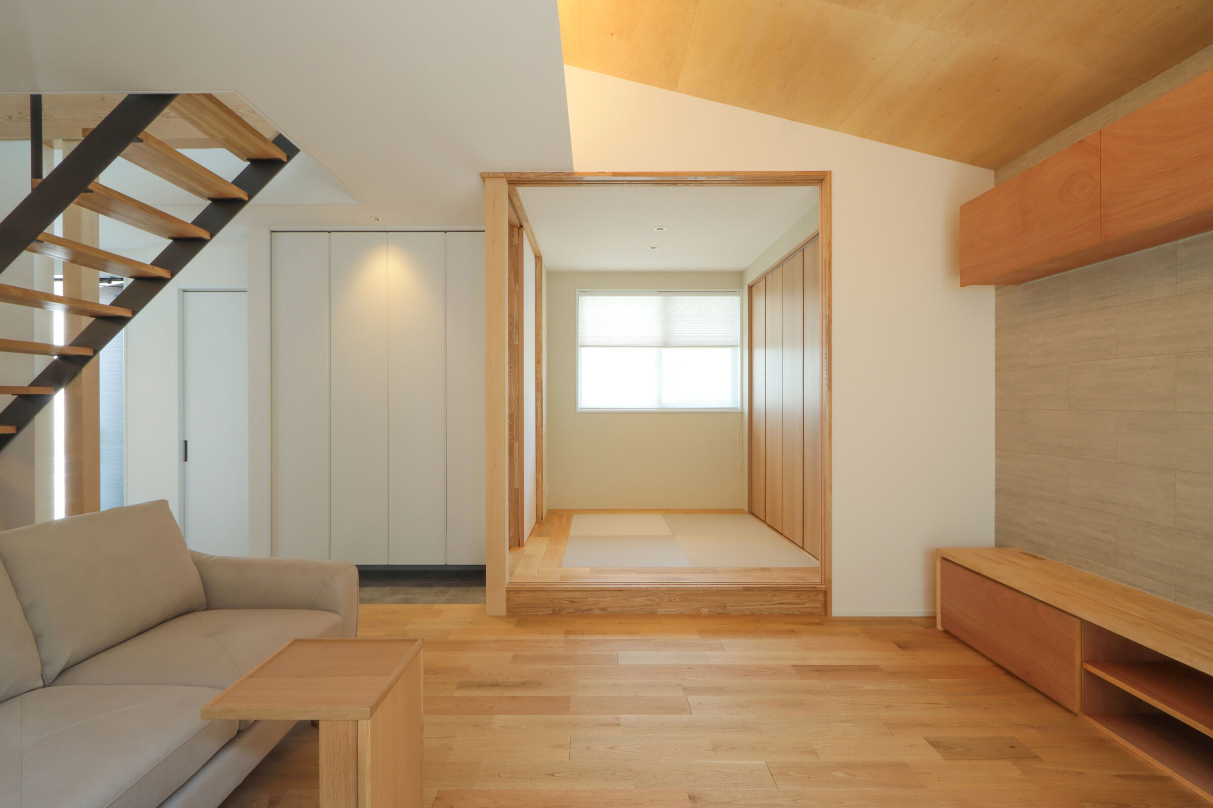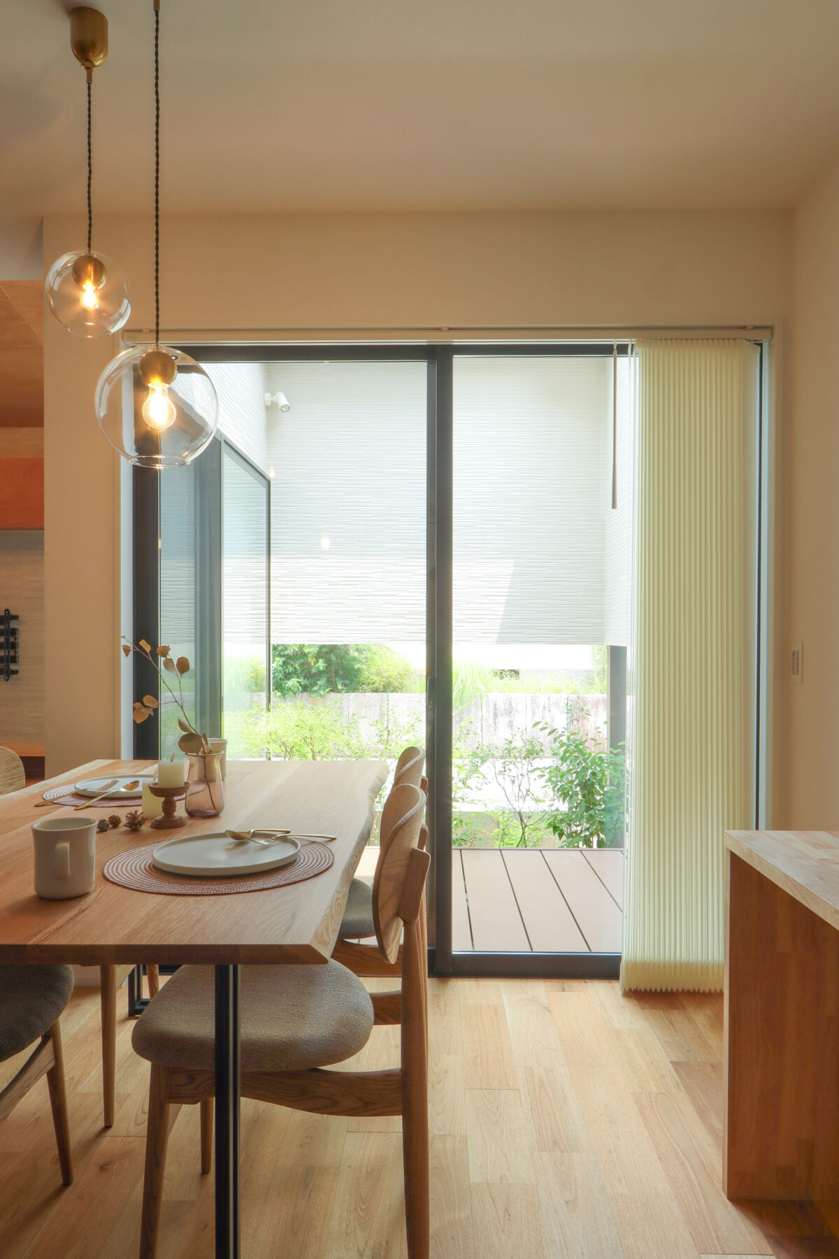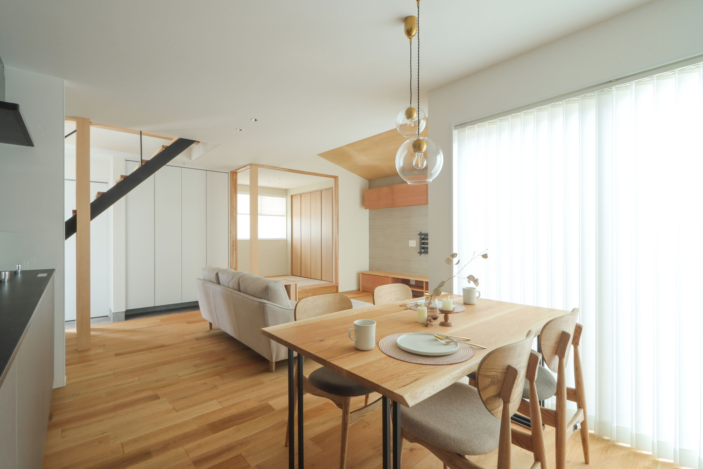 玄関までのアプローチには四季を感じる庭を設け、帰るたびに心が和む空間に。玄関土間からつながる趣味室は、ご主人がゆっくり過ごせる特別な場所です。LDKはクルミの無垢床と間接照明でやさしい雰囲気にまとめ、ラワン材の造作で統一感を持たせました。障子で仕切った和室は、静けさとLDKとのつながりを両立しています。ダイニングには耳付きホワイトオークのテーブルを合わせ、庭へ開くデッキでは家族だけの時間を楽しめます。大きな窓が開放感を生み、寝室の灯りが夜の外観にも温かさを添えています。
