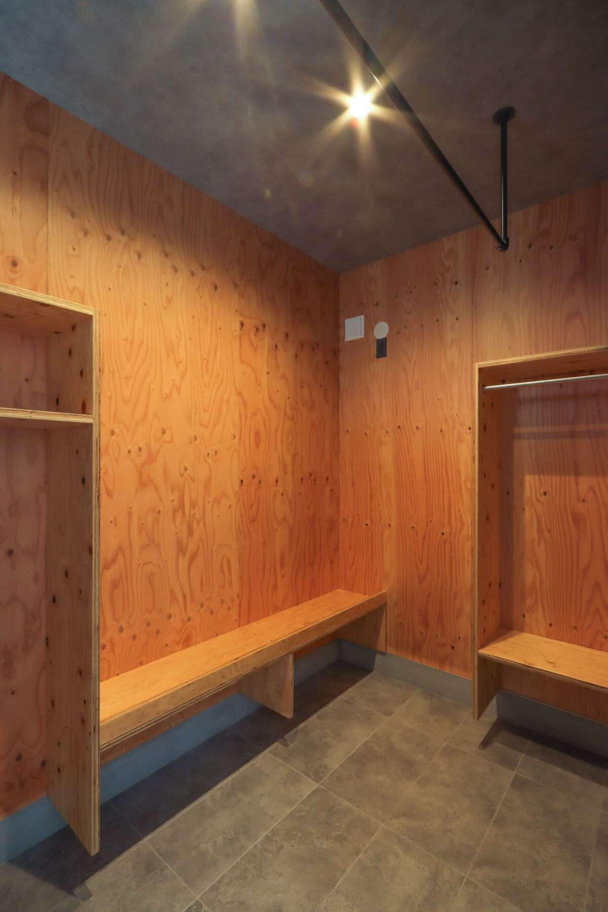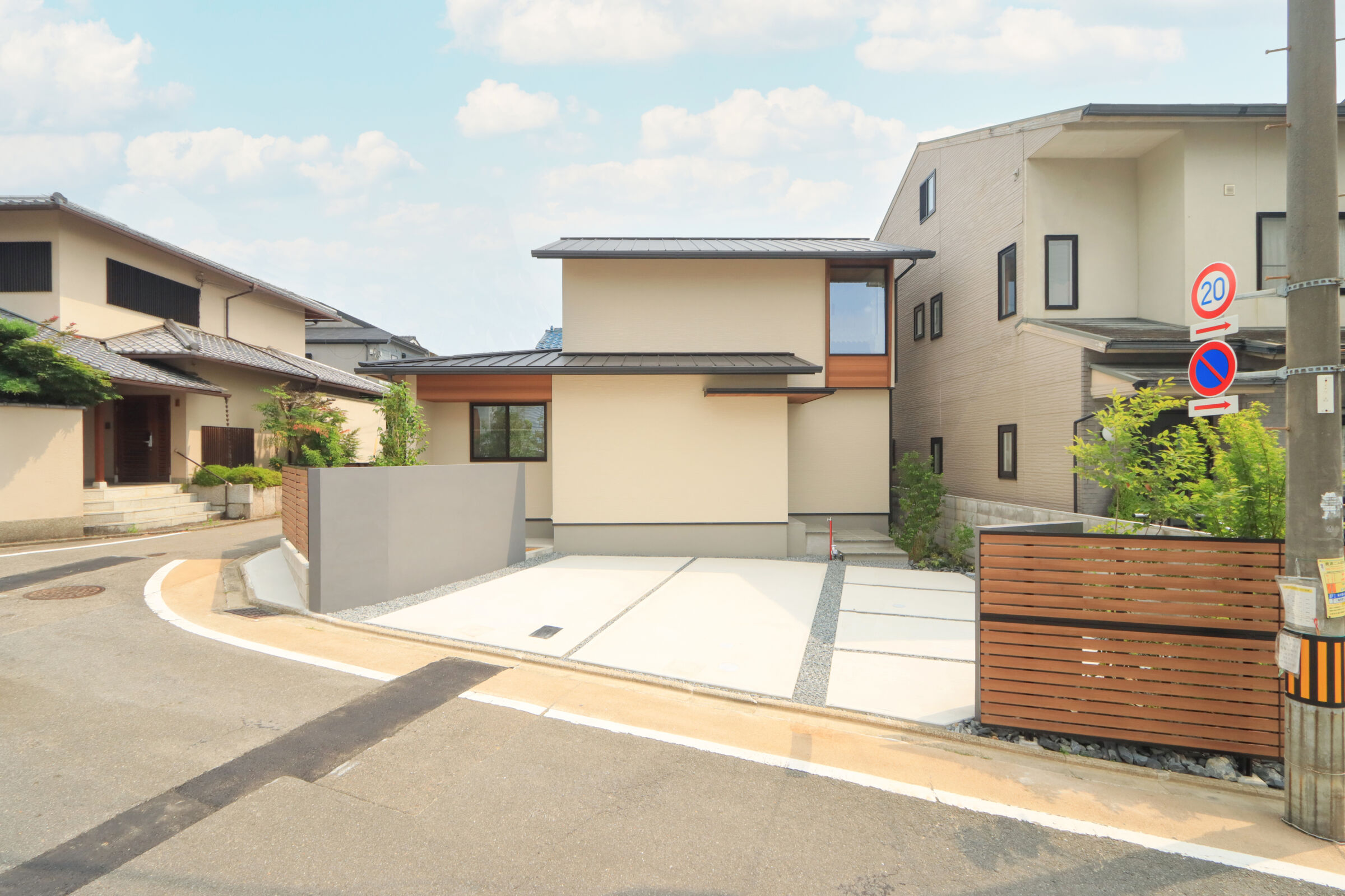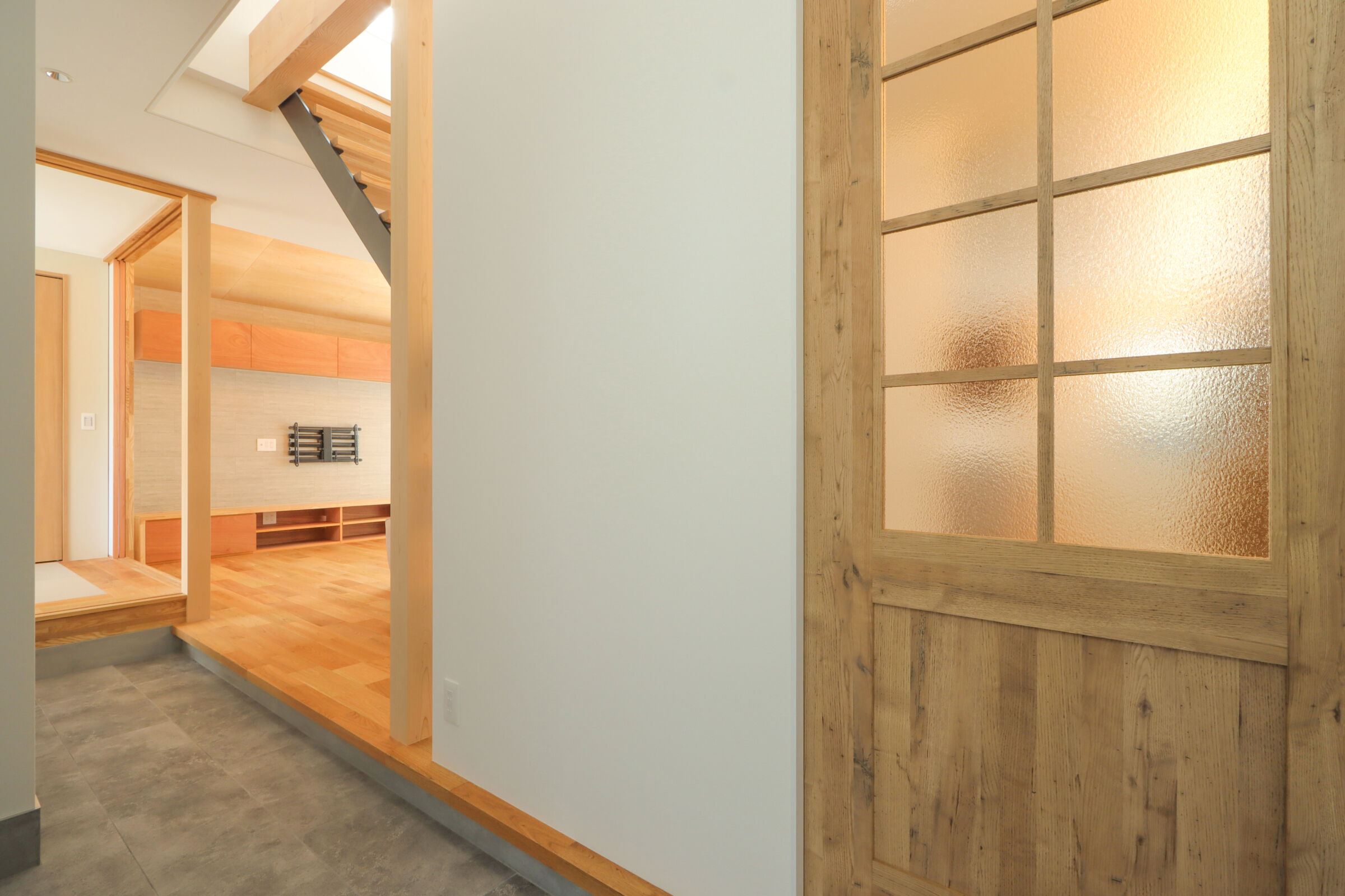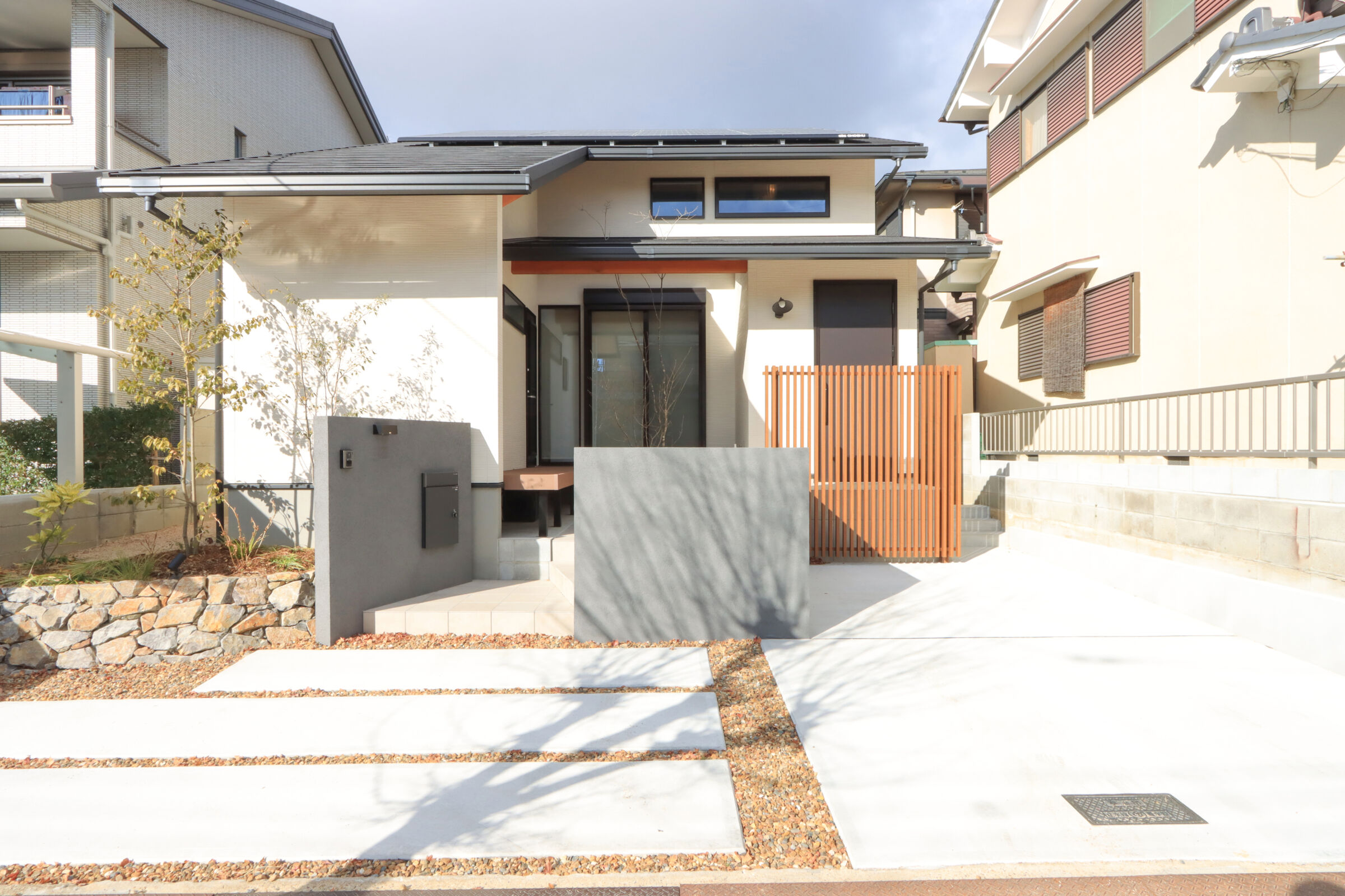 玄関までのアプローチには四季を感じる庭を設け、帰るたびに心が和む空間に。玄関土間からつながる趣味室は、ご主人がゆっくり過ごせる特別な場所です。LDKはクルミの無垢床と間接照明でやさしい雰囲気にまとめ、ラワン材の造作で統一感を持たせました。障子で仕切った和室は、静けさとLDKとのつながりを両立しています。ダイニングには耳付きホワイトオークのテーブルを合わせ、庭へ開くデッキでは家族だけの時間を楽しめます。大きな窓が開放感を生み、寝室の灯りが夜の外観にも温かさを添えています。