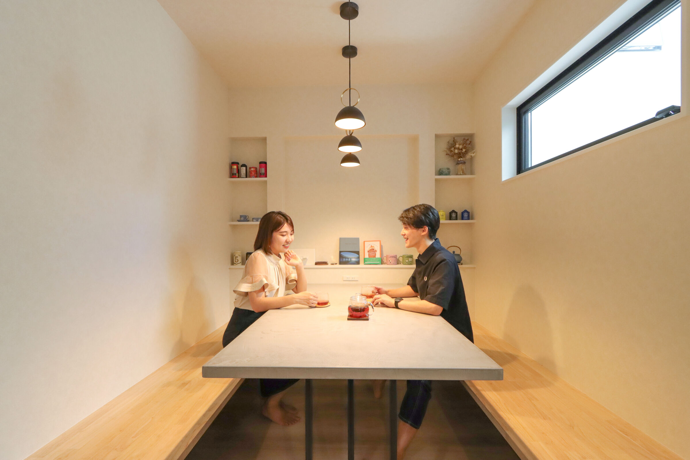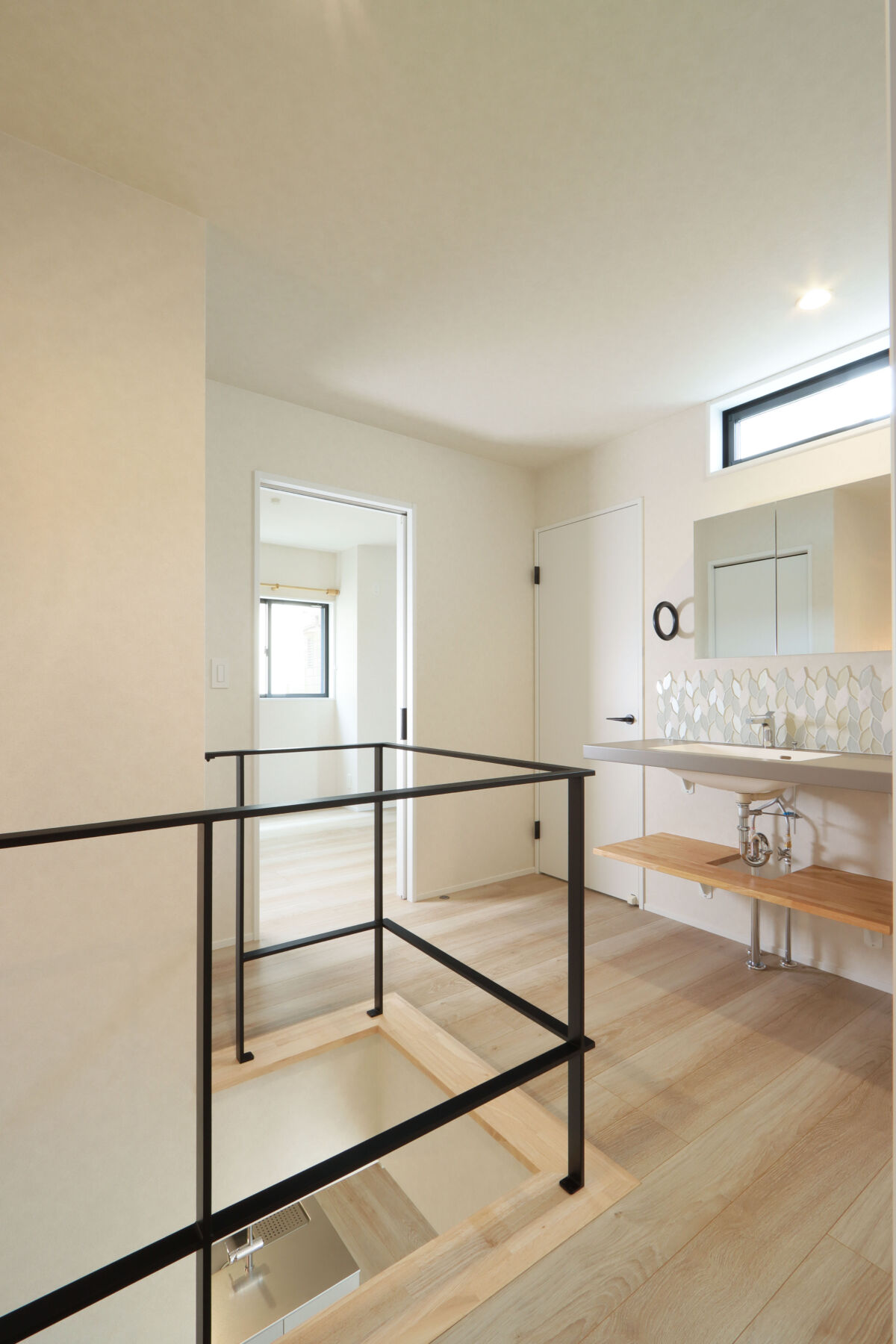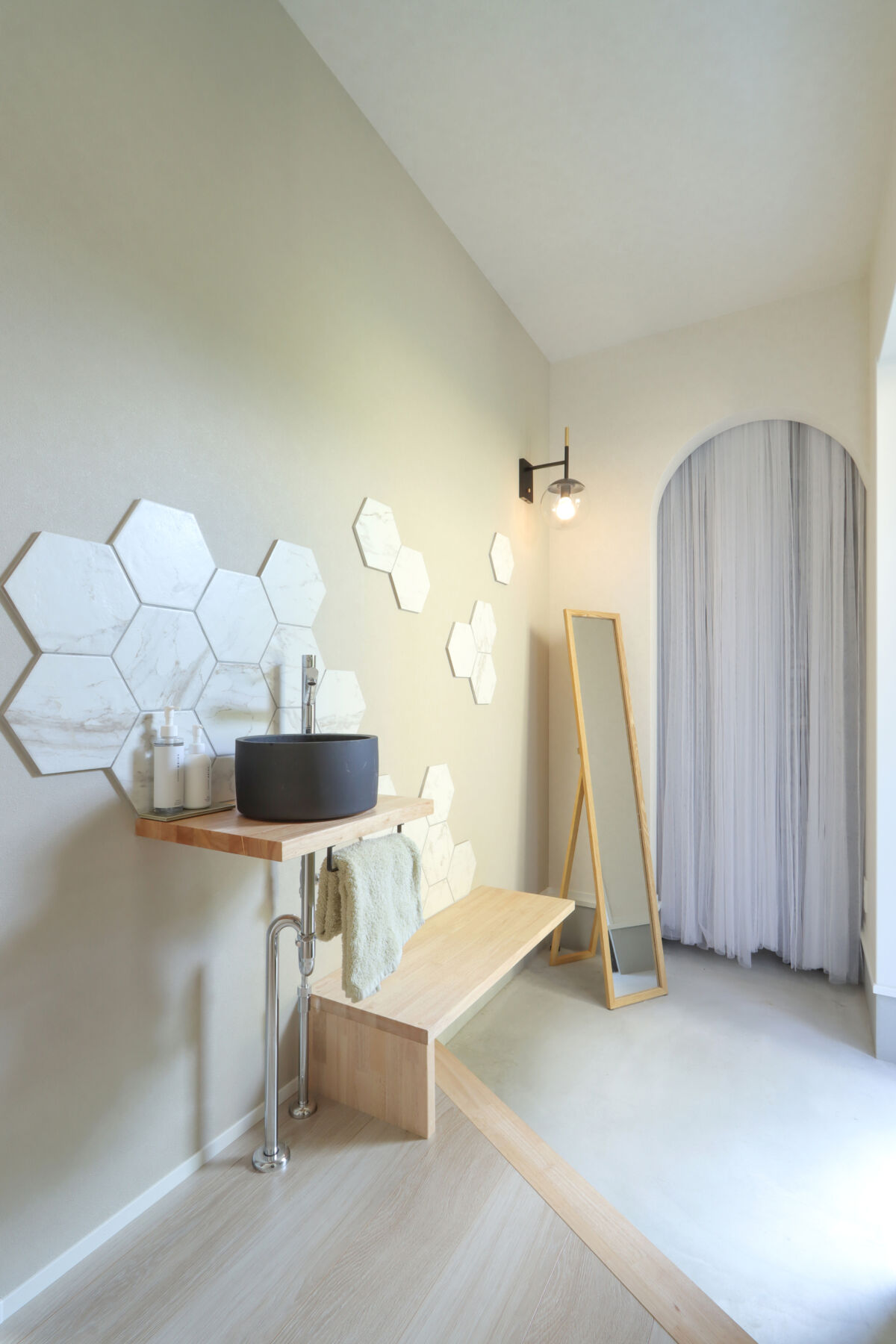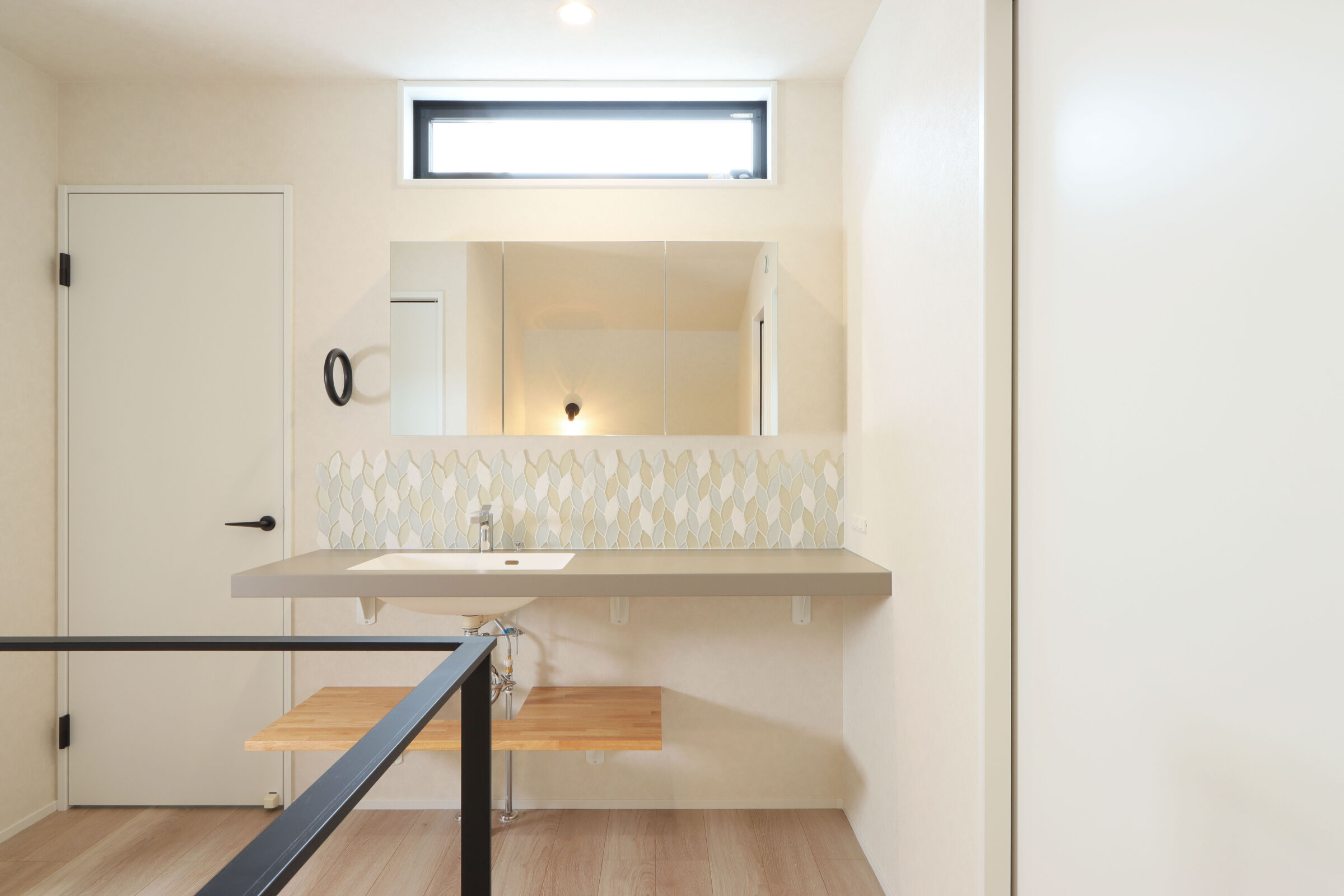 ヘキサゴンタイルを散りばめた広がりを感じる玄関から、一段下げたピットリビングへと続く、心地よい「こもり感」のある空間設計です。キッチンにはサンワカンパニーのウィッテを採用し、隣接するヌックダイニングにはオリジナルベンチを設置。2階のホテルライクな小上がりベッドスペースやスタイリッシュなオープン洗面など、細部にわたる工夫が、機能性とデザイン性を兼ね備えた上質な暮らしを演出しています。