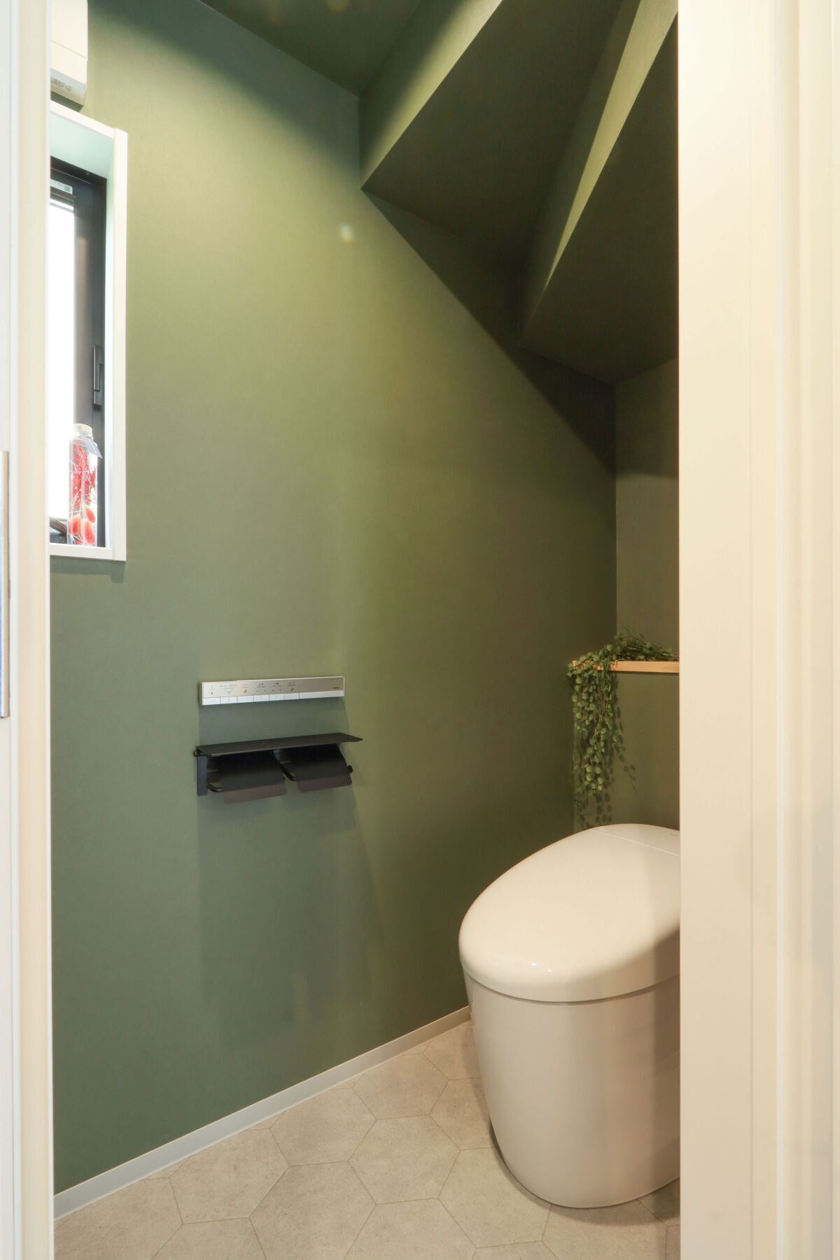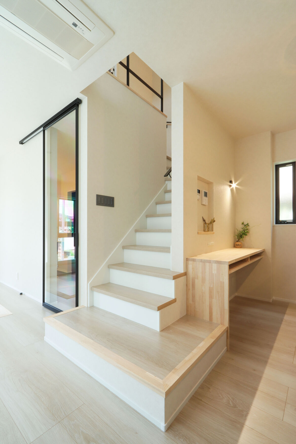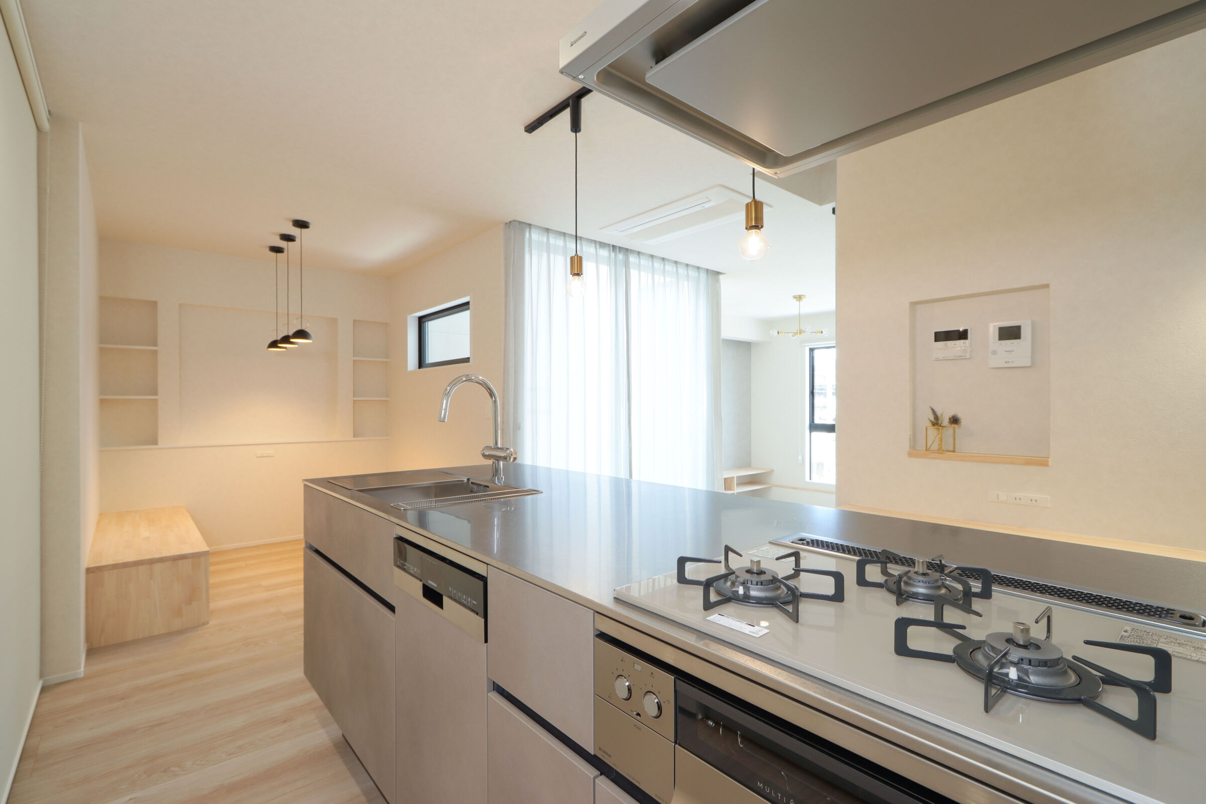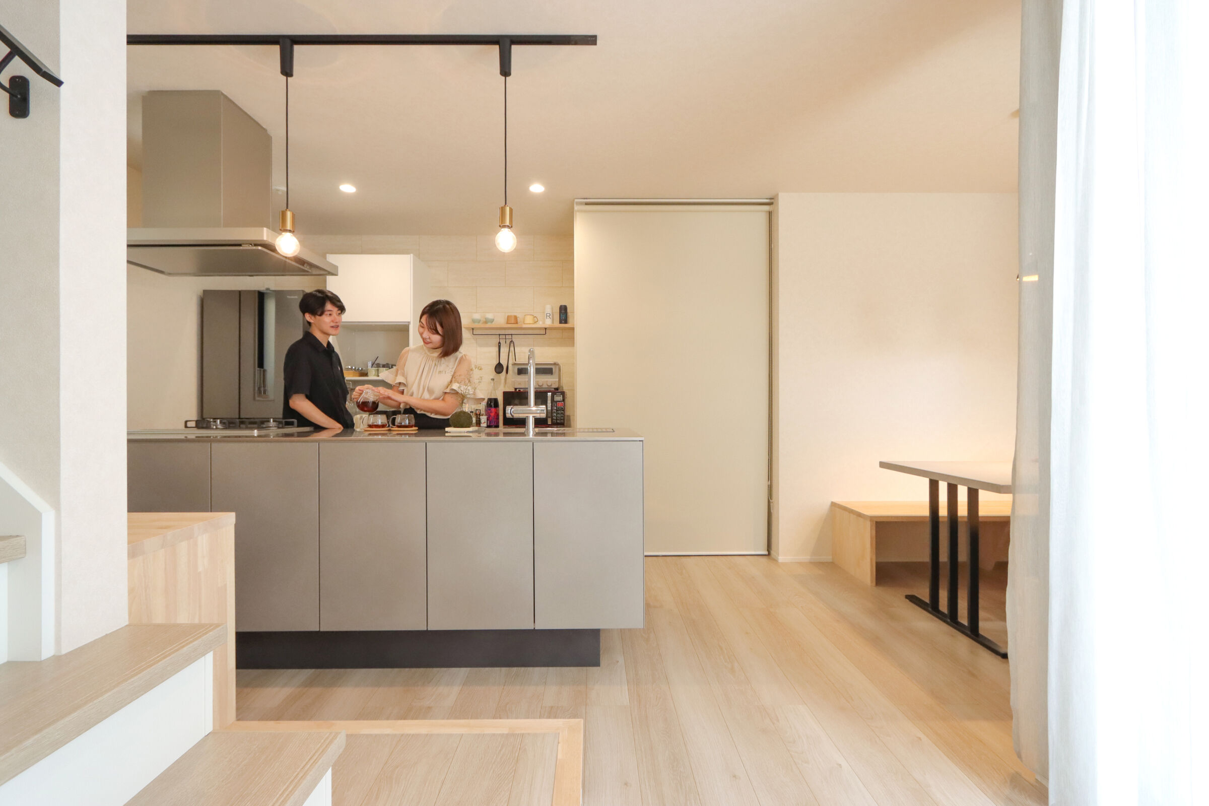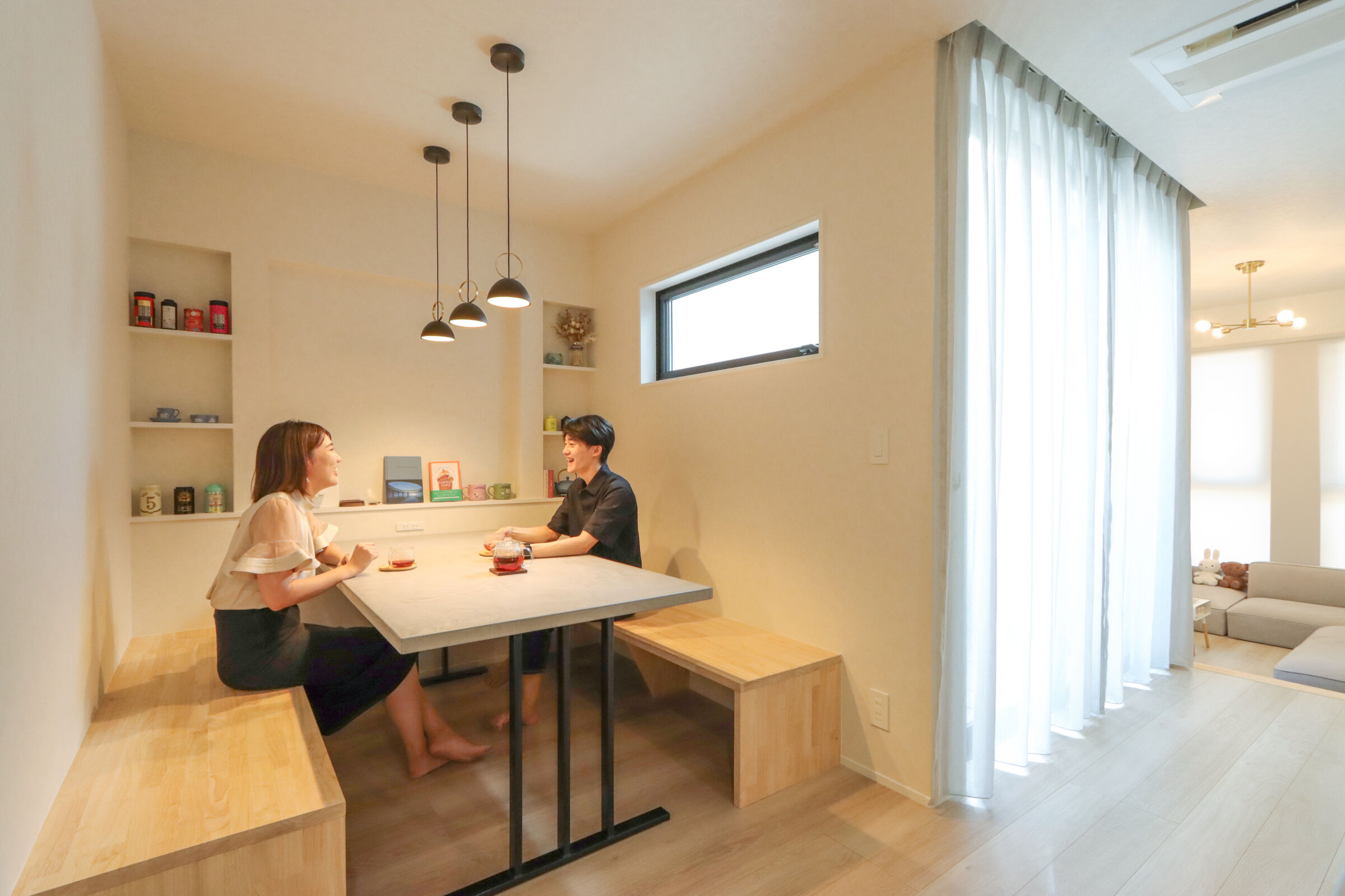 ヘキサゴンタイルを散りばめた広がりを感じる玄関から、一段下げたピットリビングへと続く、心地よい「こもり感」のある空間設計です。キッチンにはサンワカンパニーのウィッテを採用し、隣接するヌックダイニングにはオリジナルベンチを設置。2階のホテルライクな小上がりベッドスペースやスタイリッシュなオープン洗面など、細部にわたる工夫が、機能性とデザイン性を兼ね備えた上質な暮らしを演出しています。