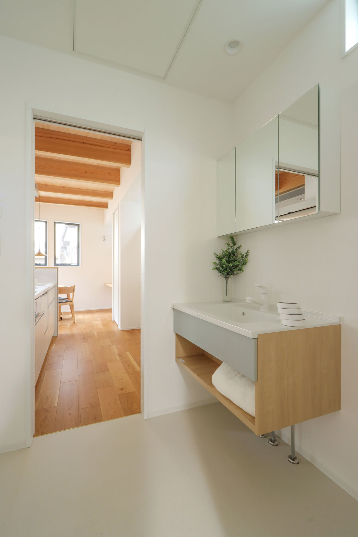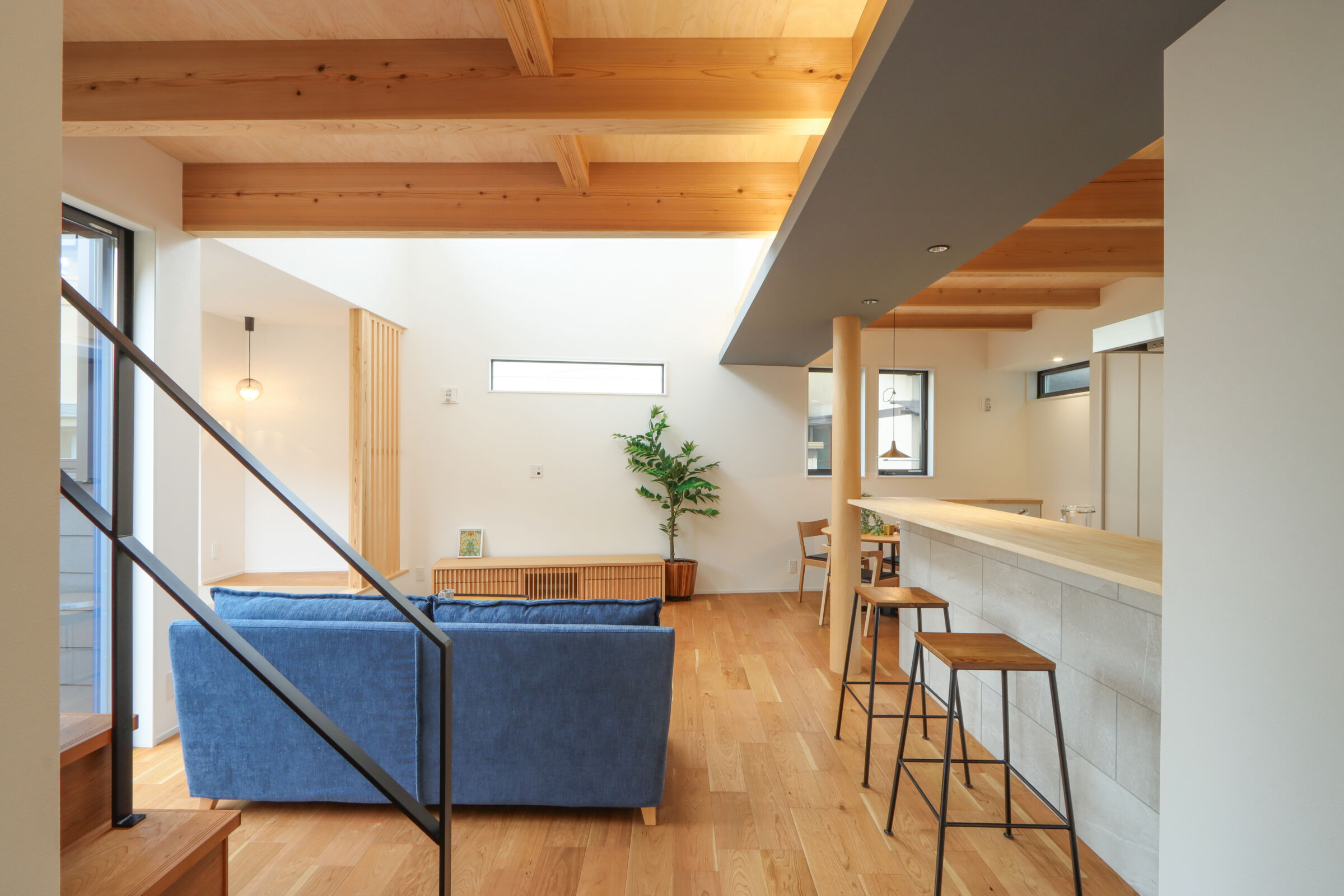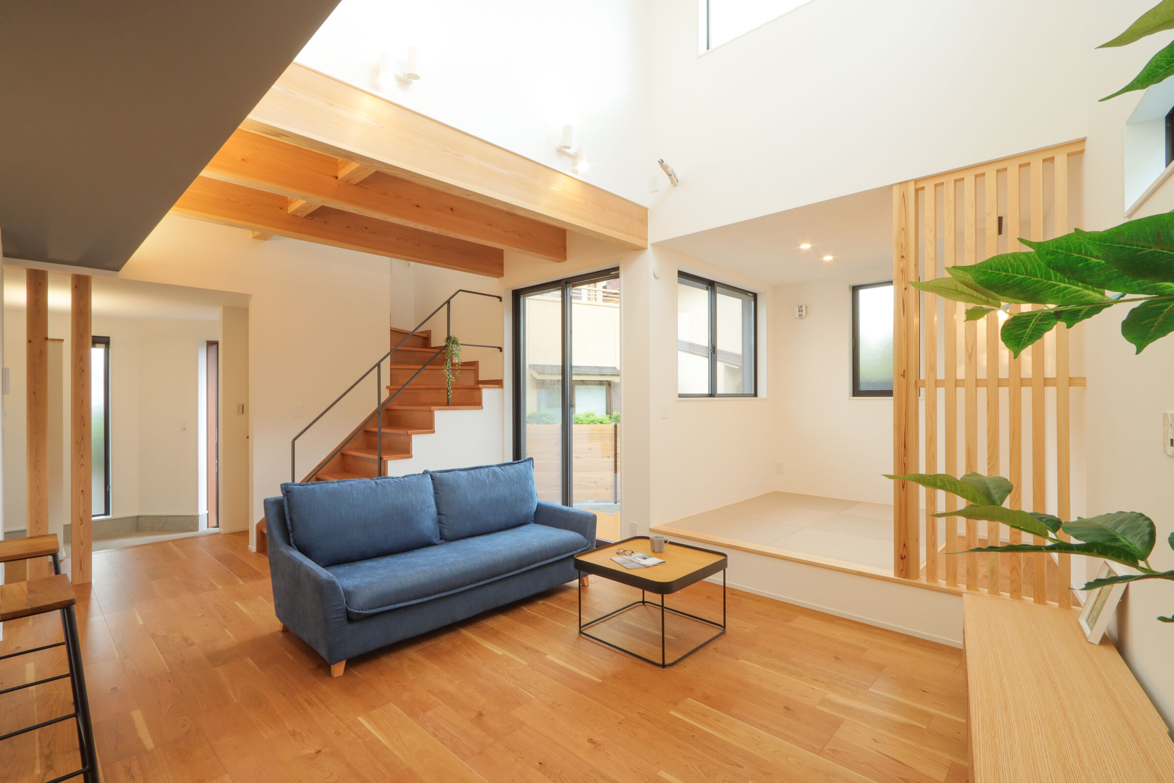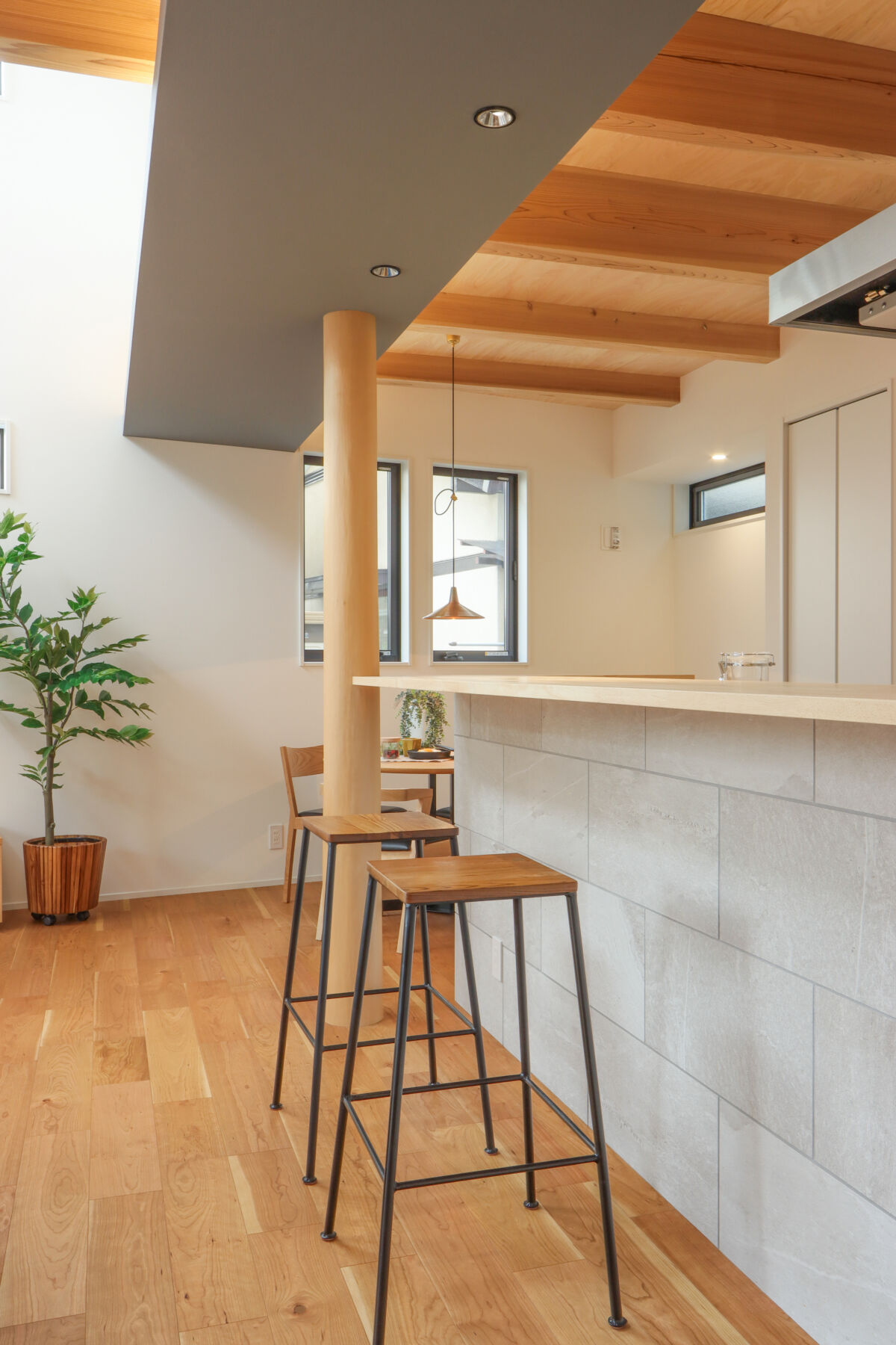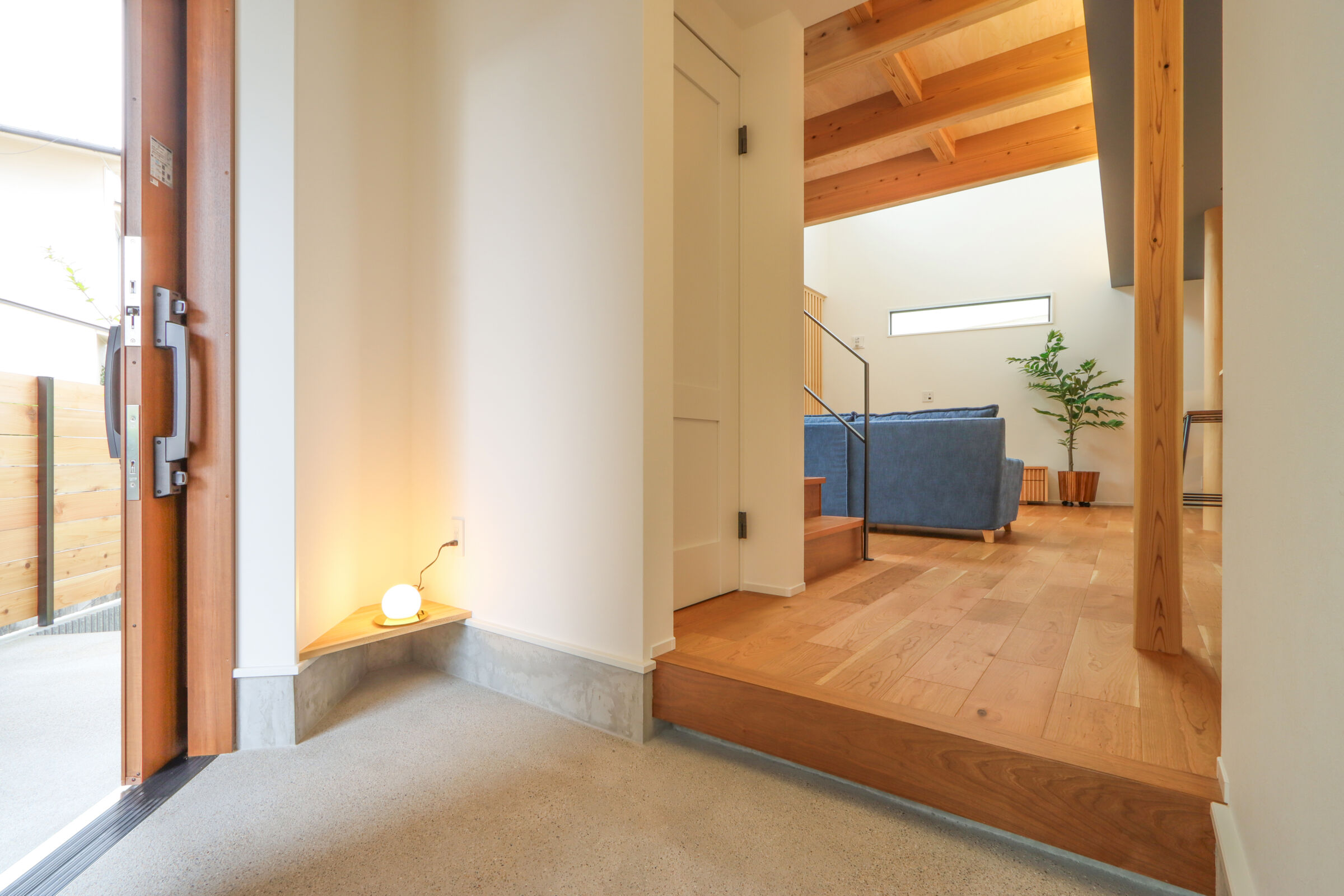 玄関は天井をすっきり見せるため、ダウンライトを使わず間接照明でやわらかな明るさをつくりました。LDKの梁と柱には紀州材を使い、木目の美しさを活かすため無塗装で仕上げています。吹抜けの南側窓から光がたっぷり入り、日中は照明いらずの心地よさに。ガーデンテラスはLDKとつながり、外まで広がるような開放感を楽しめます。キッチン腰壁には明るい色味のタイルを合わせ、空間にほどよいメリハリを。水回りは回遊動線で家事効率があがり、各室のクロスも落ち着きと遊び心をバランスよく取り入れています。
