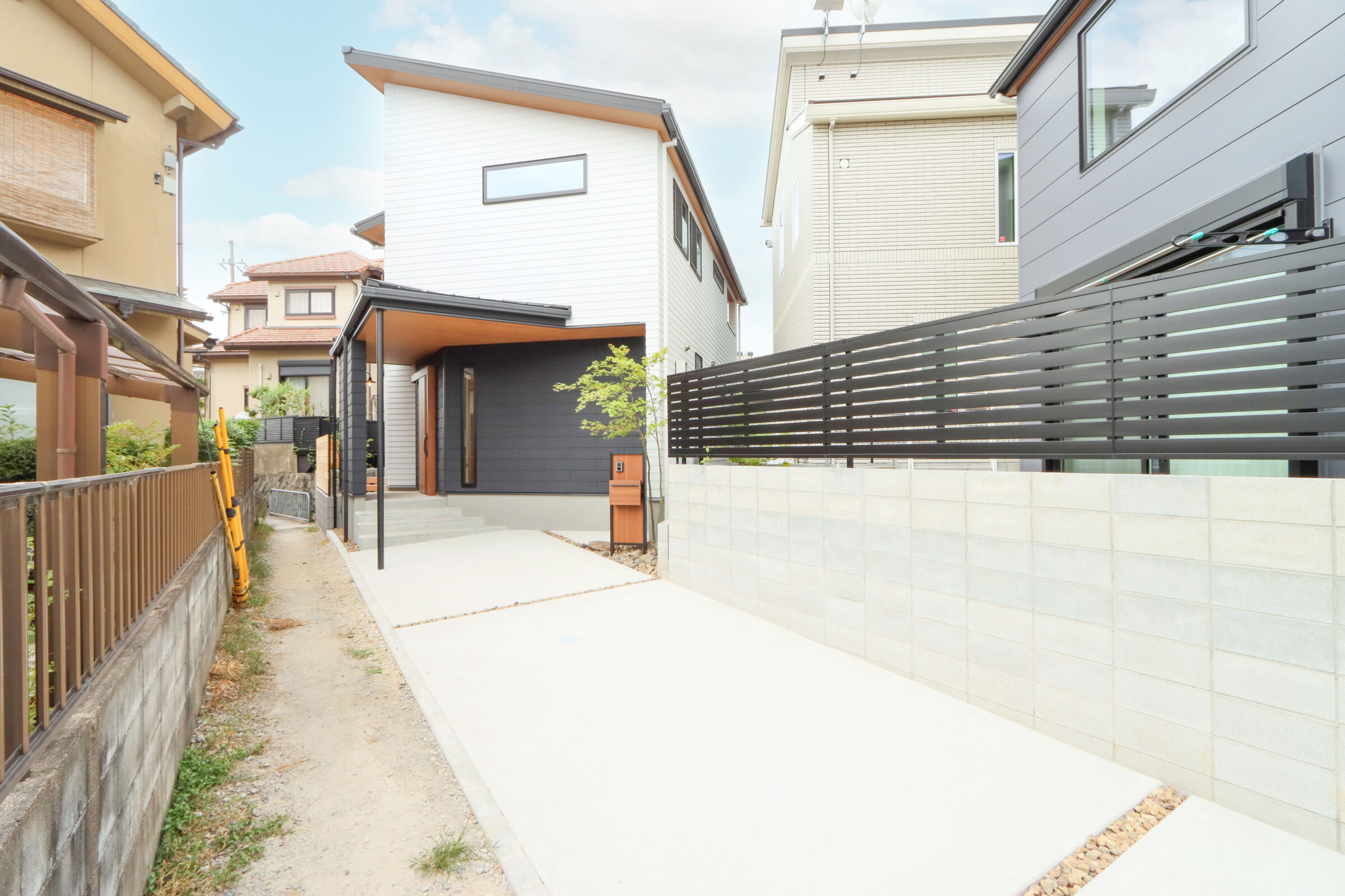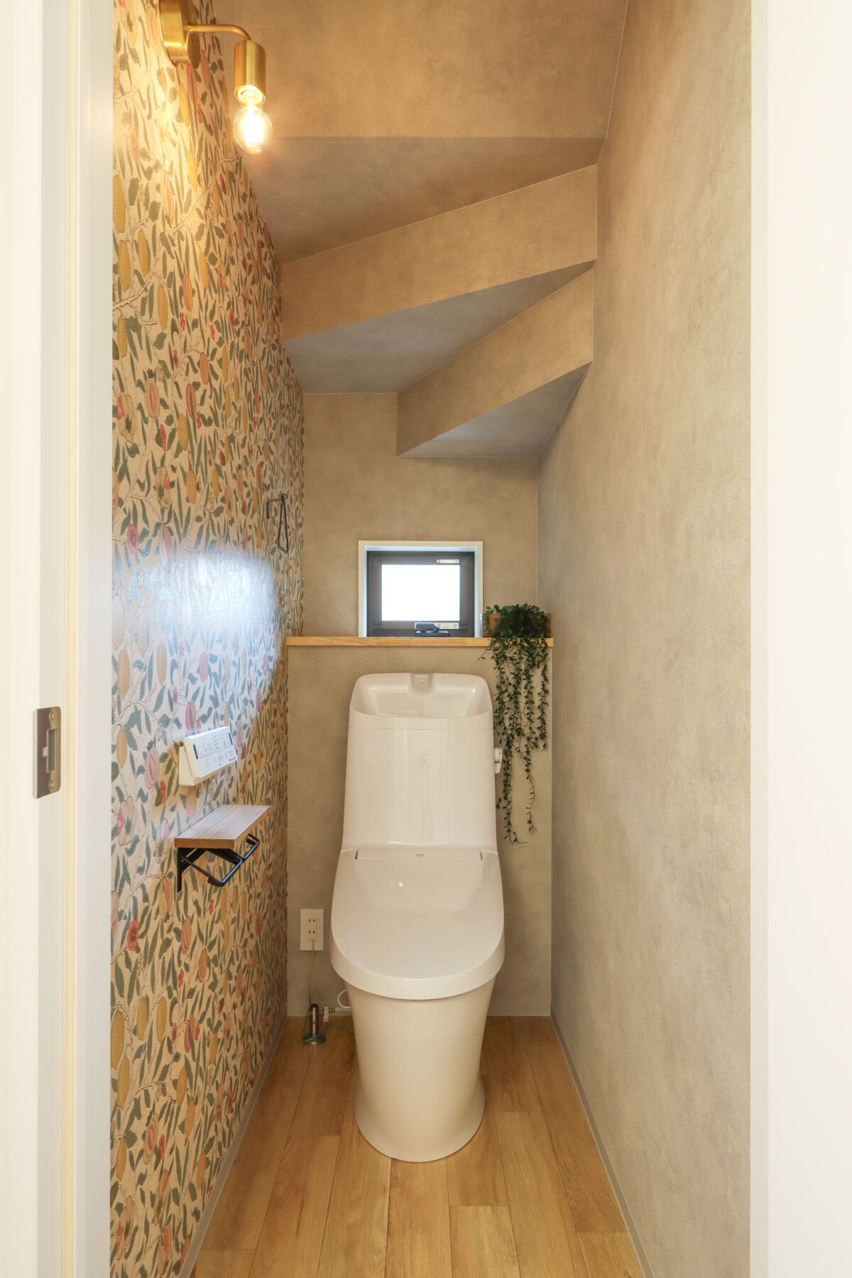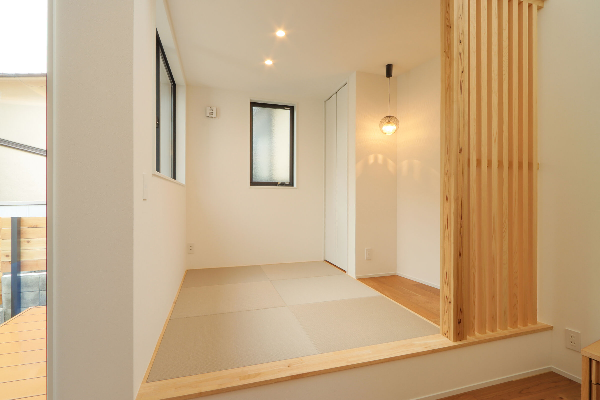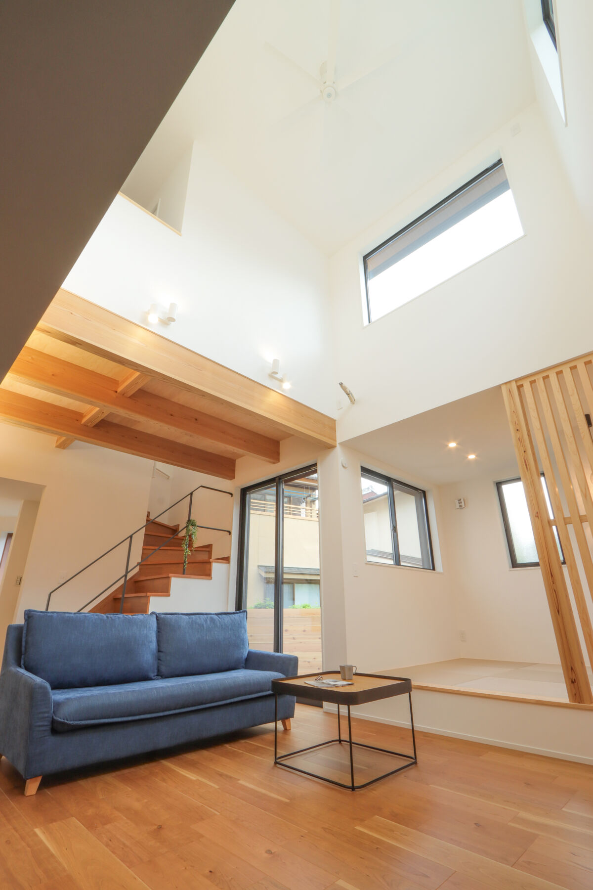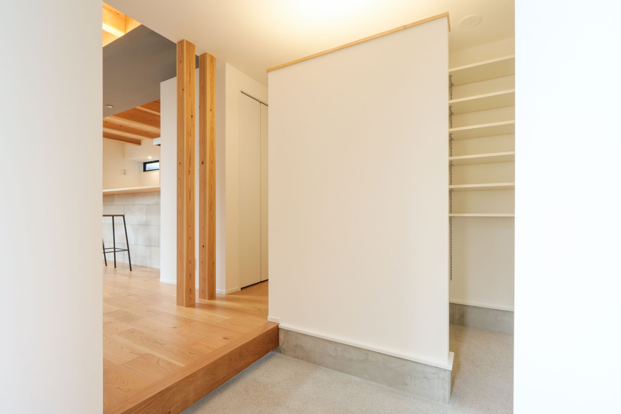 玄関は天井をすっきり見せるため、ダウンライトを使わず間接照明でやわらかな明るさをつくりました。LDKの梁と柱には紀州材を使い、木目の美しさを活かすため無塗装で仕上げています。吹抜けの南側窓から光がたっぷり入り、日中は照明いらずの心地よさに。ガーデンテラスはLDKとつながり、外まで広がるような開放感を楽しめます。キッチン腰壁には明るい色味のタイルを合わせ、空間にほどよいメリハリを。水回りは回遊動線で家事効率があがり、各室のクロスも落ち着きと遊び心をバランスよく取り入れています。