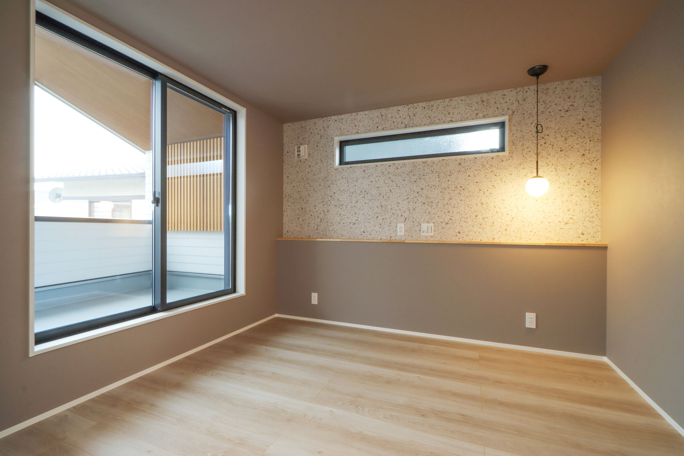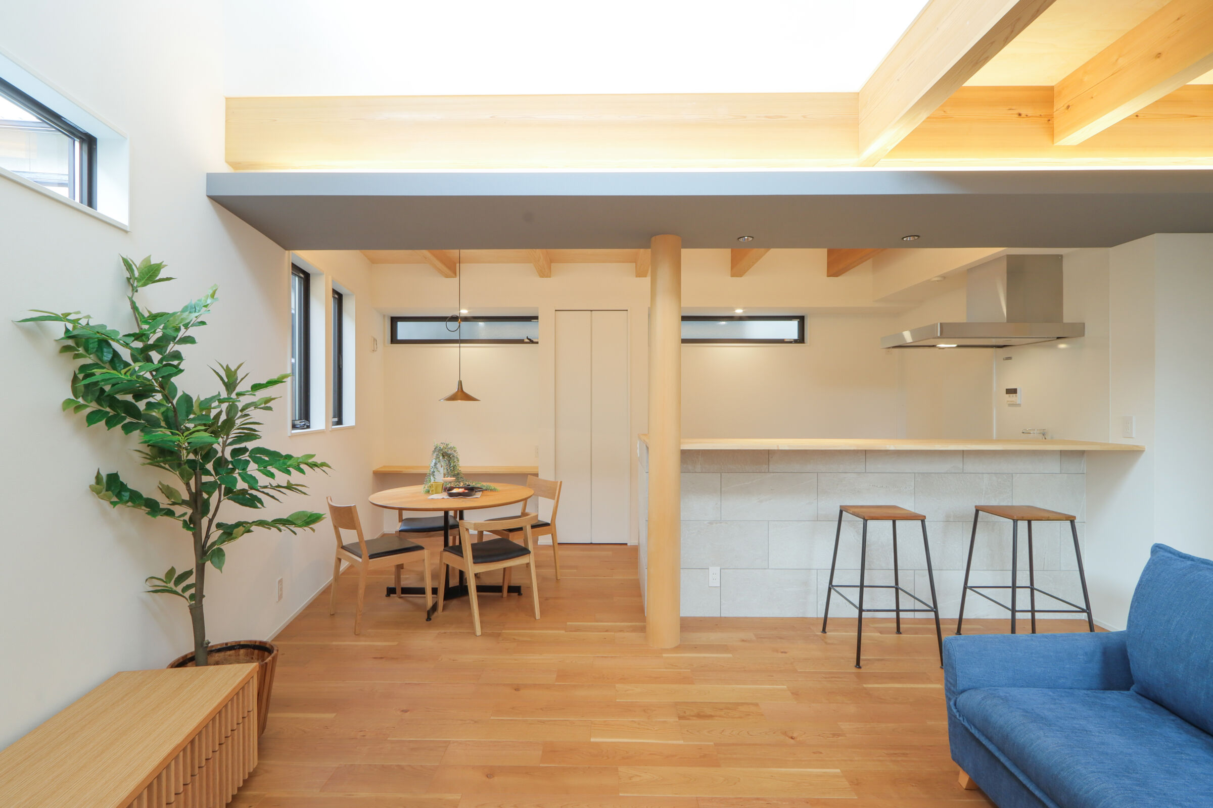 LDKに面している建具と壁のクロスは白で統一し、天井・柱の木の色味やデザイン性のある照明器具が目立つような内観に設計しています。
