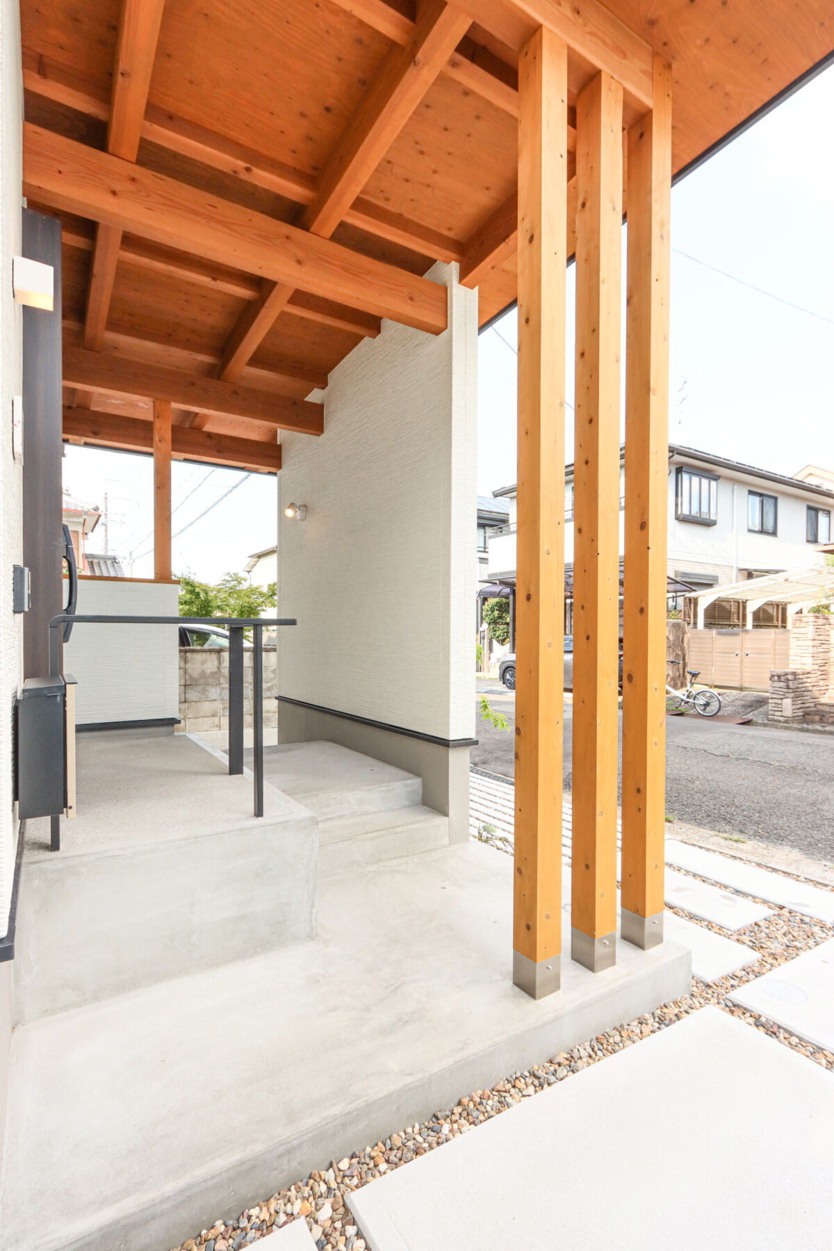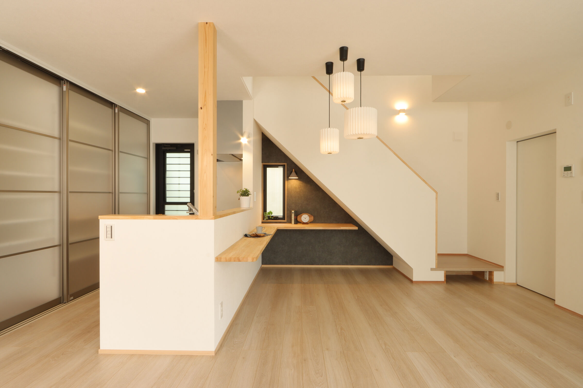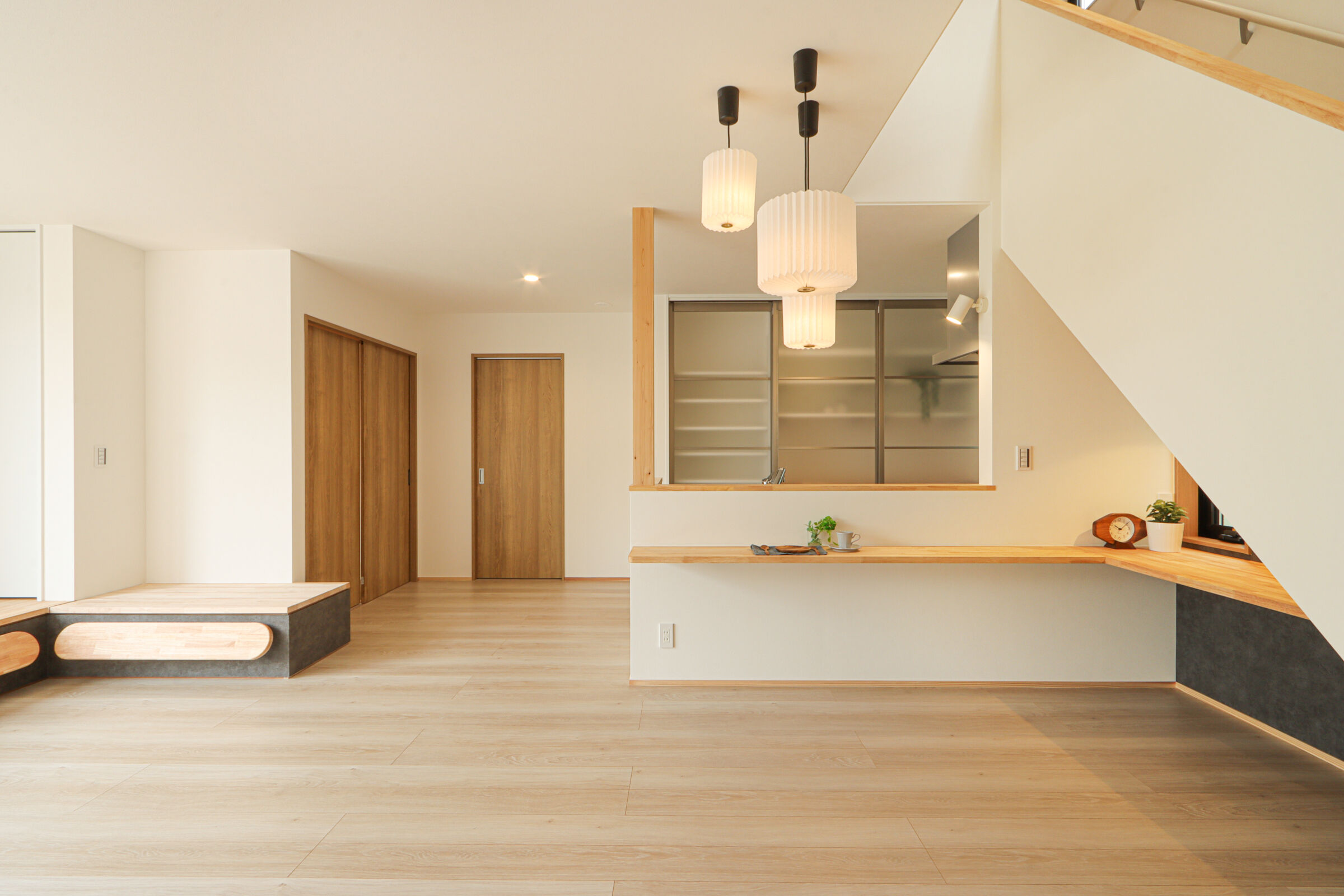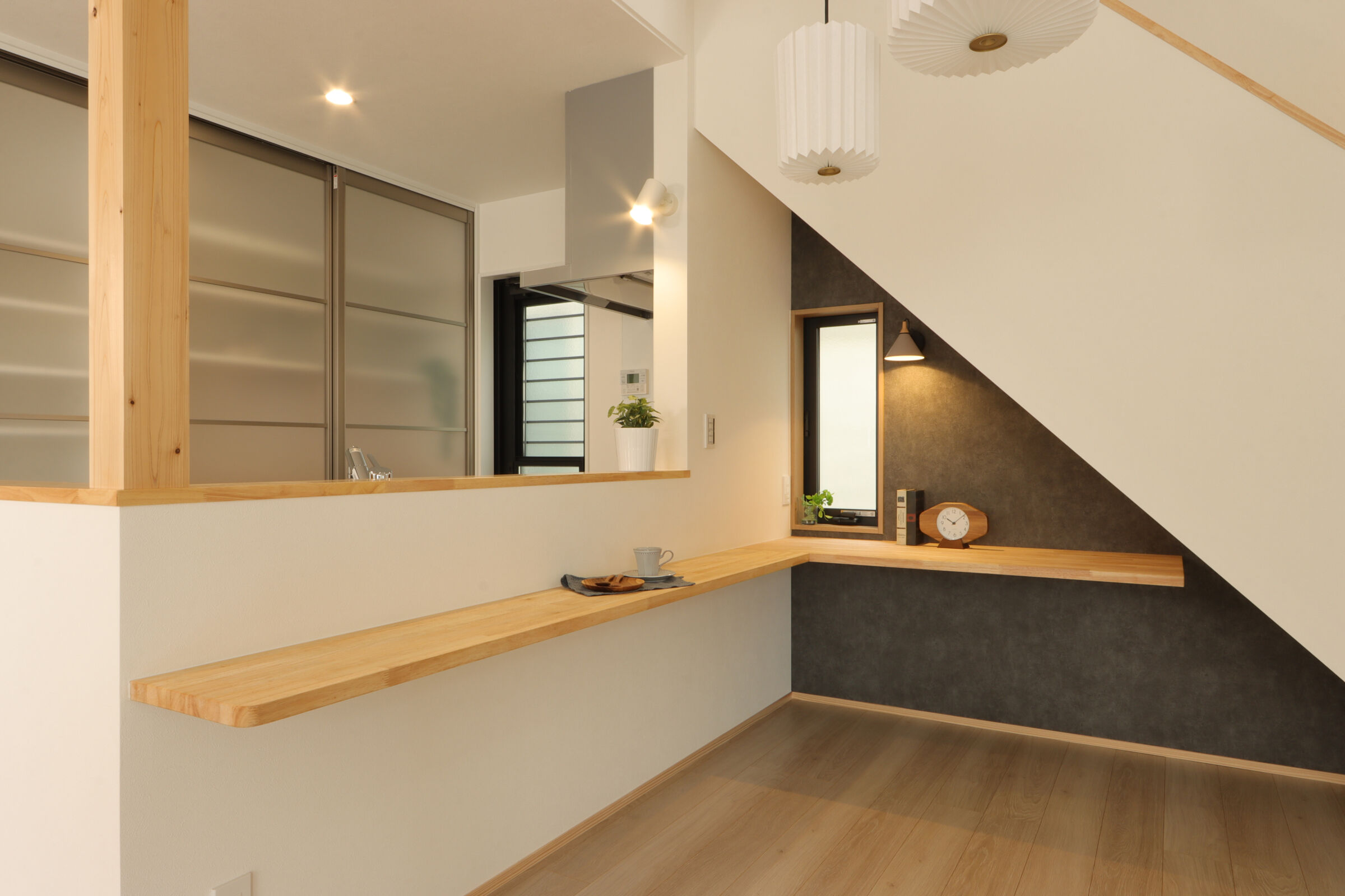 家族の自転車が4台置ける屋根付きの駐輪スペースは、雨に濡れず長く使える便利な場所です。ダイニングには形の異なるペンダントライトを3灯吊るし、空間にほどよいアクセントを加えました。LDKにはオープンな書斎コーナーを設け、お子様のリビング学習にもぴったりです。リビングにはオリジナルのベンチ型家具を設置し、収納も兼ねながら庭の緑を眺めてくつろげる特等席に。キッチン背面は生活感が出やすいものをまとめて収納し、すっきりと快適な空間に。1階のこもり感ある書斎はテレワークに最適で、本棚もオリジナル。2階には遊び心のある書斎コーナーも設計し、お子様のお部屋はお気に入りのクロスで彩られました。雨のかからない大きなバルコニーでは、べランピングも楽しめます。