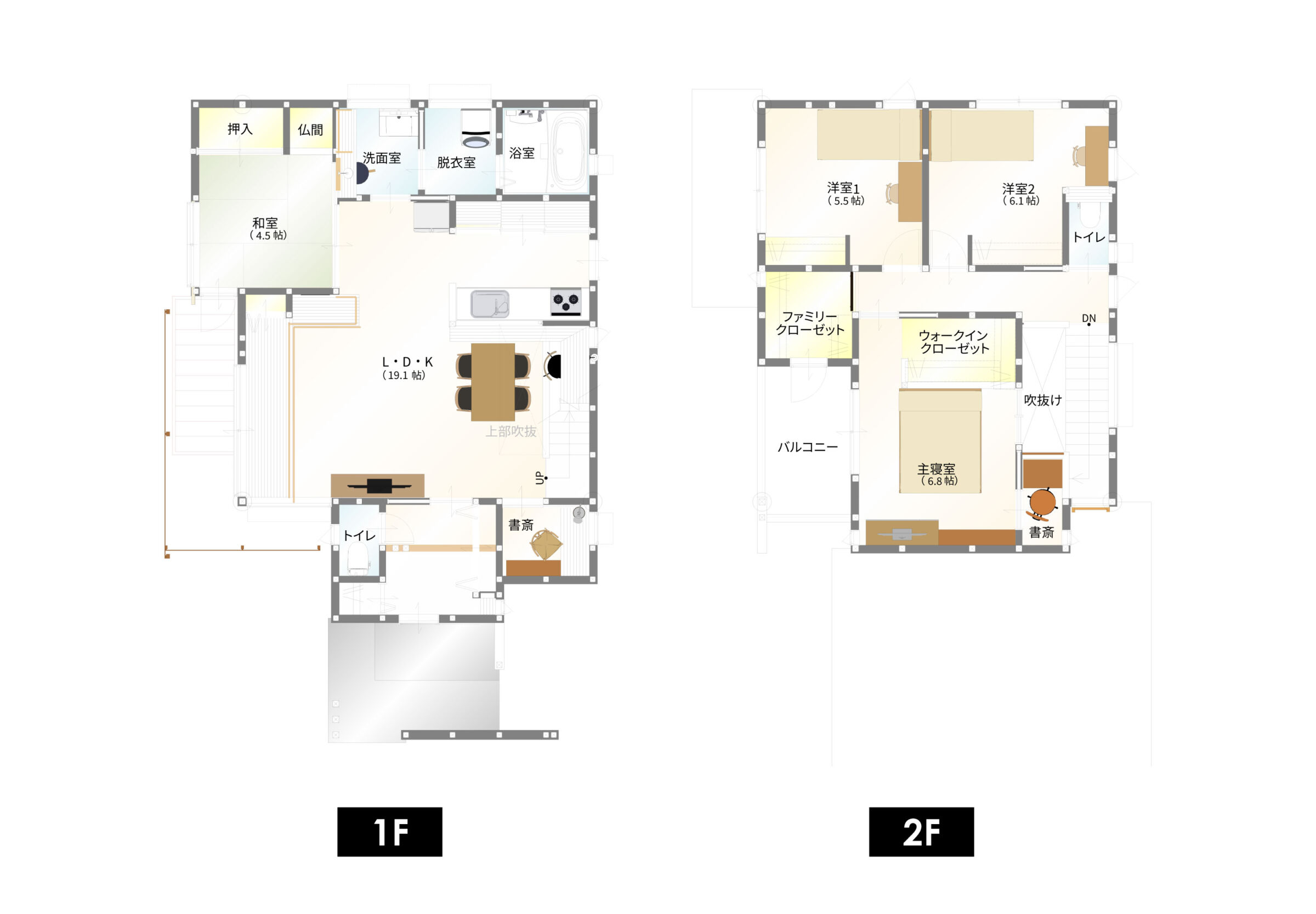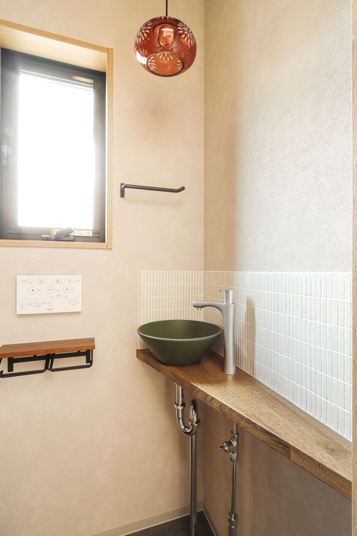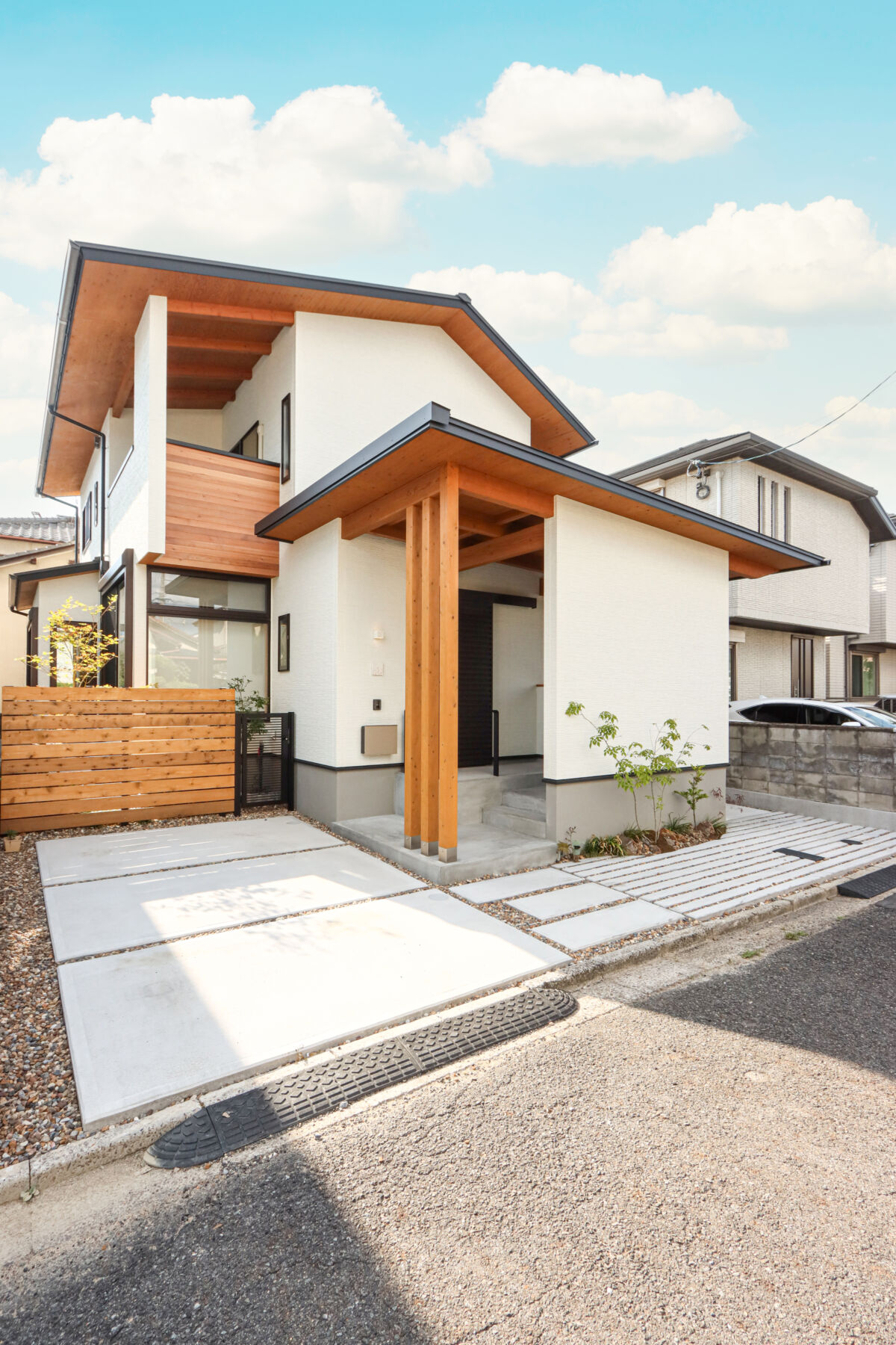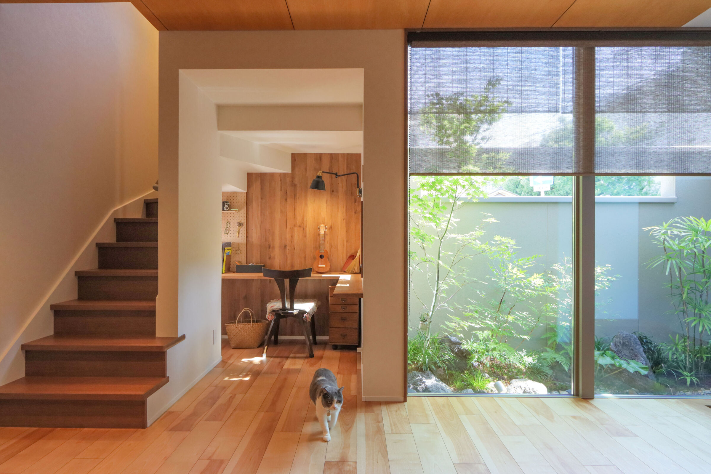 家族の自転車が4台置ける屋根付きの駐輪スペースは、雨に濡れず長く使える便利な場所です。ダイニングには形の異なるペンダントライトを3灯吊るし、空間にほどよいアクセントを加えました。LDKにはオープンな書斎コーナーを設け、お子様のリビング学習にもぴったりです。リビングにはオリジナルのベンチ型家具を設置し、収納も兼ねながら庭の緑を眺めてくつろげる特等席に。キッチン背面は生活感が出やすいものをまとめて収納し、すっきりと快適な空間に。1階のこもり感ある書斎はテレワークに最適で、本棚もオリジナル。2階には遊び心のある書斎コーナーも設計し、お子様のお部屋はお気に入りのクロスで彩られました。雨のかからない大きなバルコニーでは、べランピングも楽しめます。