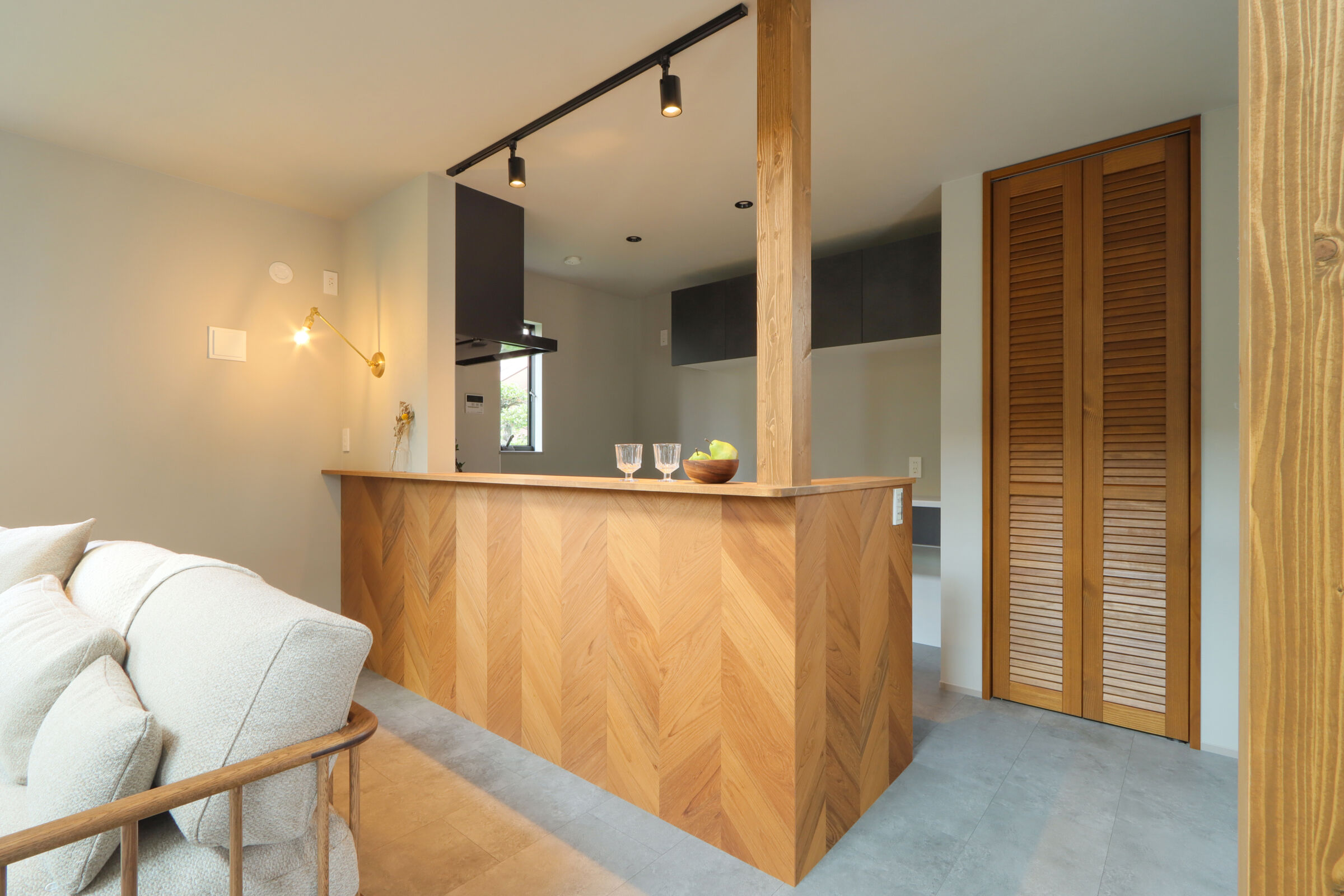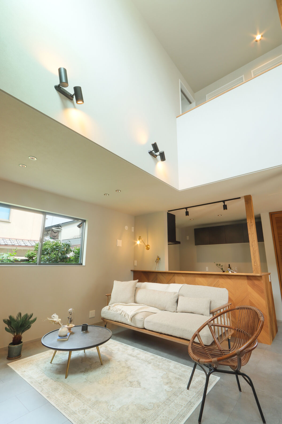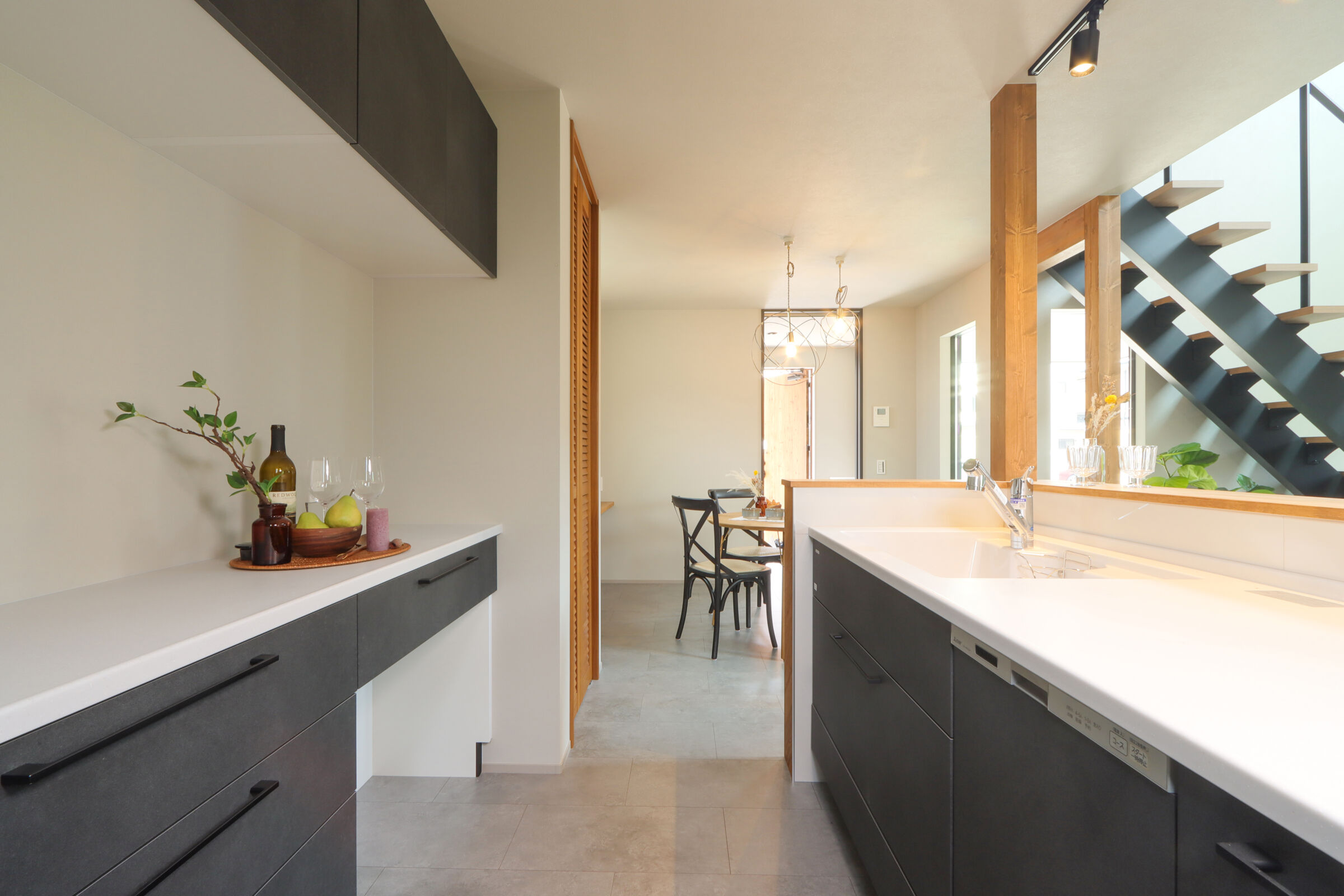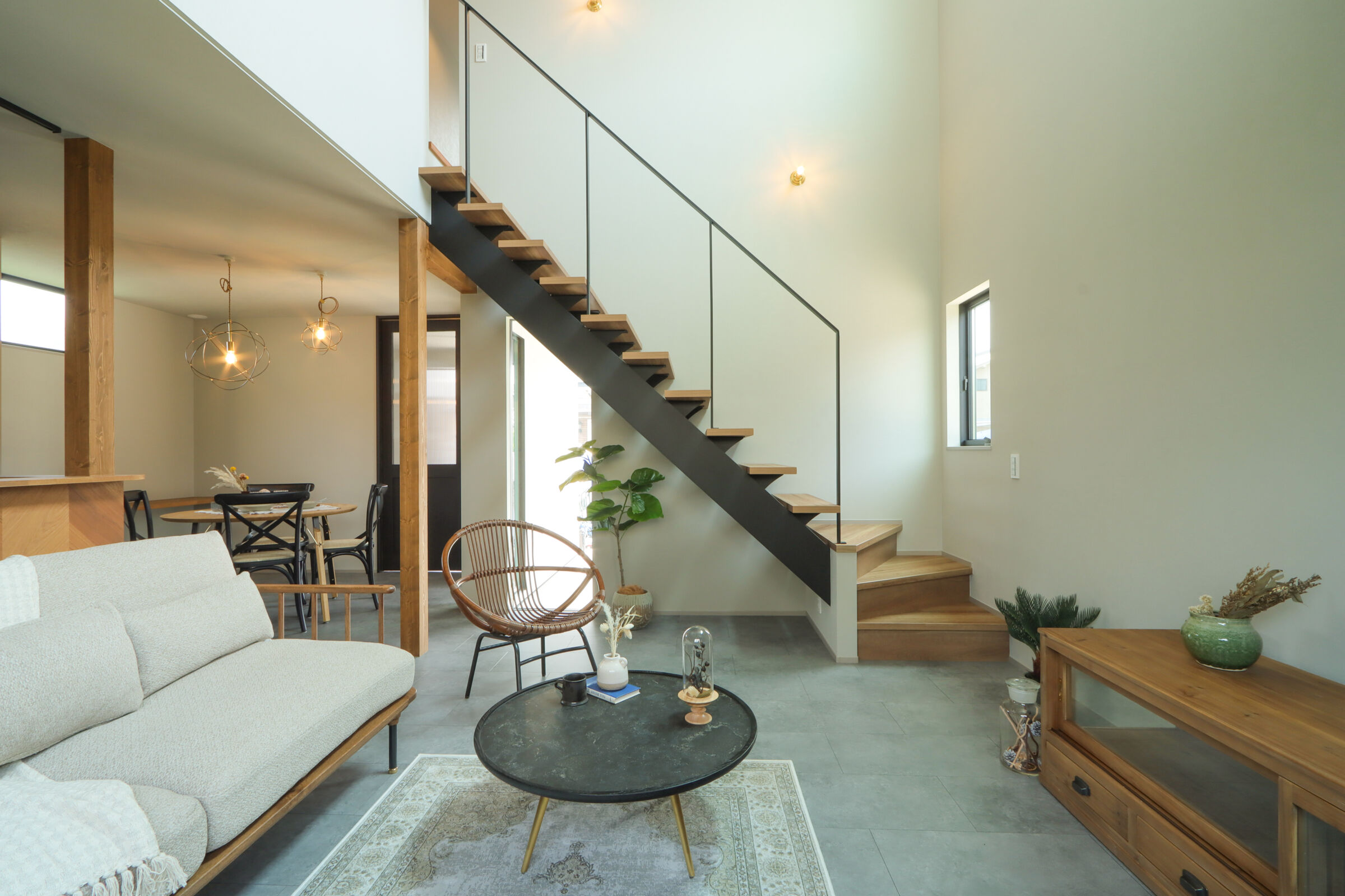 9.7帖のLDKは吹抜けが心地よく、自然光が階段からふんわり差し込む明るい空間に仕上げました。ダイニング横にはお子様の宿題や在宅ワークに使えるスタディカウンターを設置。家具はCRASH GATEでそろえ、木の風合いがやさしく室内になじみます。キッチンはヘリンボーンの腰壁がアクセント。パントリーも隣に配置し、使い勝手も◎新作のラフモルタルフローリングが空間に程よいクールさを添えています。2FのWICはバルコニー近くに設け、洗濯動線がスムーズになるよう工夫しました。
