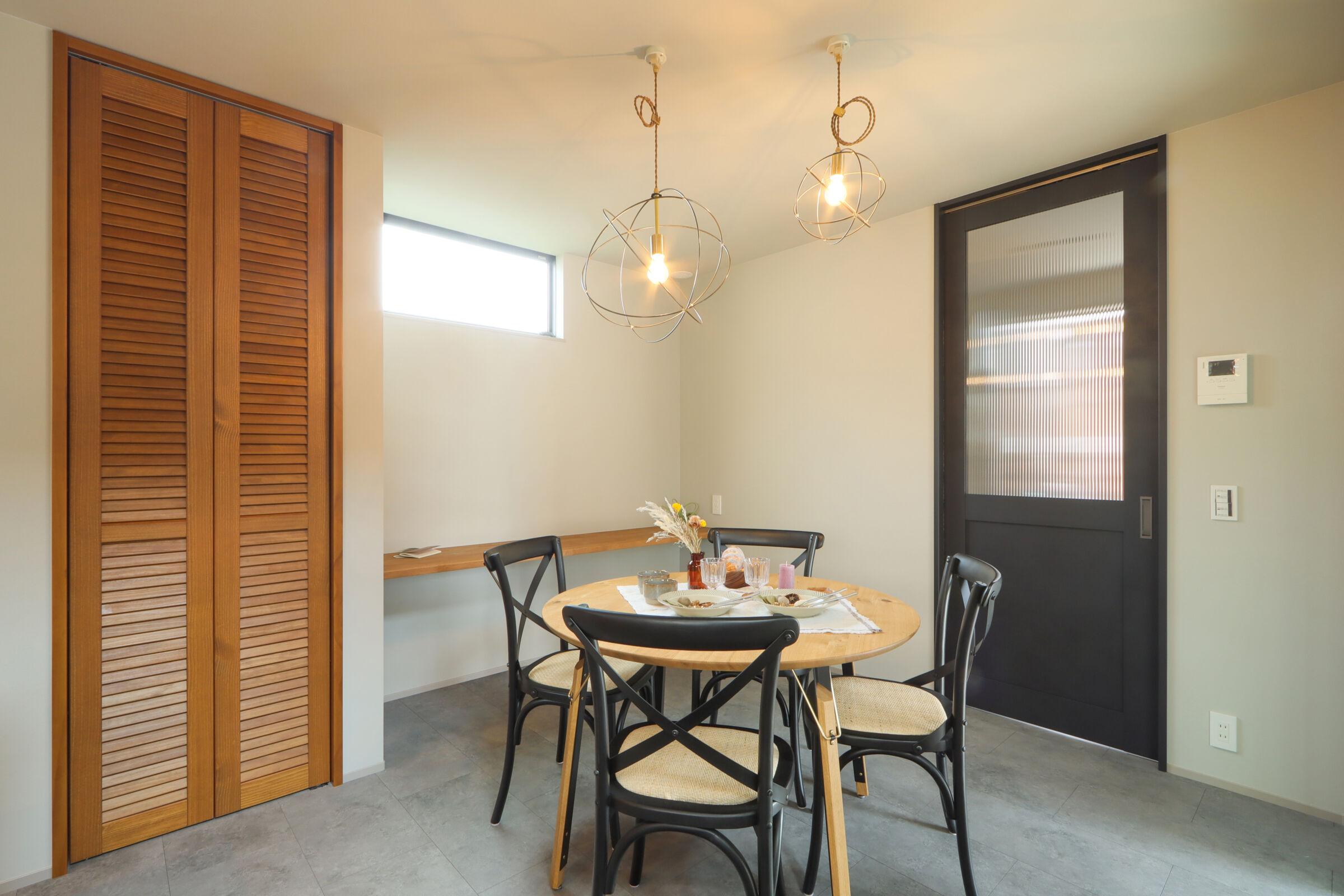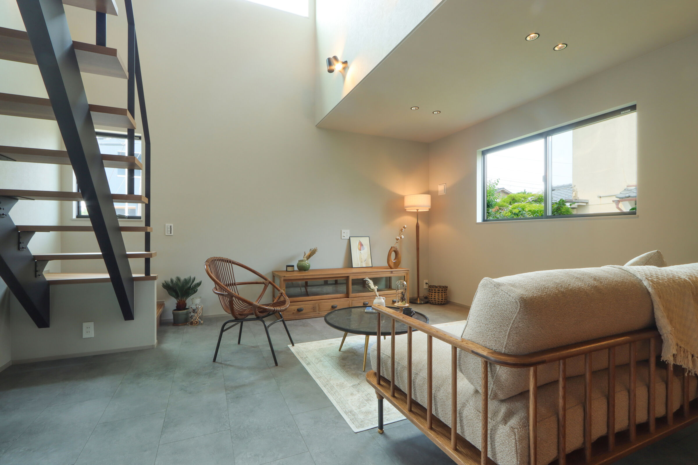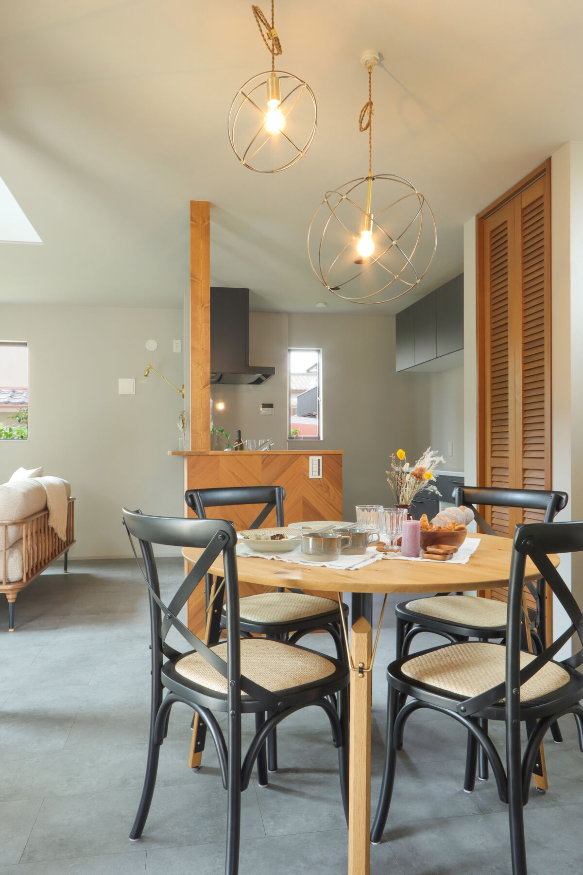 9.7帖のLDKは吹抜けが心地よく、自然光が階段からふんわり差し込む明るい空間に仕上げました。ダイニング横にはお子様の宿題や在宅ワークに使えるスタディカウンターを設置。家具はCRASH GATEでそろえ、木の風合いがやさしく室内になじみます。キッチンはヘリンボーンの腰壁がアクセント。パントリーも隣に配置し、使い勝手も◎新作のラフモルタルフローリングが空間に程よいクールさを添えています。2FのWICはバルコニー近くに設け、洗濯動線がスムーズになるよう工夫しました。