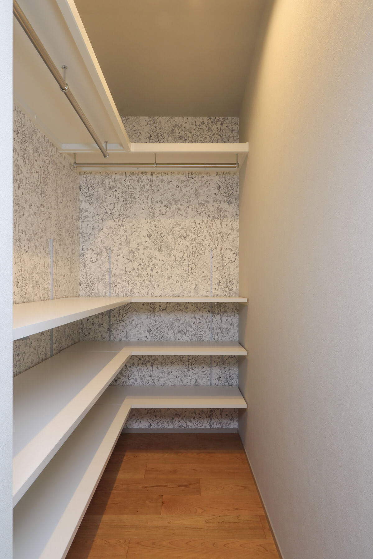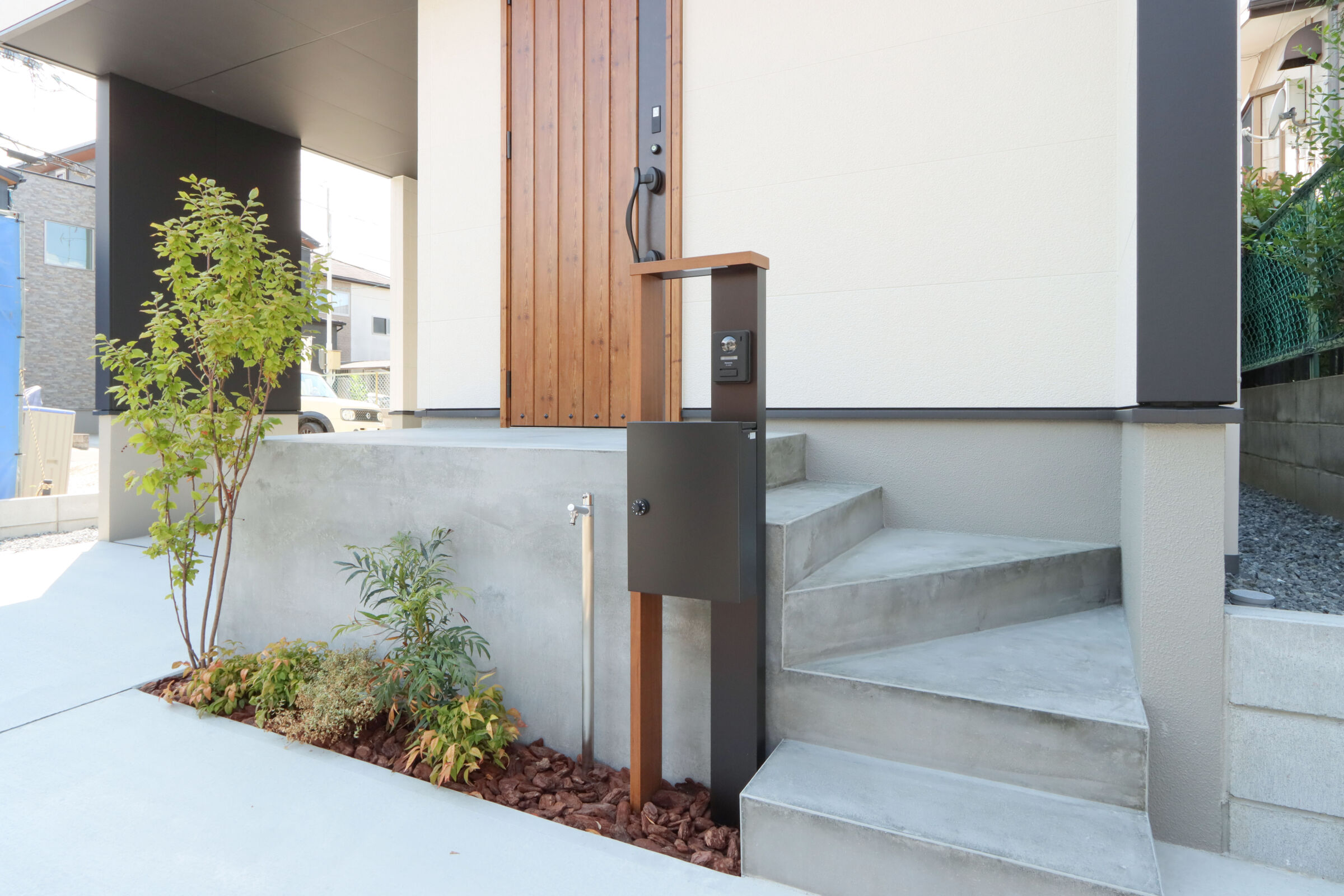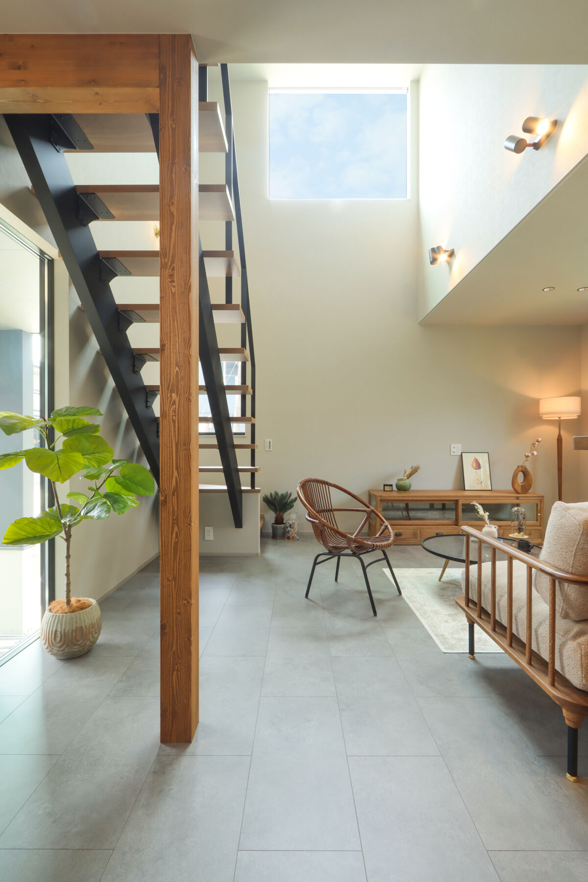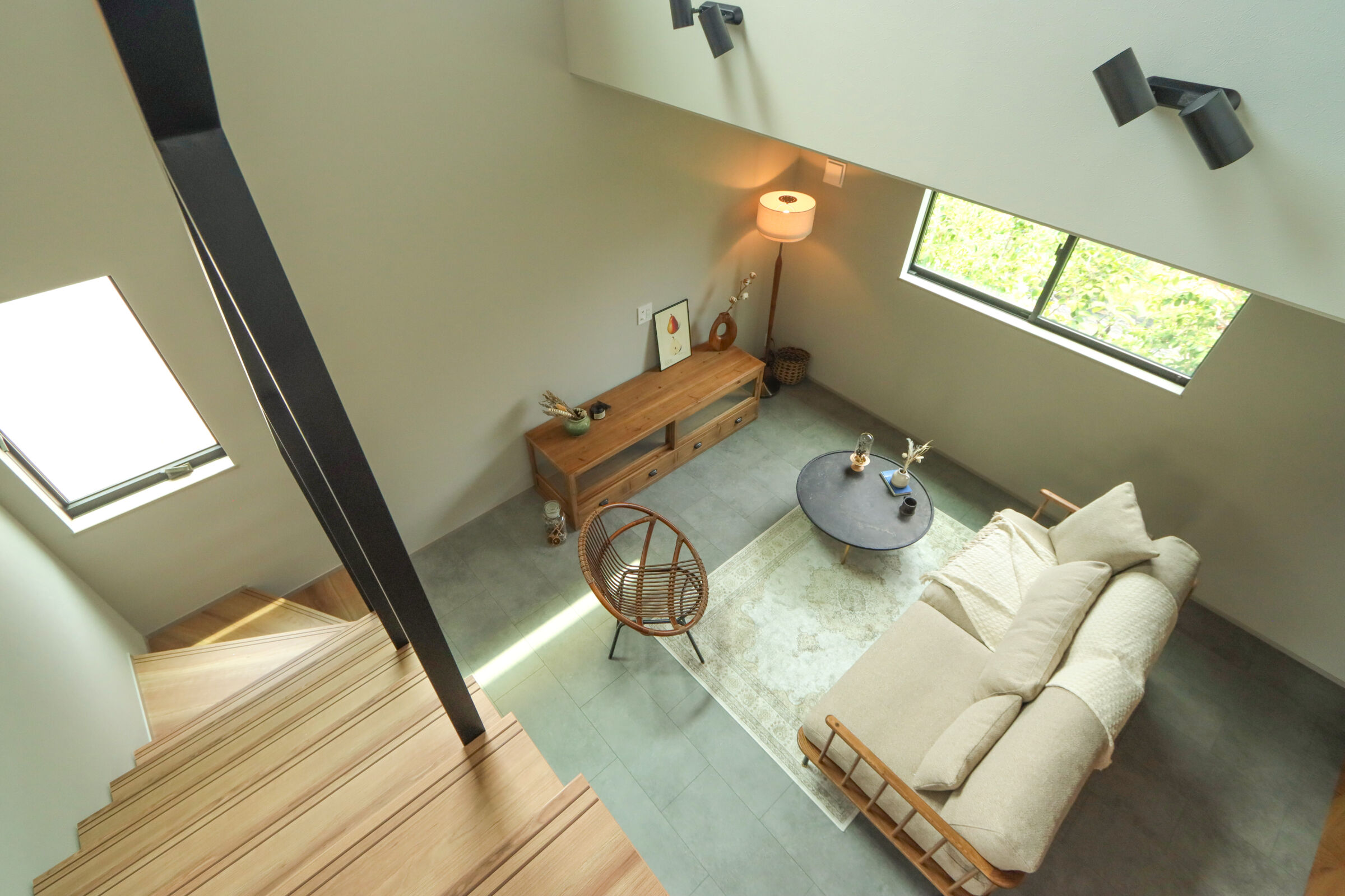 9.7帖のLDKは吹抜けが心地よく、自然光が階段からふんわり差し込む明るい空間に仕上げました。ダイニング横にはお子様の宿題や在宅ワークに使えるスタディカウンターを設置。家具はCRASH GATEでそろえ、木の風合いがやさしく室内になじみます。キッチンはヘリンボーンの腰壁がアクセント。パントリーも隣に配置し、使い勝手も◎新作のラフモルタルフローリングが空間に程よいクールさを添えています。2FのWICはバルコニー近くに設け、洗濯動線がスムーズになるよう工夫しました。