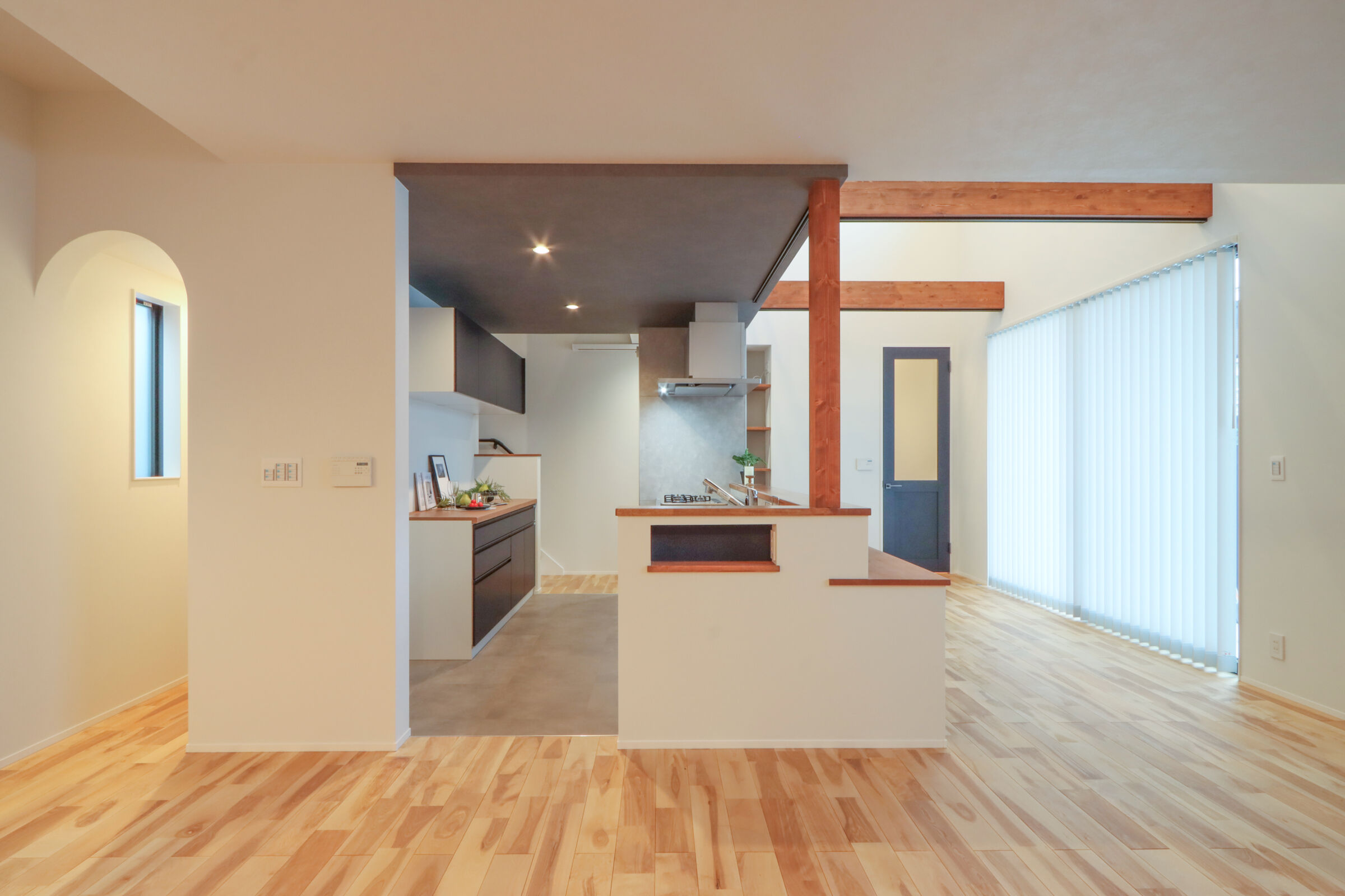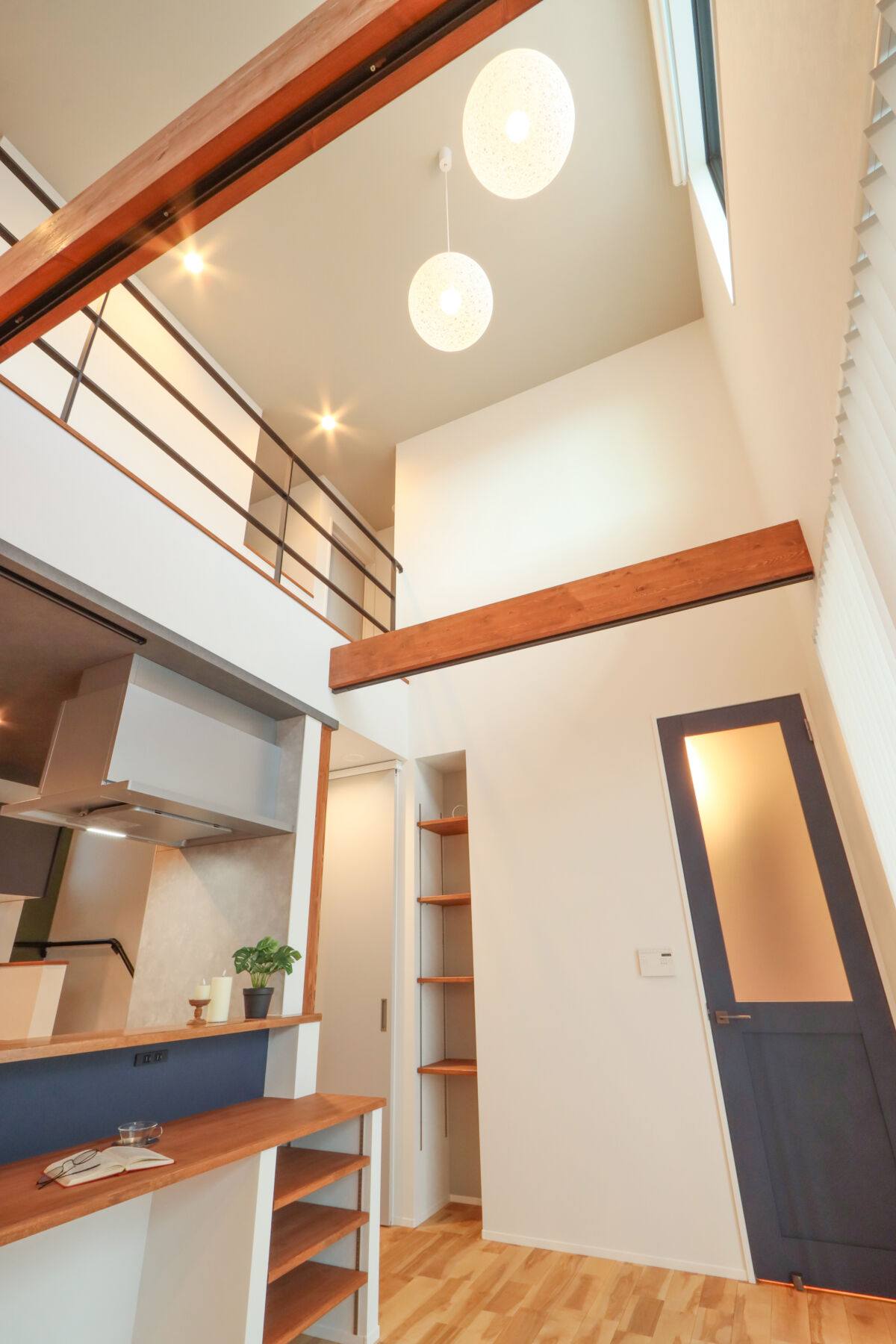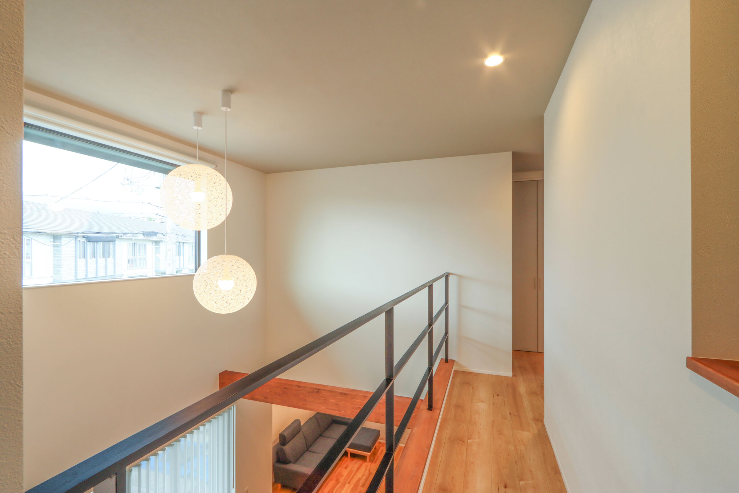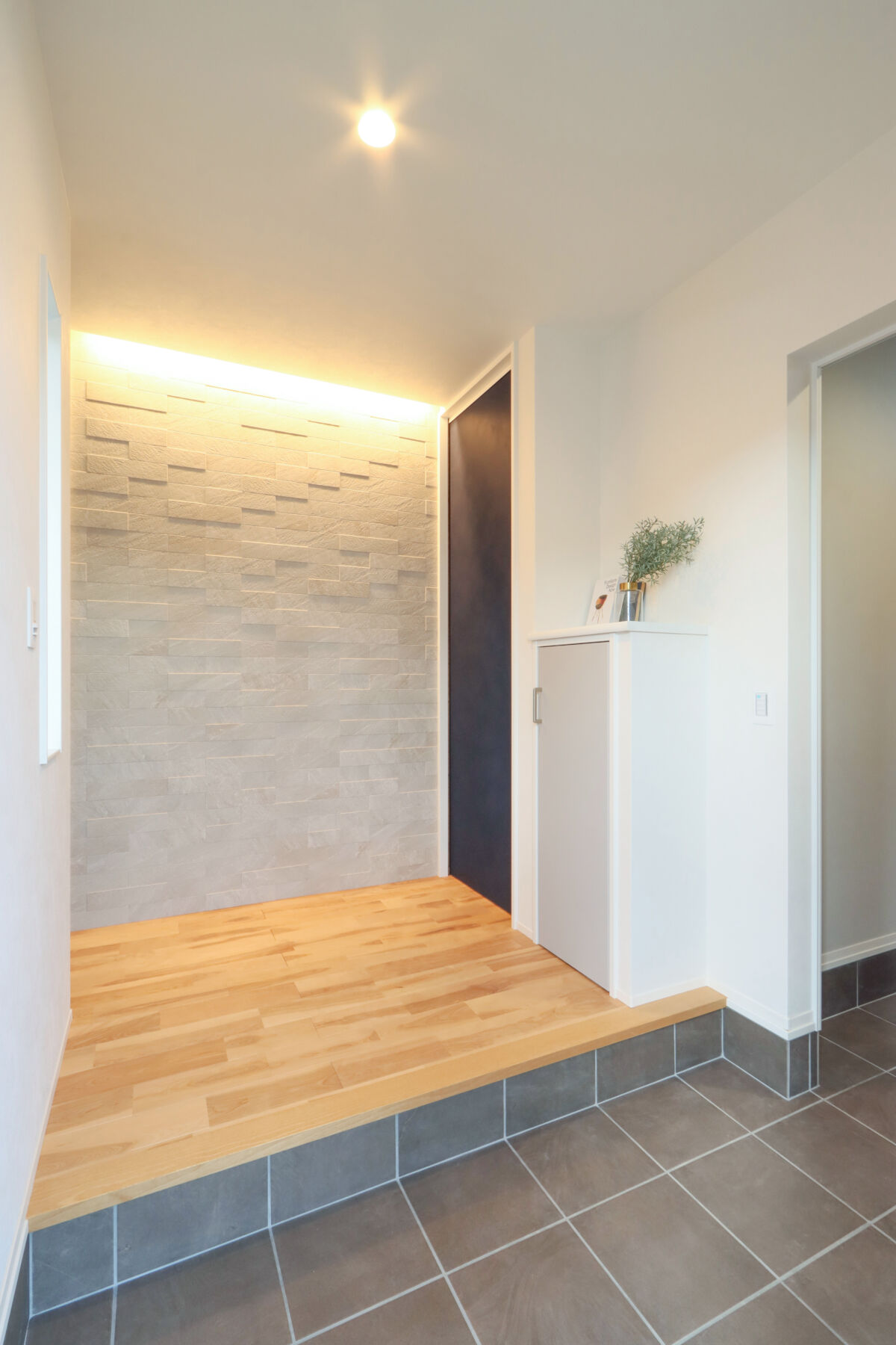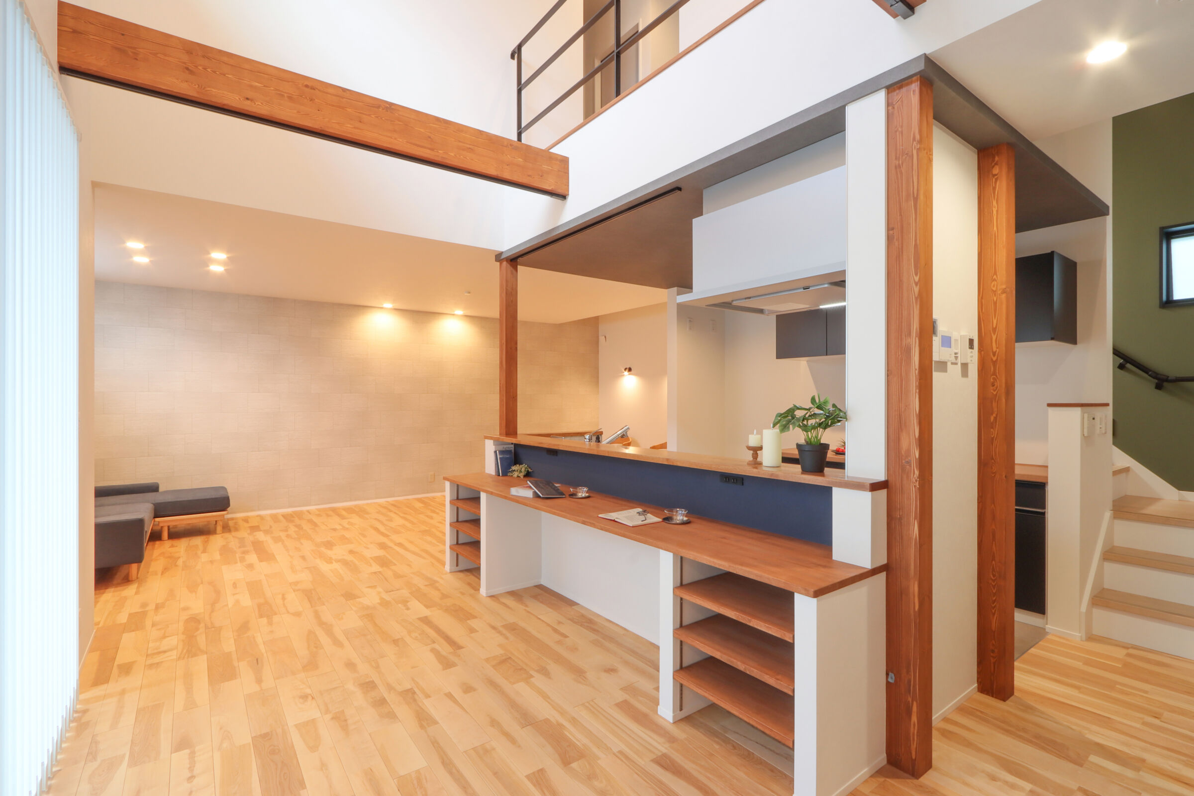 外観は大きくかけた下屋にレッドシダー調の軒天をあしらい、ほどよいあたたかみを添えています。玄関正面にはエコカラットを一面に施し、間接照明でふんわりと照らすことで上品なアクセントに。LDKの中心には造作のスタディカウンターを設け、ご家族が自然と集まれる場所になりました。大きな吹抜けは1階も2階ホールも明るく開放的にしてくれます。キッチンはステンレスのバイブレーション仕上げでスタイリッシュに。回遊できる動線や、洗濯から収納まで完結するランドリーなど、毎日の家事がスムーズになる工夫を随所に。2ボウルの洗面や、こもれる書斎スペースなど快適に暮らす工夫も詰め込んだ住まいです。