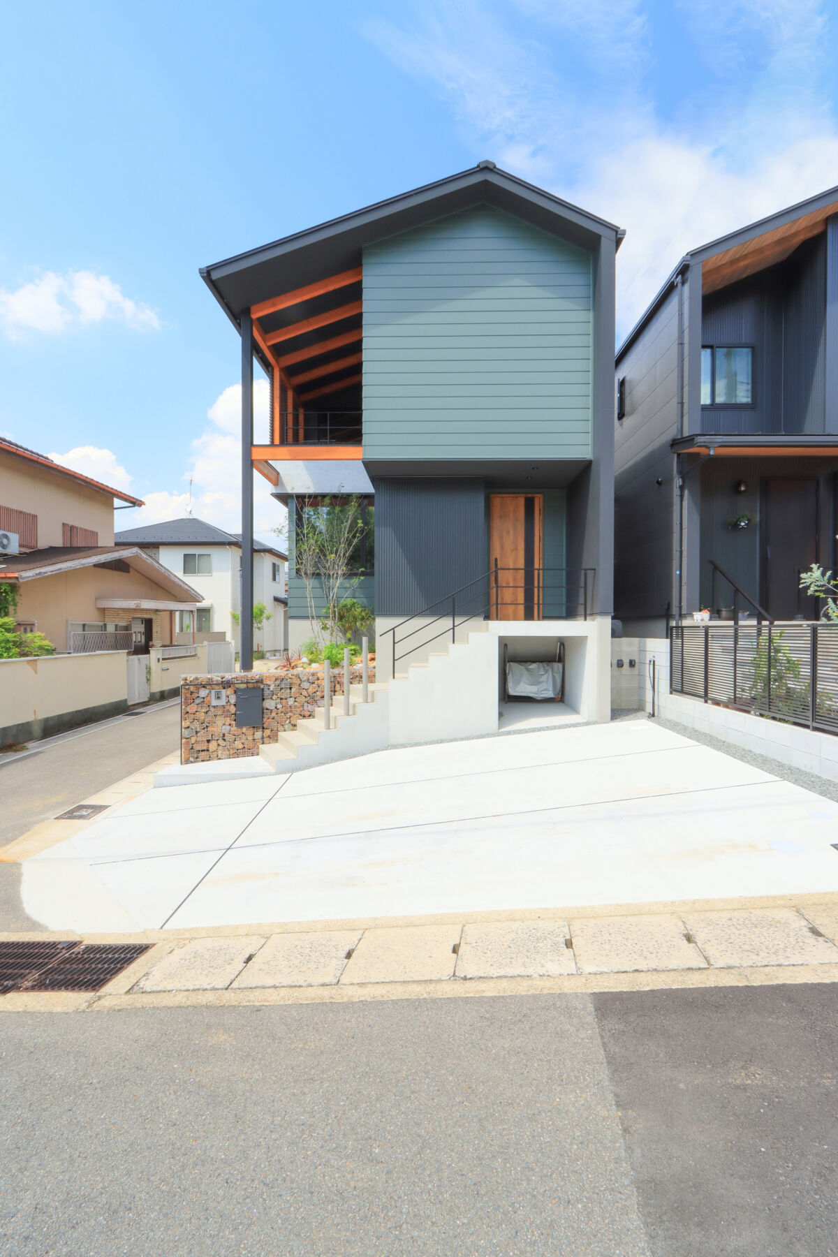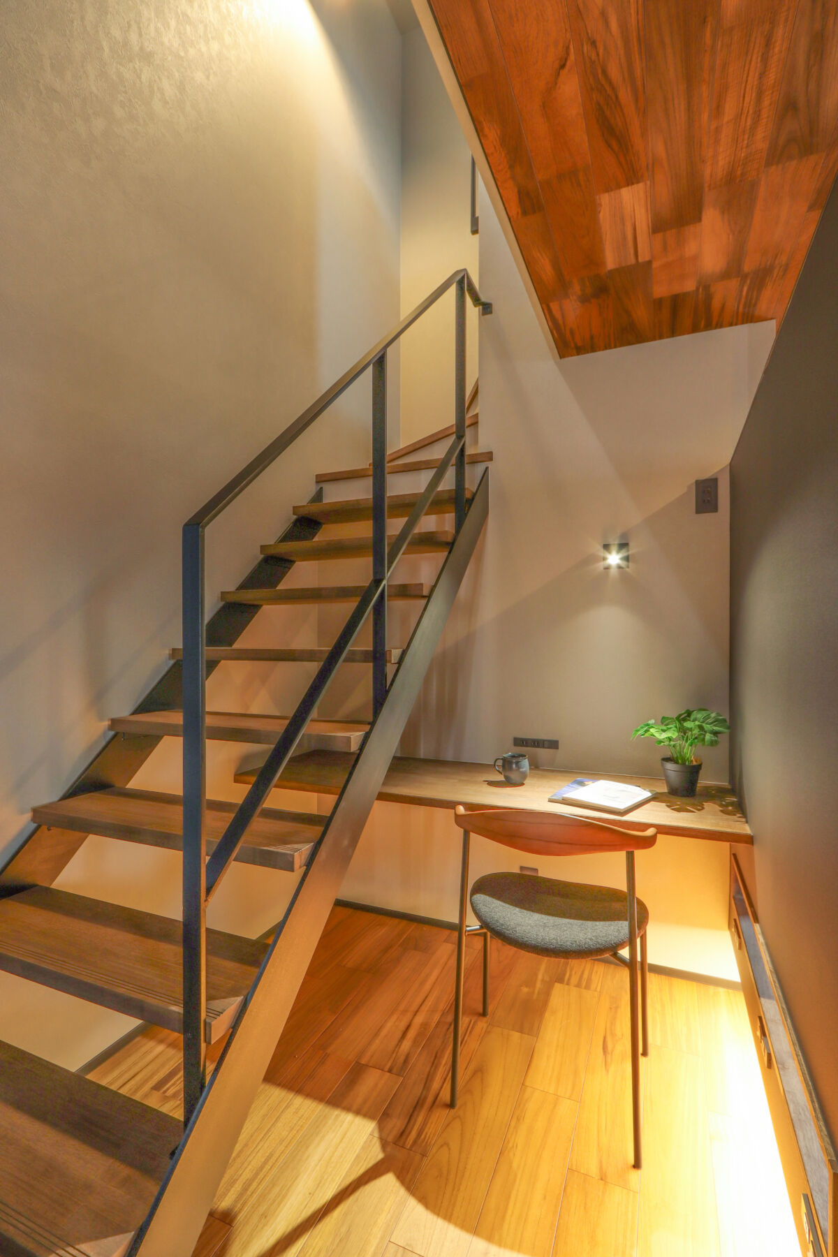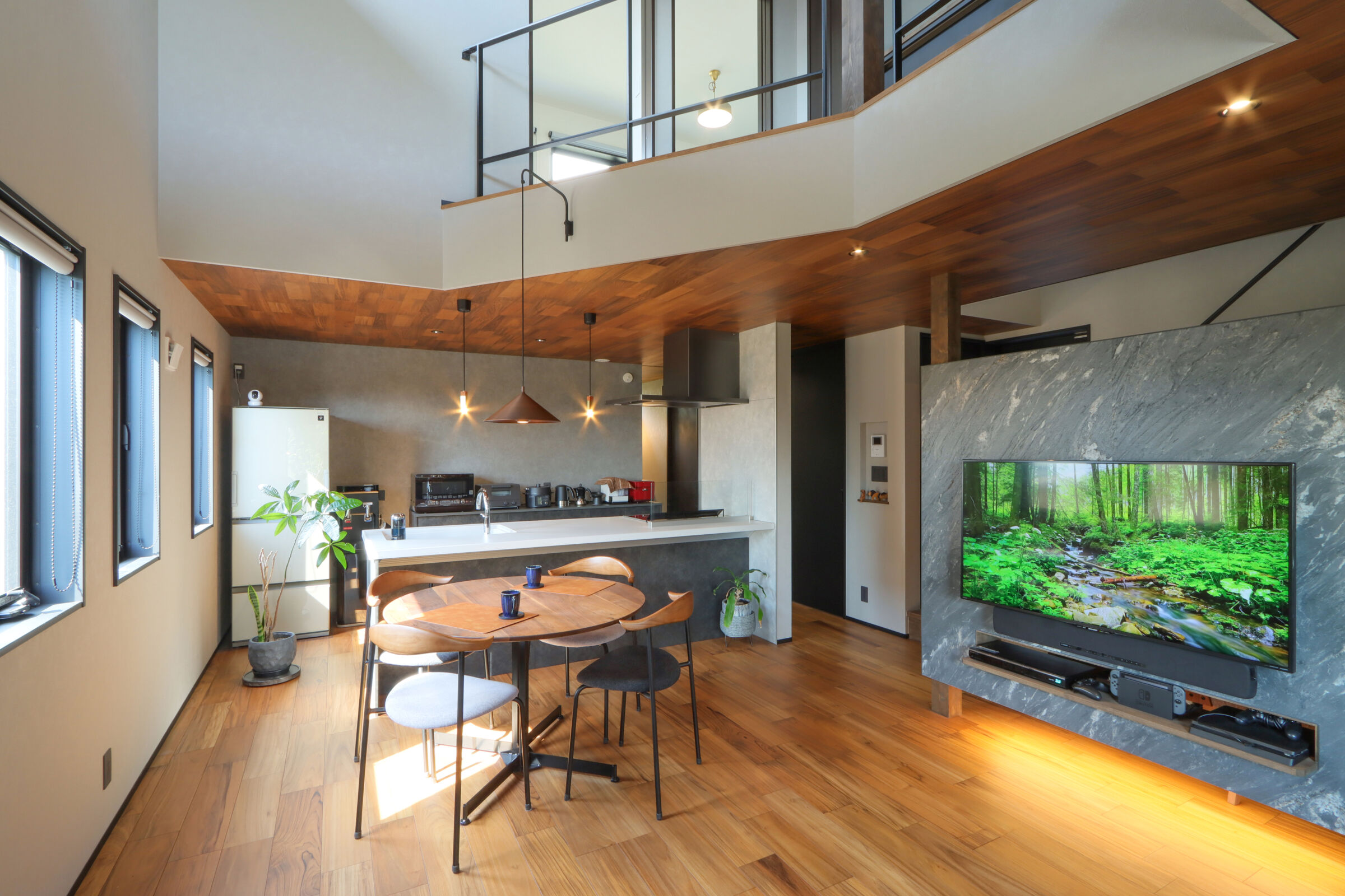 外観は屋根に囲まれた袖壁デザインで、金属材の表情や自然石を用いたアプローチが周囲の景観に馴染むように仕上げました。室内には天然木の天井をあしらい、窓からは四季を映すアオダモが望めます。リビングの造作TV壁やデスクコーナーは素材や機能性にこだわり、過ごし方に合わせた空間に。照明や洗面・タイルにも上質な素材を採用し、2階には室内干しスペースや木格子のバルコニーなど、暮らしを快適にする工夫を盛り込みました。