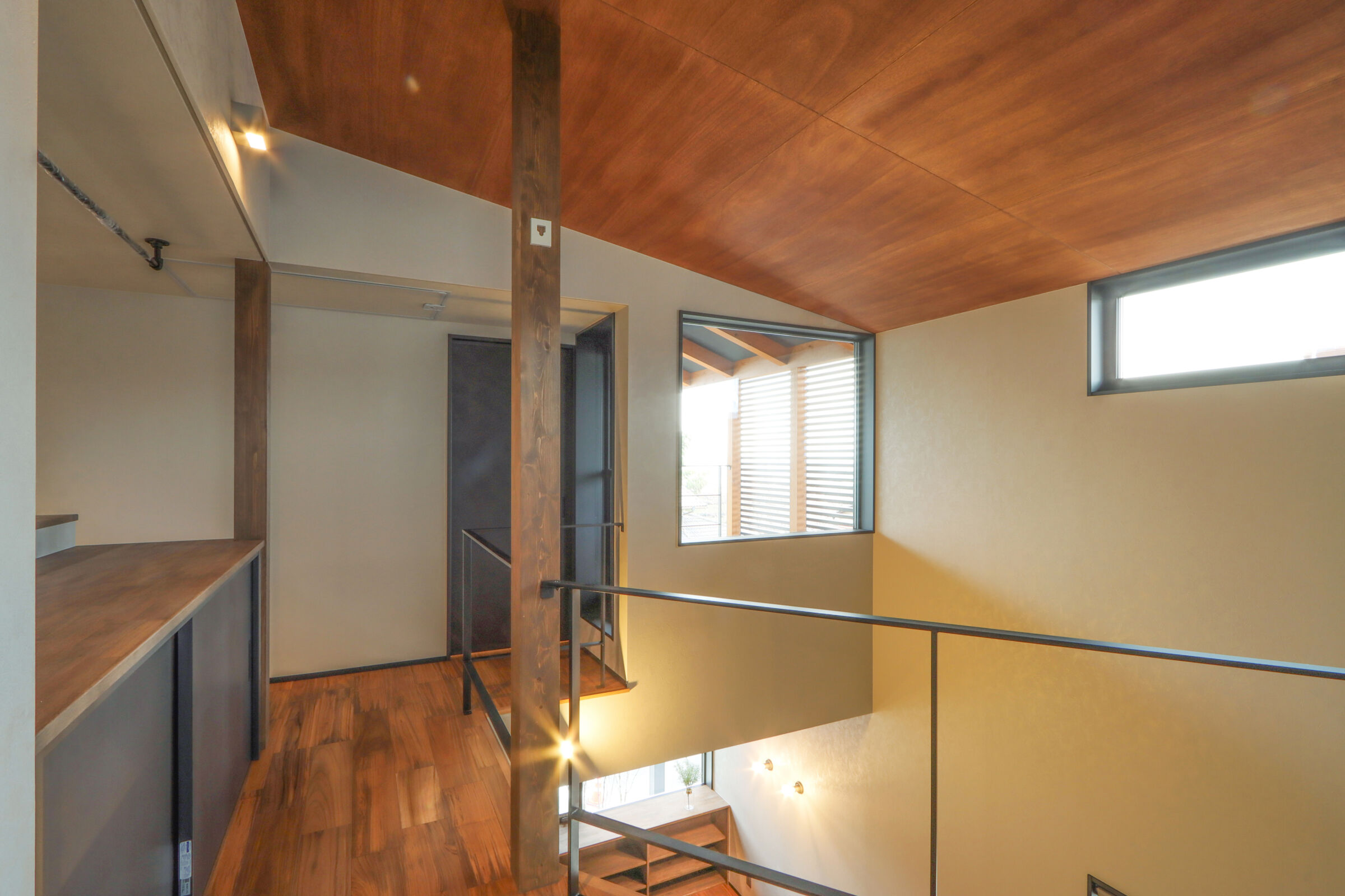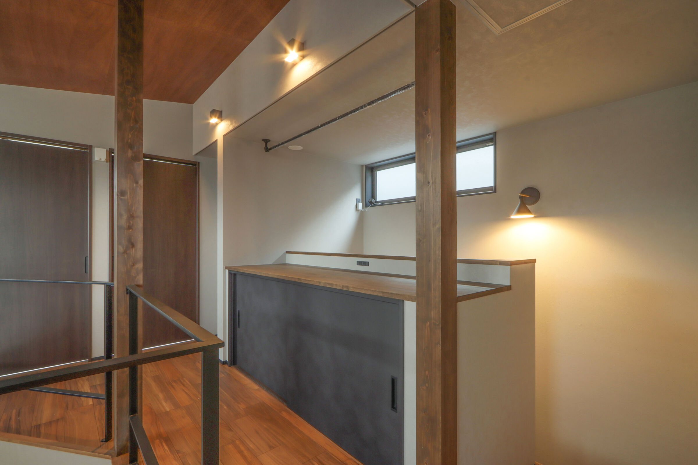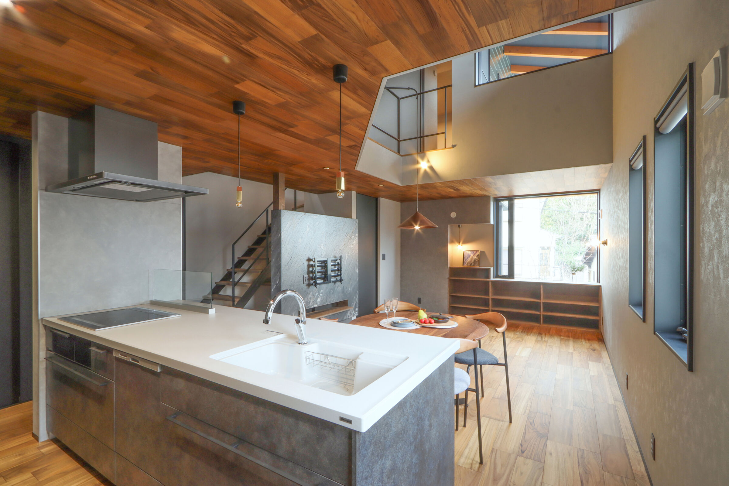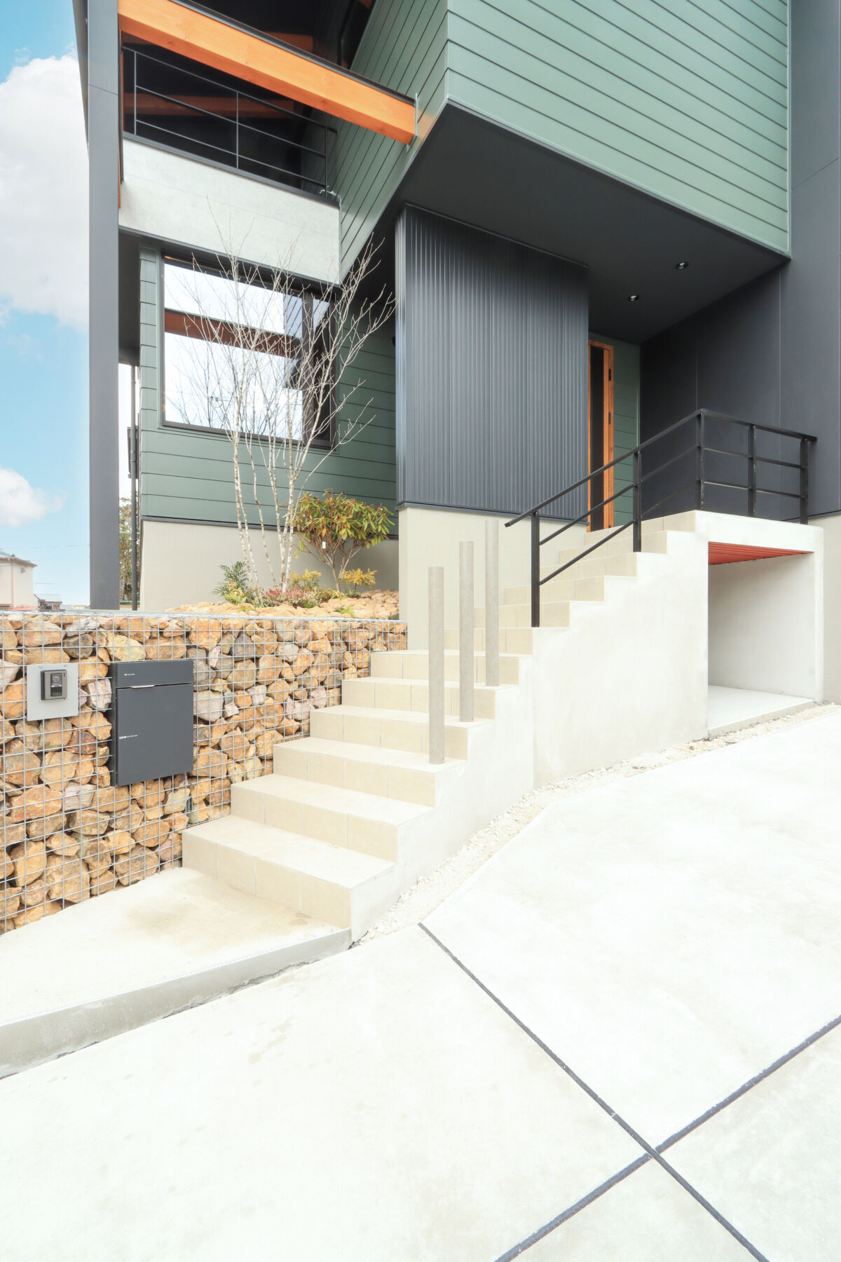 外観は屋根に囲まれた袖壁デザインで、金属材の表情や自然石を用いたアプローチが周囲の景観に馴染むように仕上げました。室内には天然木の天井をあしらい、窓からは四季を映すアオダモが望めます。リビングの造作TV壁やデスクコーナーは素材や機能性にこだわり、過ごし方に合わせた空間に。照明や洗面・タイルにも上質な素材を採用し、2階には室内干しスペースや木格子のバルコニーなど、暮らしを快適にする工夫を盛り込みました。